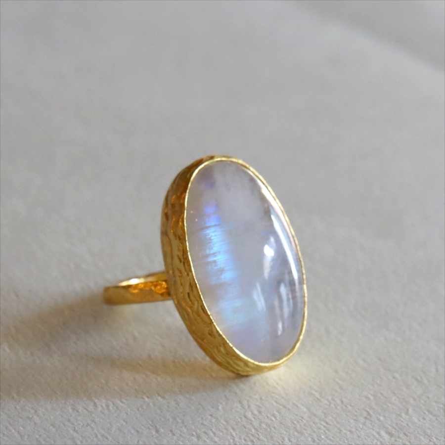 乳白色の大粒の石に幻想的な青みあるシラー(虹色の輝き)が美しい、存在感のあるリングです。ぽってりとボリューム感あるムーンストーンは艶やかで上品な印象です。