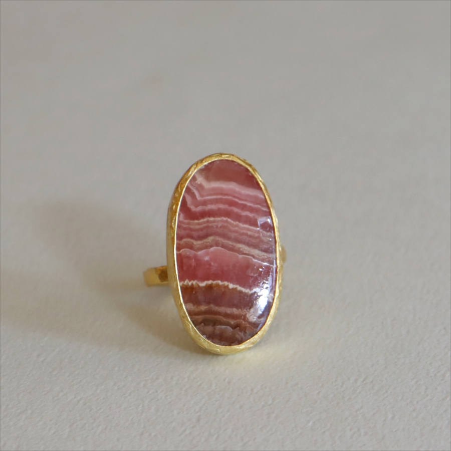 深いローズピンクから深みのあるオレンジがかった色まで、幾重にも重なった縞模様が印象的なロードクロサイトのリング。まるで大地の記憶を閉じ込めた地層のような模様は、自然が長い時間をかけて生み出した一点ものの表情です。同じ石はふたつと存在せず、その個性こそがこのリングの最大の魅力。眺めるたびに、新しい表情を見せてくれます。