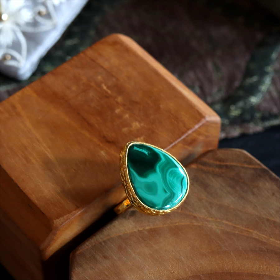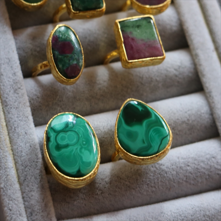 大粒のマラカイトを引き立てるため、デザインはあえてシンプルに。大胆なのにどこか落ち着きがあり、指先にしっくりなじむバランス感も魅力です。