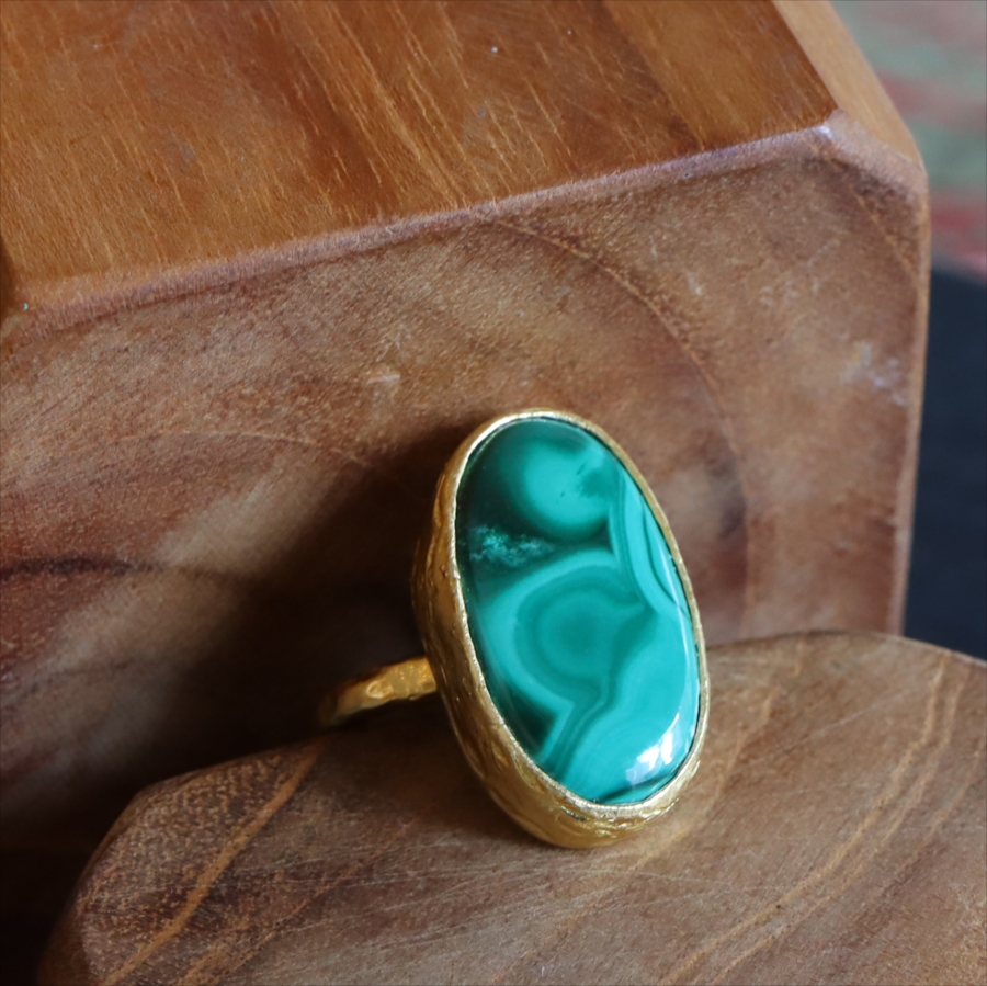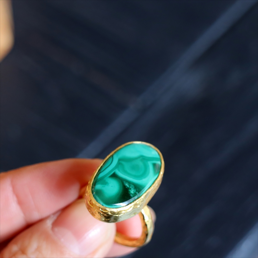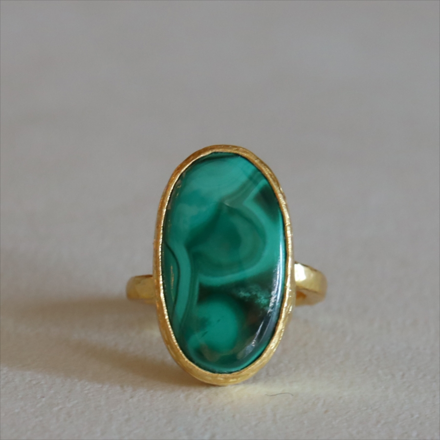 大粒のマラカイトを引き立てるため、デザインはあえてシンプルに。大胆なのにどこか落ち着きがあり、指先にしっくりなじむバランス感も魅力です。