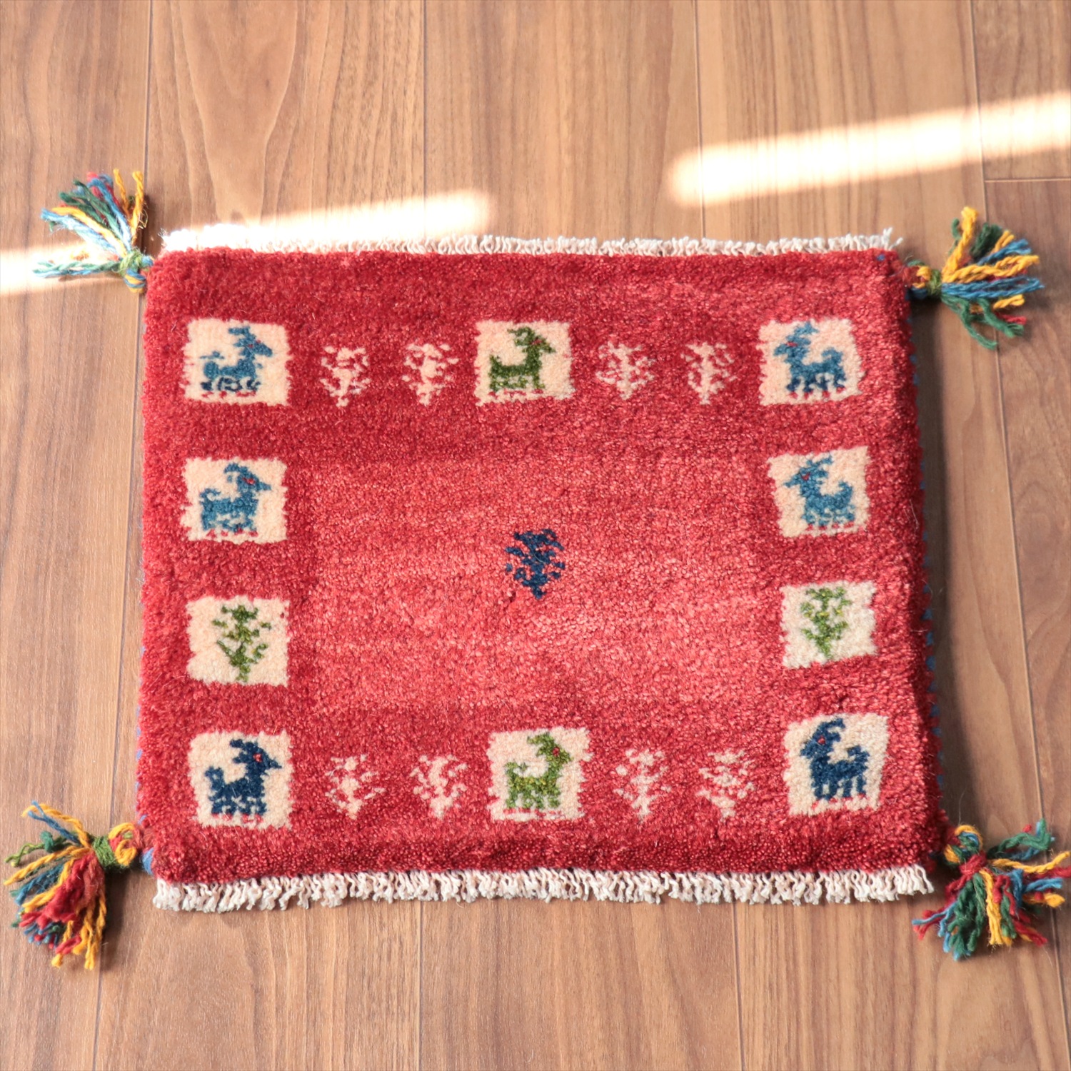 ギャッベ イラン産手織り 座布団サイズ 36x40cm レッド タイルモチーフ