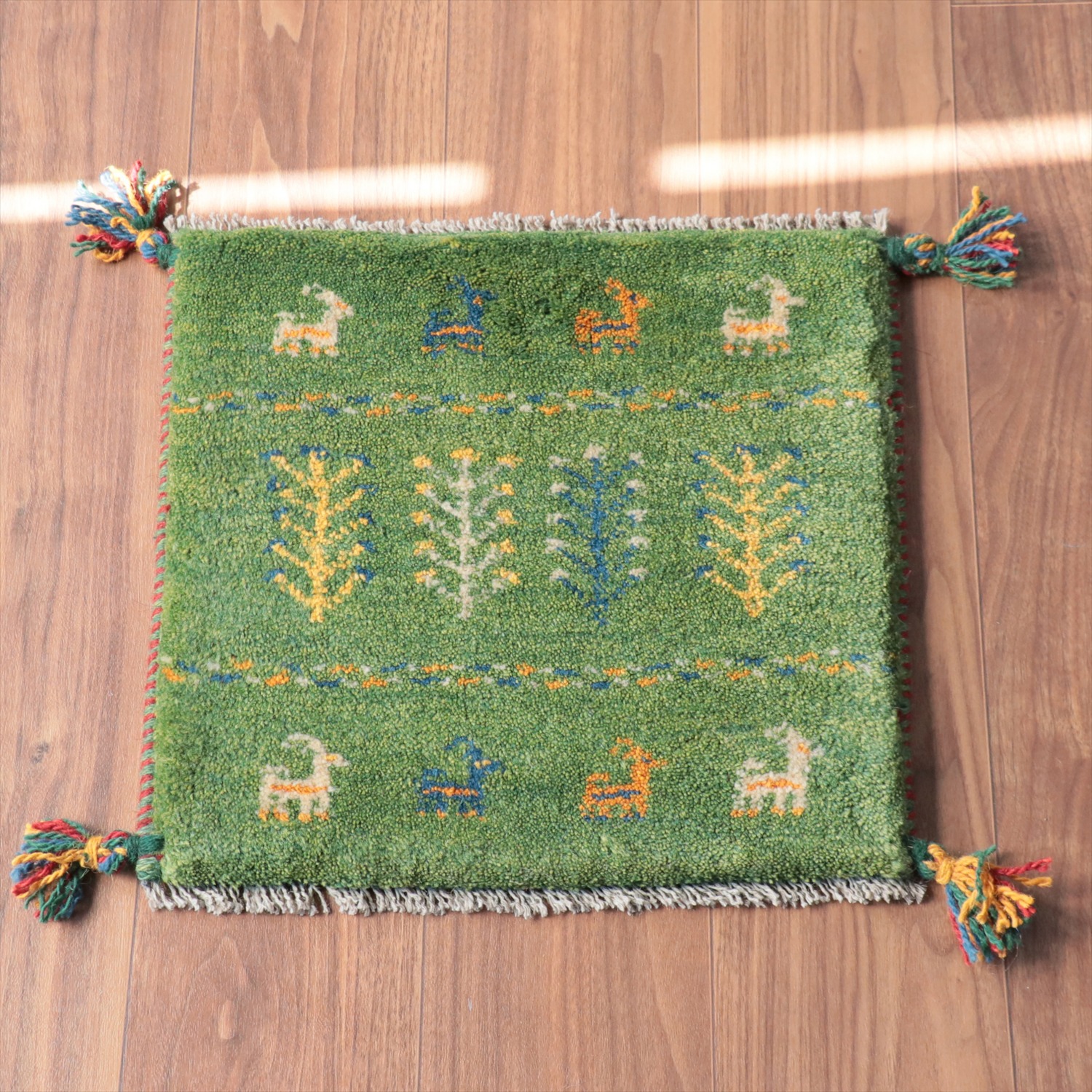 ギャッベ イラン産手織り 座布団サイズ 41x42cm グリーン 動物モチーフ