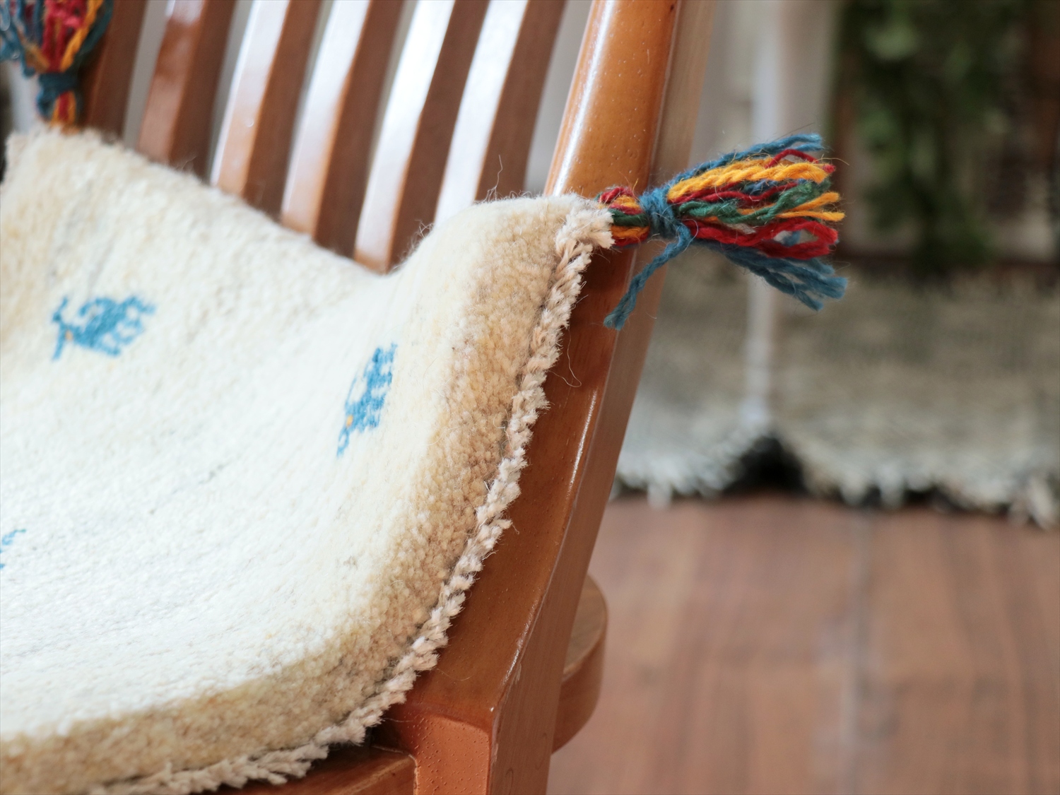 天然の羊毛の色をそのまま使ったギャベ。温かみのあるアイボリー(明るいクリーム色)です。シンプルなデザインながら、動物モチーフの配置や色は一枚一枚違っていて、まったく同じものはなく、手織りならではの一点ものです。