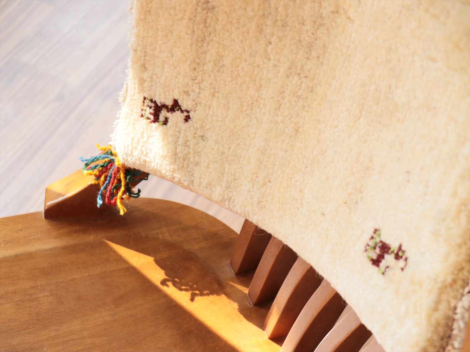 天然の羊毛の色をそのまま使ったギャベ。温かみのあるアイボリー(明るいクリーム色)です。シンプルなデザインながら、動物モチーフの配置や色は一枚一枚違っていて、まったく同じものはなく、手織りならではの一点ものです。