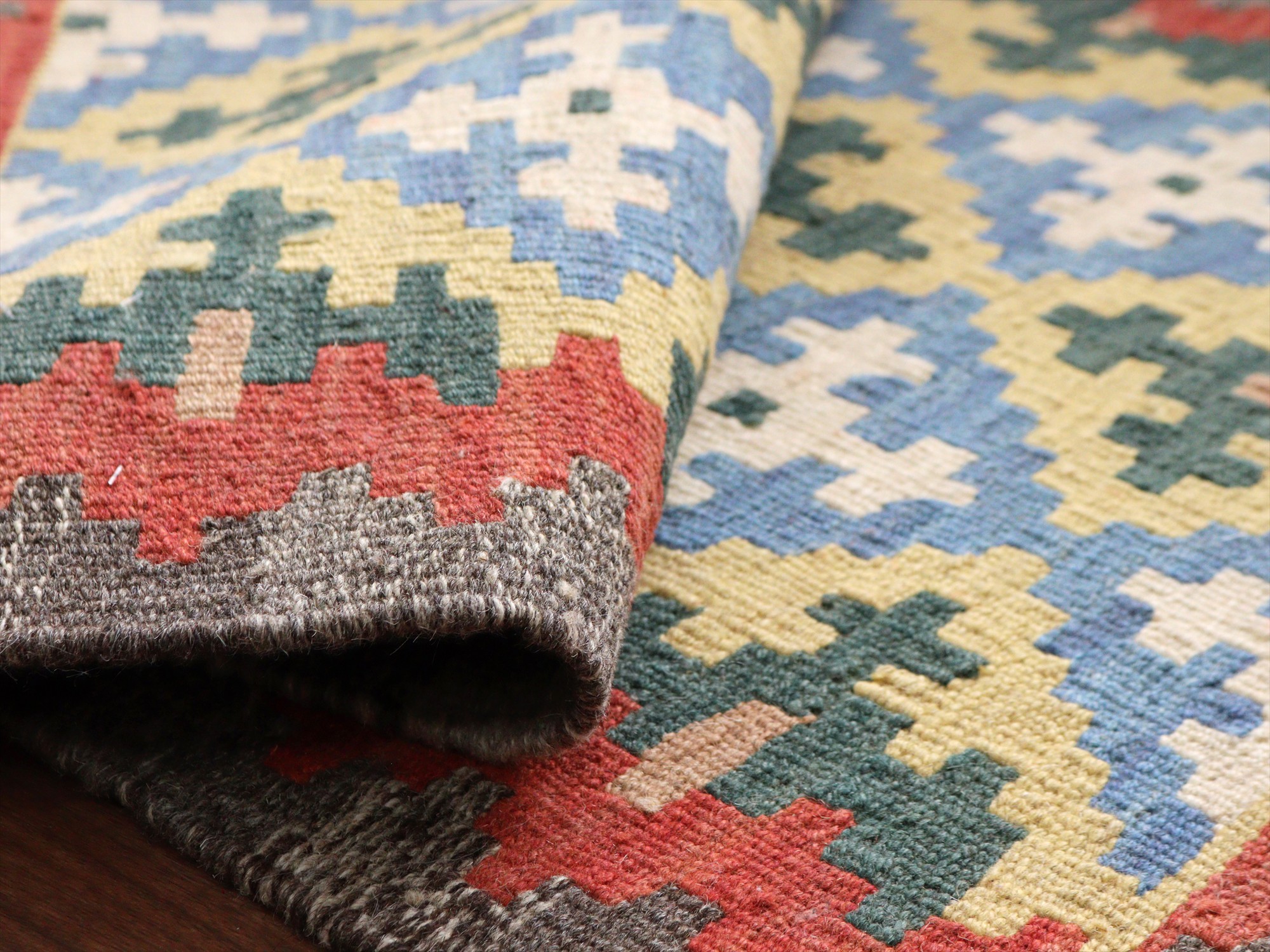 - カシュカイキリム イラン 手織り87×64cm カラフルな幾何学モチーフ