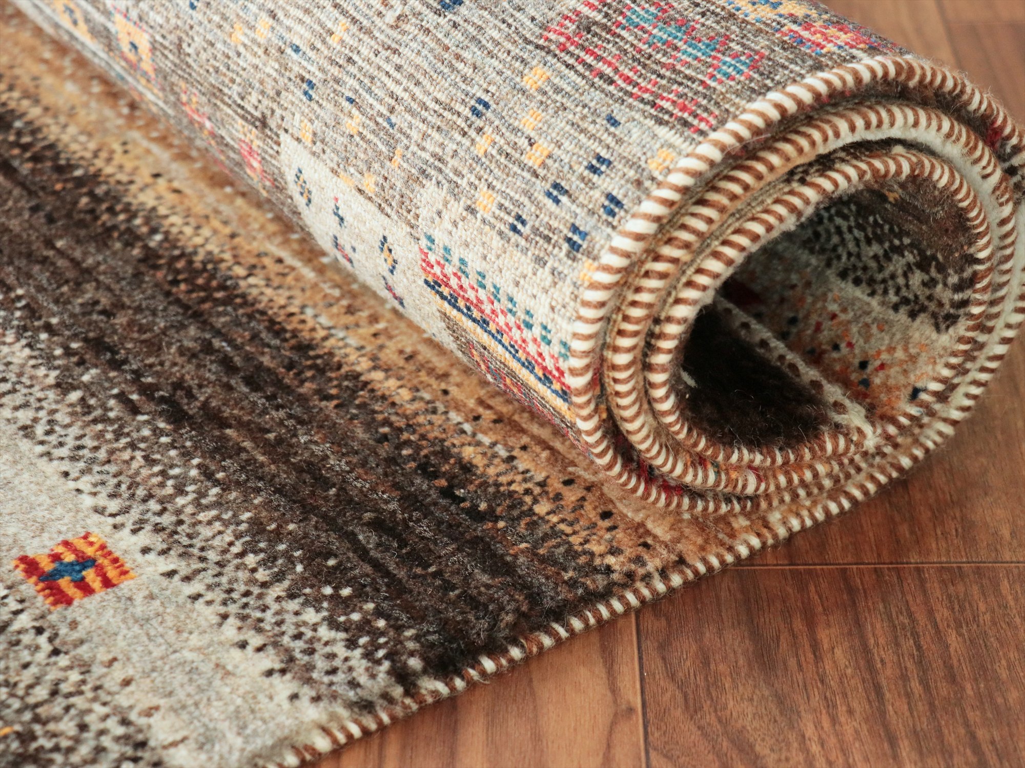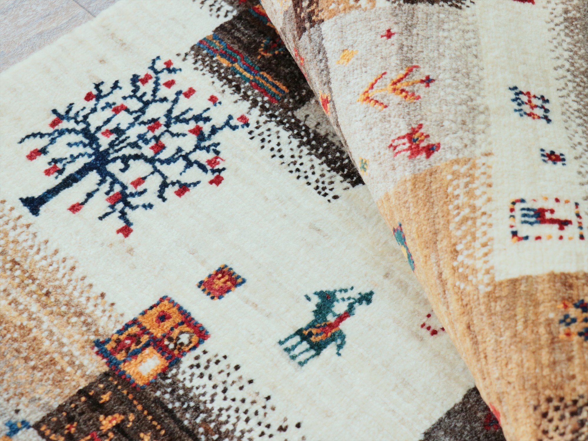 繊細なモチーフをくっきり見せるため、毛足は短めの刈り込みになっています。ラグの厚みは1.1-1.2cm程度のすっきりとしたパイルのギャッベです。