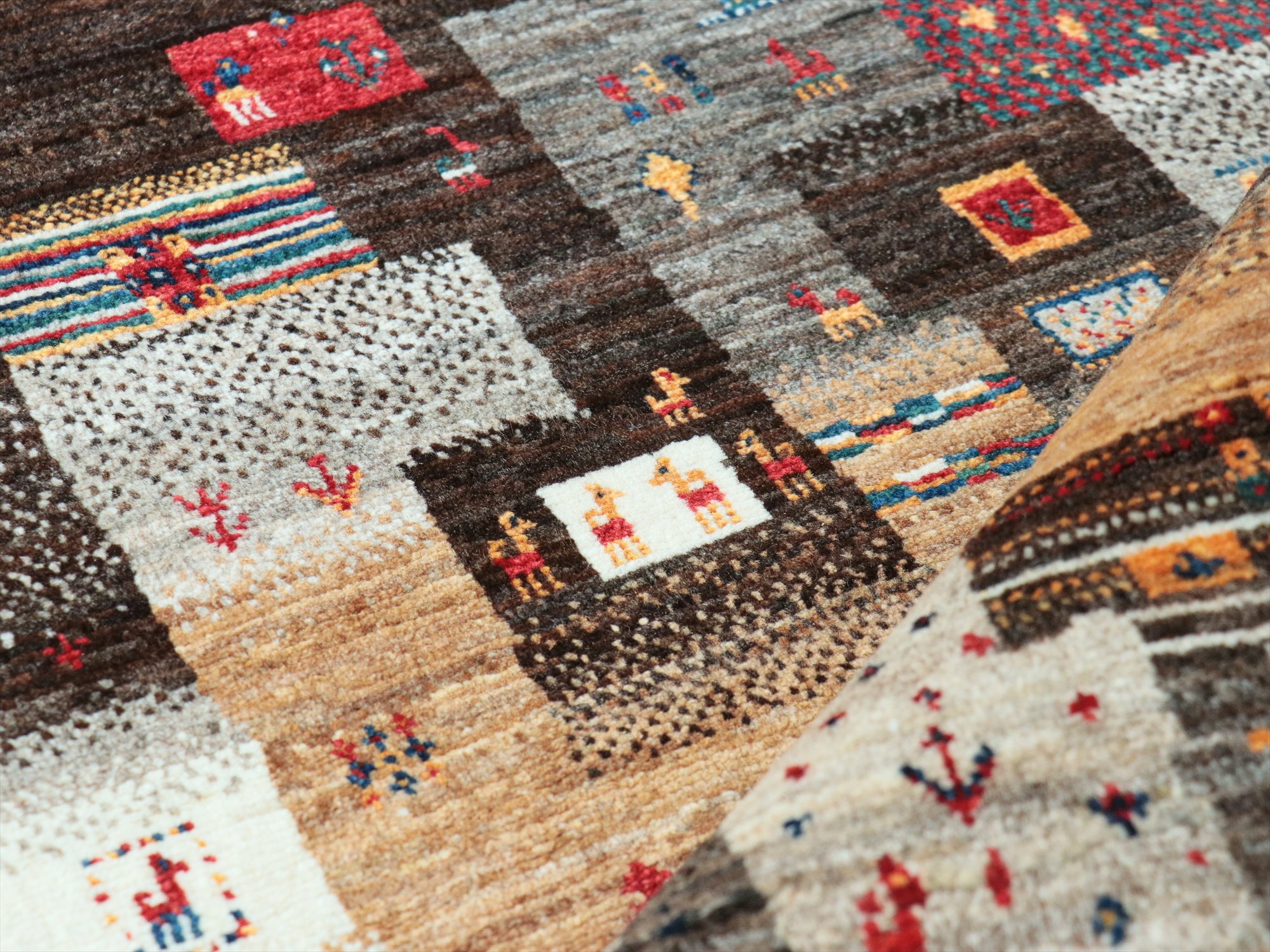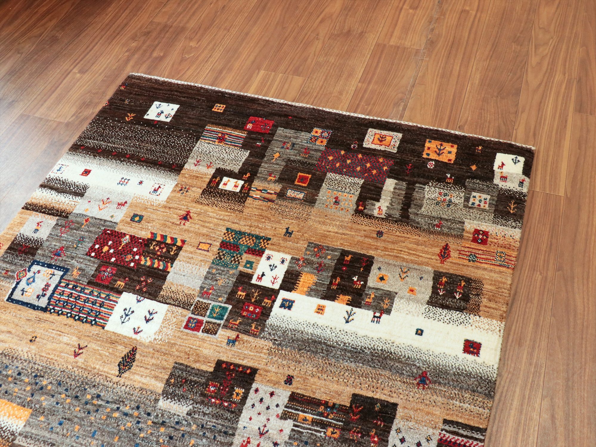 染めていない羊毛のアイボリー、ブラウン、グレーの色合いを使った不規則なパズルのようなデザイン。細かな織りだからこそ表現可能な小さなモチーフが魅力的♪ラクダや魚や小さなお花モチーフやひし形や四角などの幾何学モチーフが入っています。