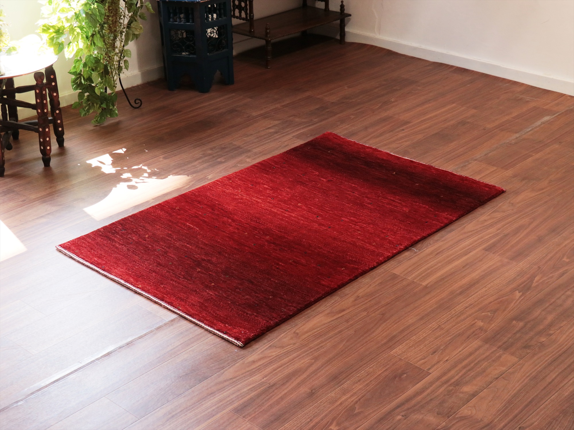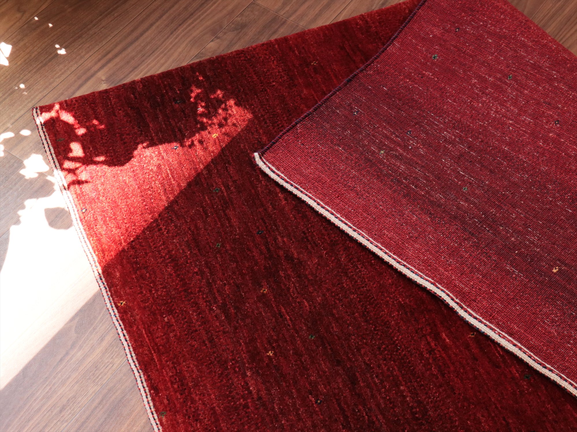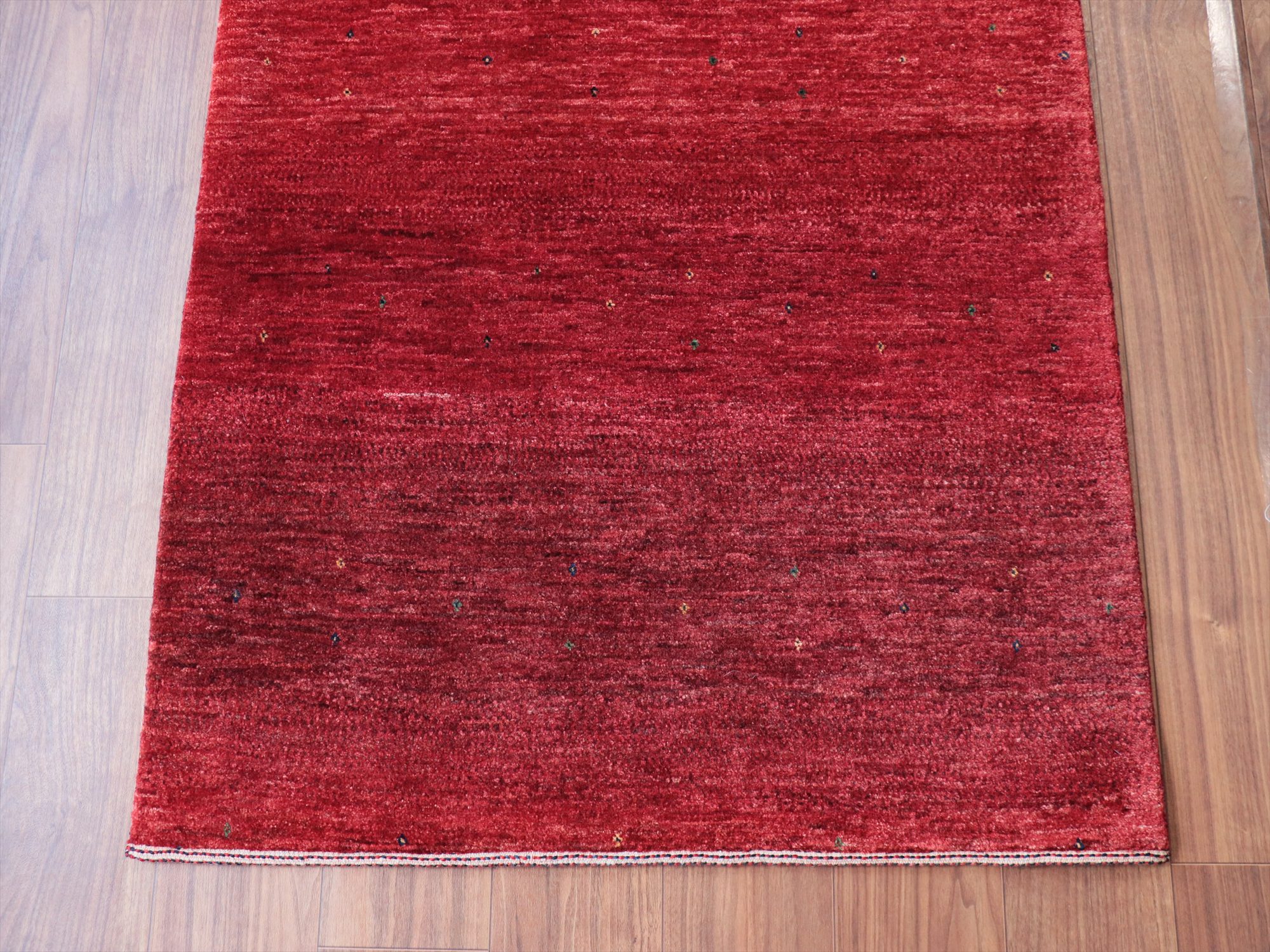 上品で深みのあるレッドのグラデーションが美しいギャッベ。モチーフがほとんどないシンプルなデザインで、シンプルに細かな手織りを楽しめる、モダンデザインです。