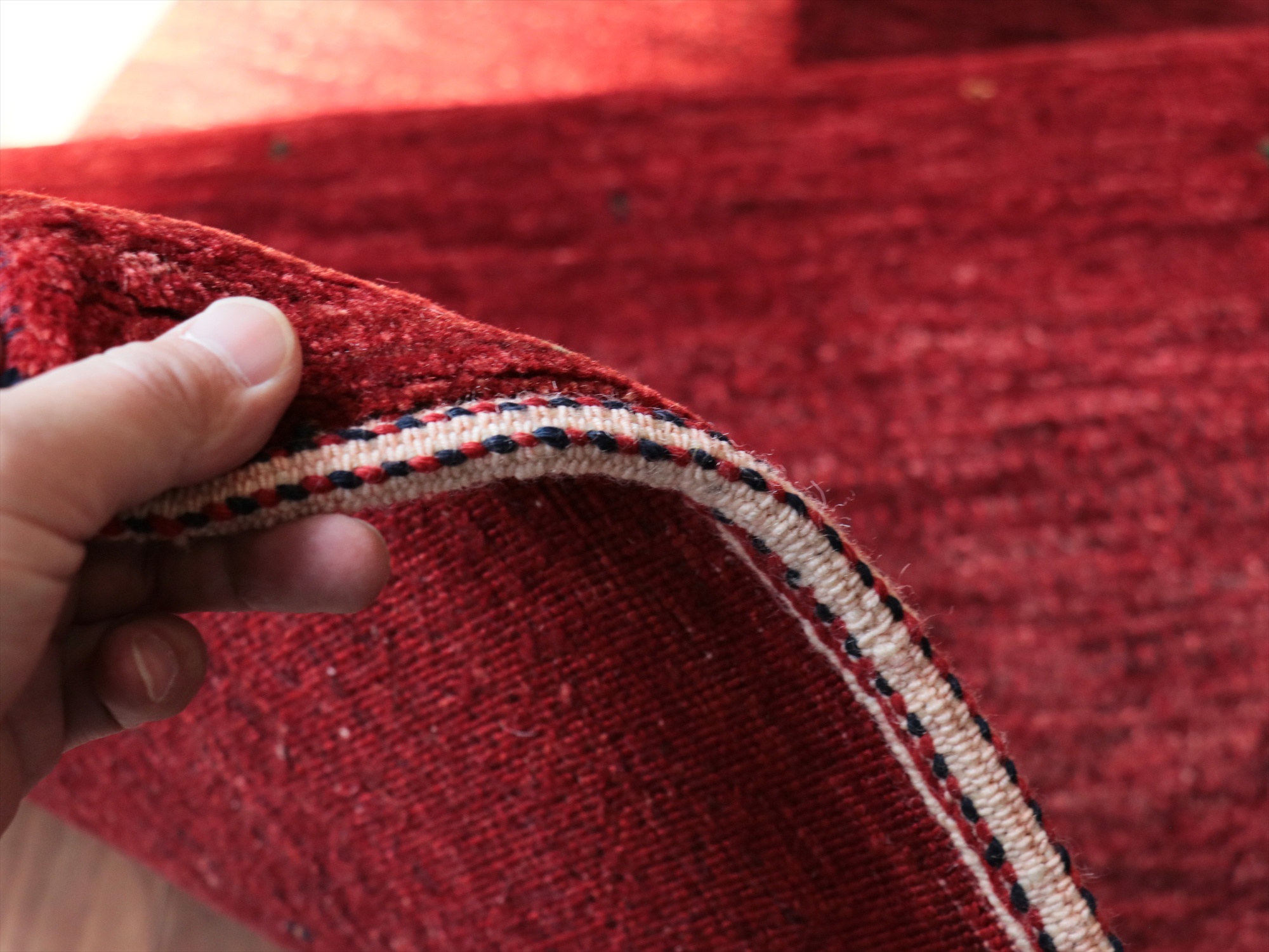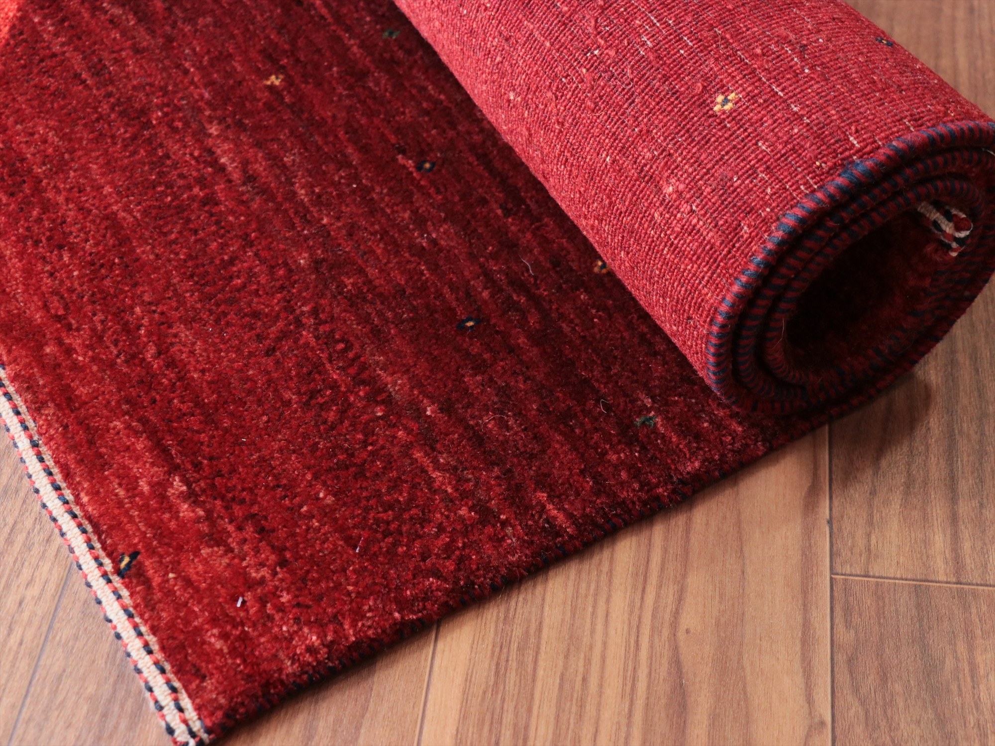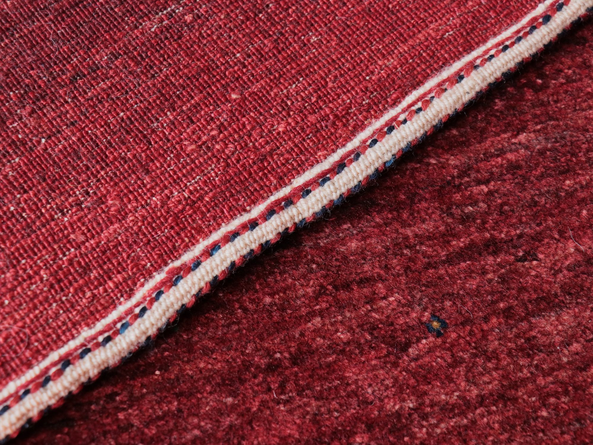 上品で深みのあるレッドのグラデーションが美しいギャッベ。モチーフがほとんどないシンプルなデザインで、シンプルに細かな手織りを楽しめる、モダンデザインです。