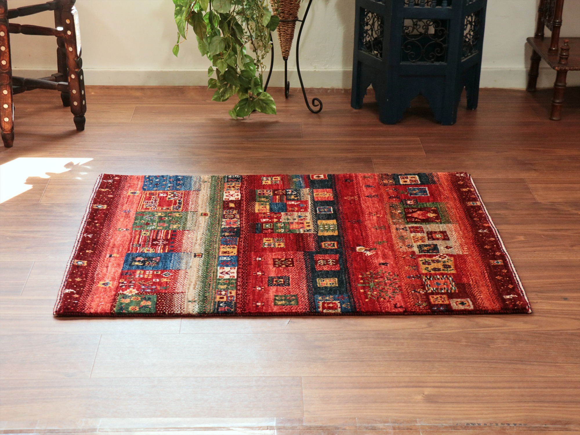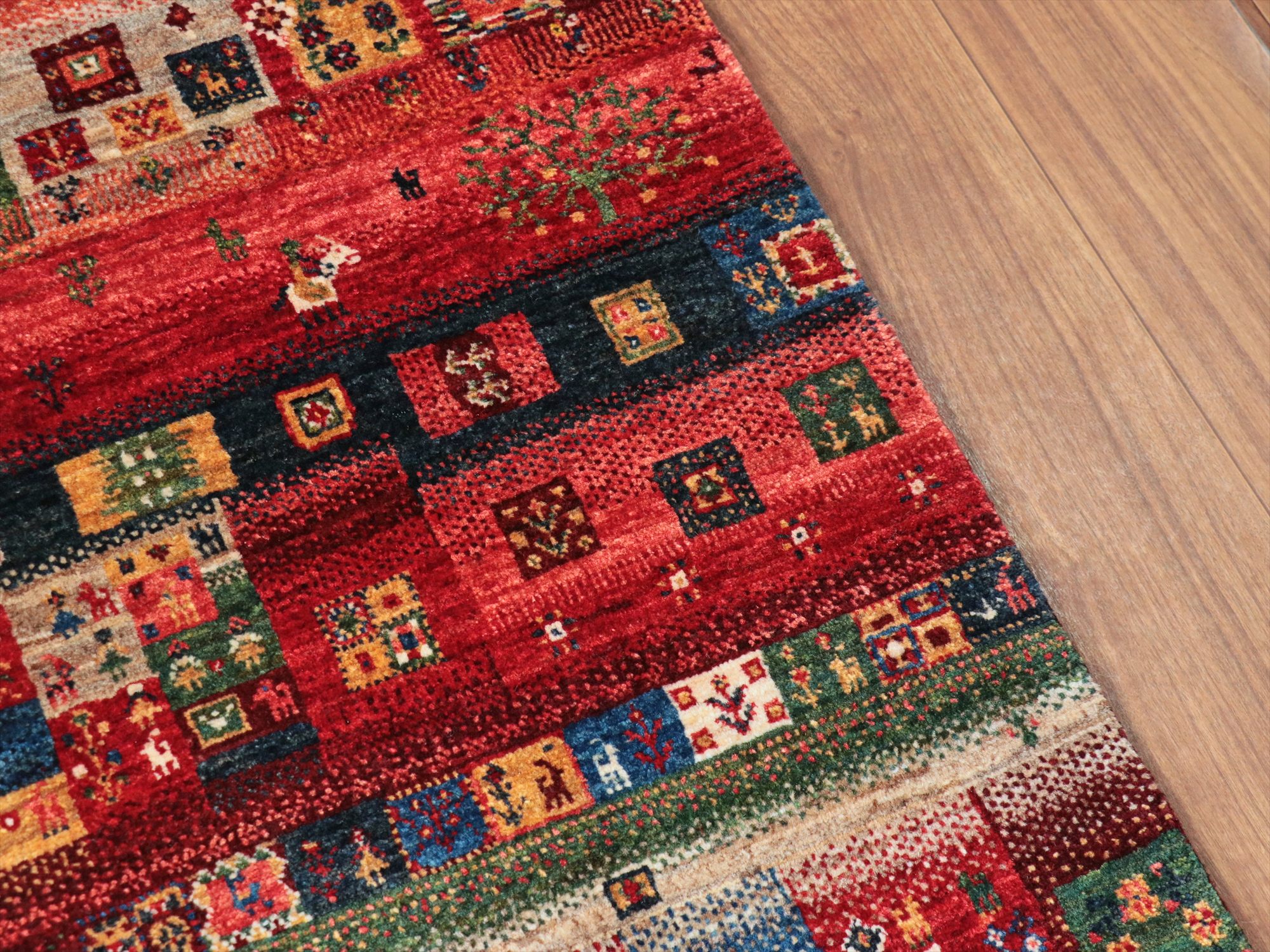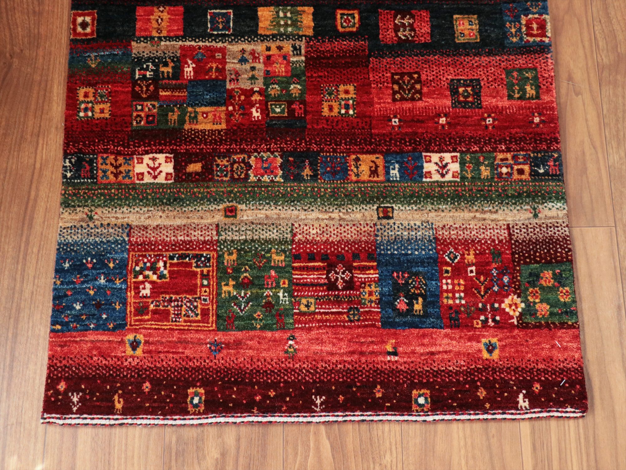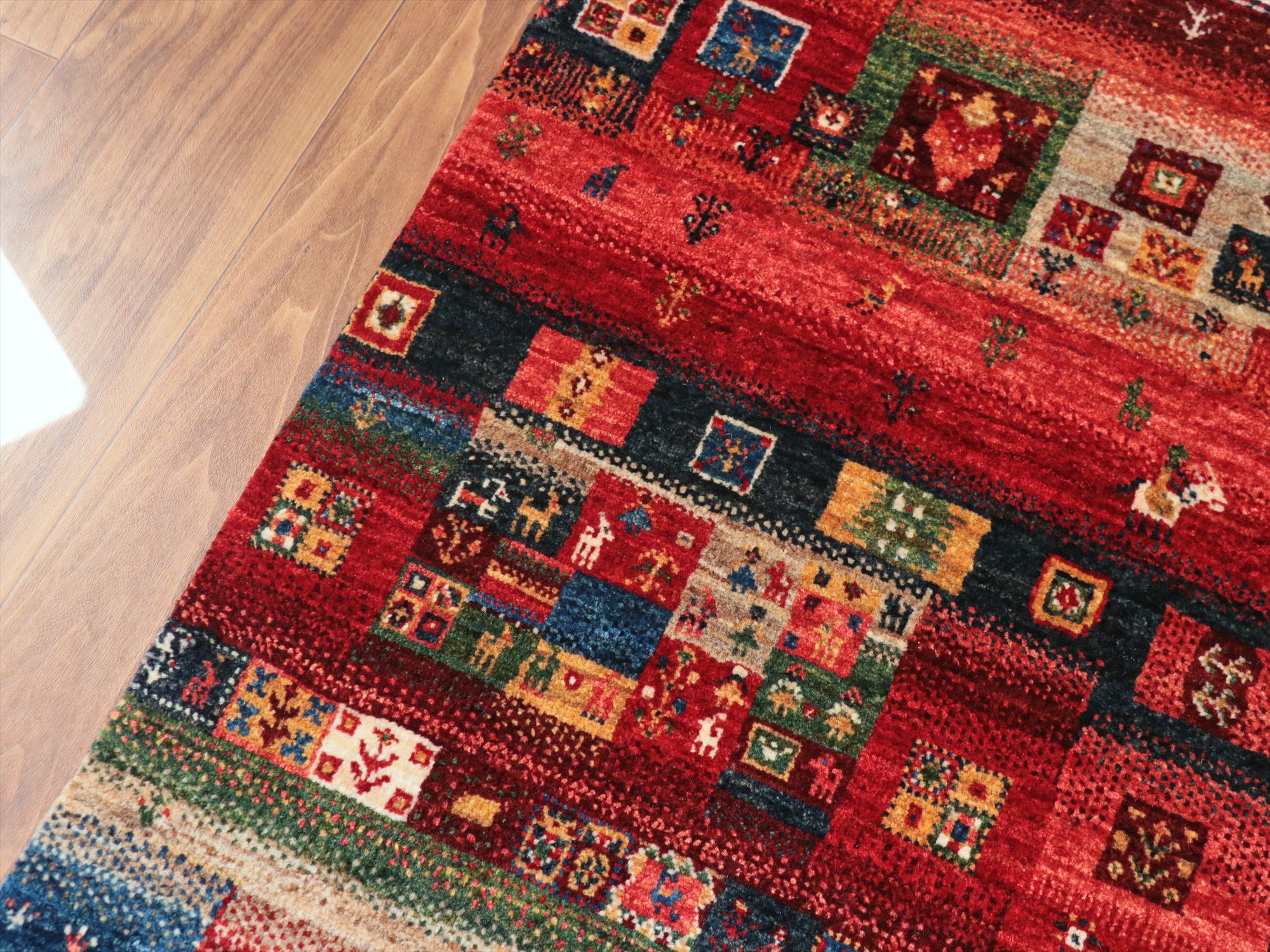 Key:Gabbeh,Nowbaft,Tribal rug, Persian carpet,Iran,Shiraz, Quashkai,Farhadian, 手織りギャッベ, 細かい, イラン直輸入, ペルシャ絨毯, 玄関マット, レッド系, 赤, カラフル, タイル柄, モザイク, 動物モチーフ, モダンデザイン, 草木染, ウール100%, ガラタバザール, 東京, 中野区