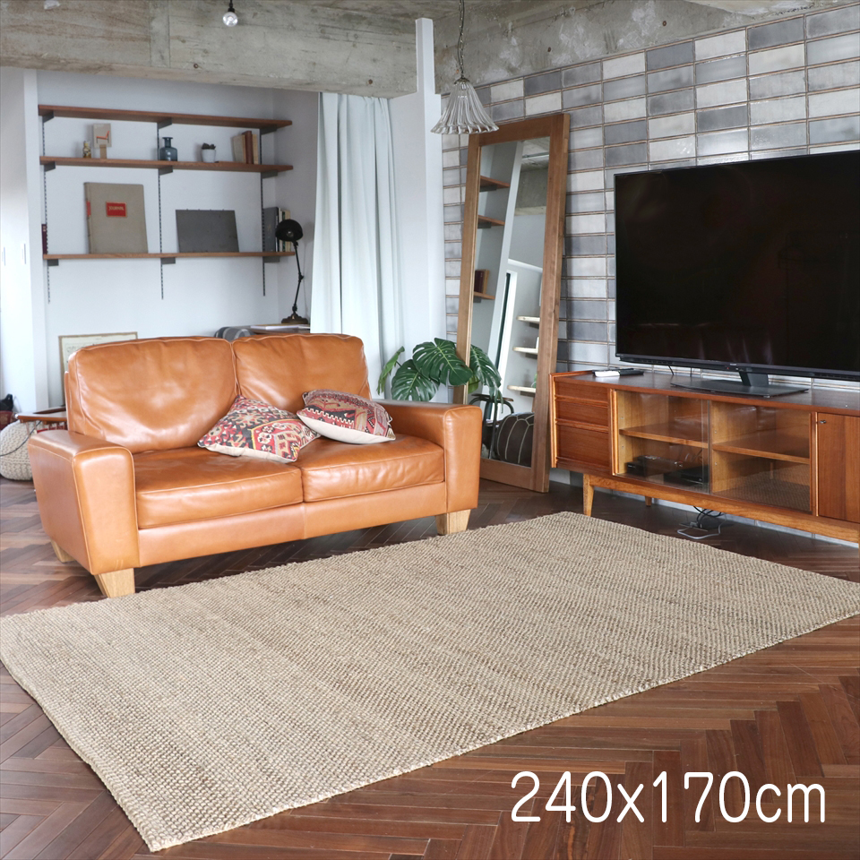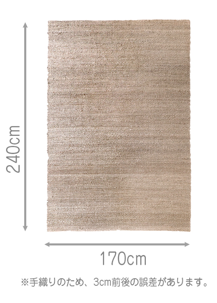 | お手入れ方法 | ・普段のお手入れは掃除機をご使用下さい。掃除機をかける際は、回転式ブラシのご使用はお控え下さい。 ・ドライクリーニング及びウェットクリーニングはできません。 ・ジュート素材の洗濯はできません。汚れやシミが付いた際には、速やかにやわらかめなブラシなどと少量の水で除去してください。 ・濡れた場合は色移りする可能性がありますので、十分に乾燥させてください。 |