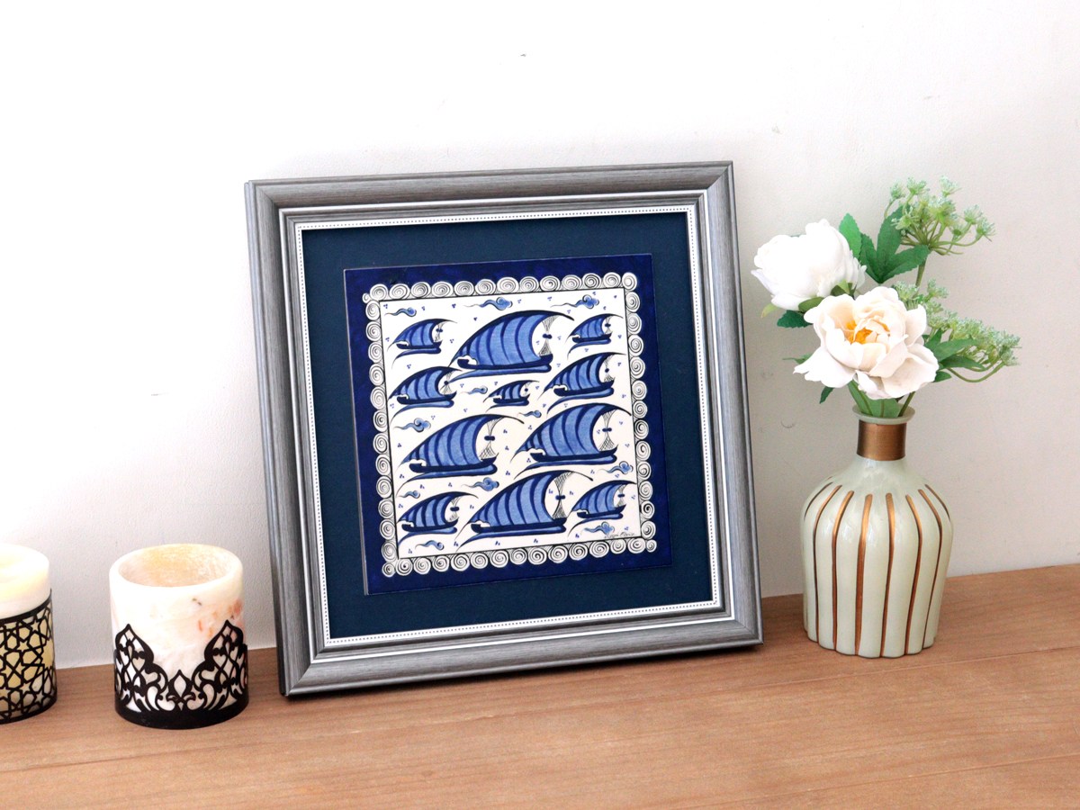 トルコ陶器 手書きタイル 1枚額 H31×W31×D2.5cm チャナッカレ・トロイの船 Turkish Hand Paint Tile