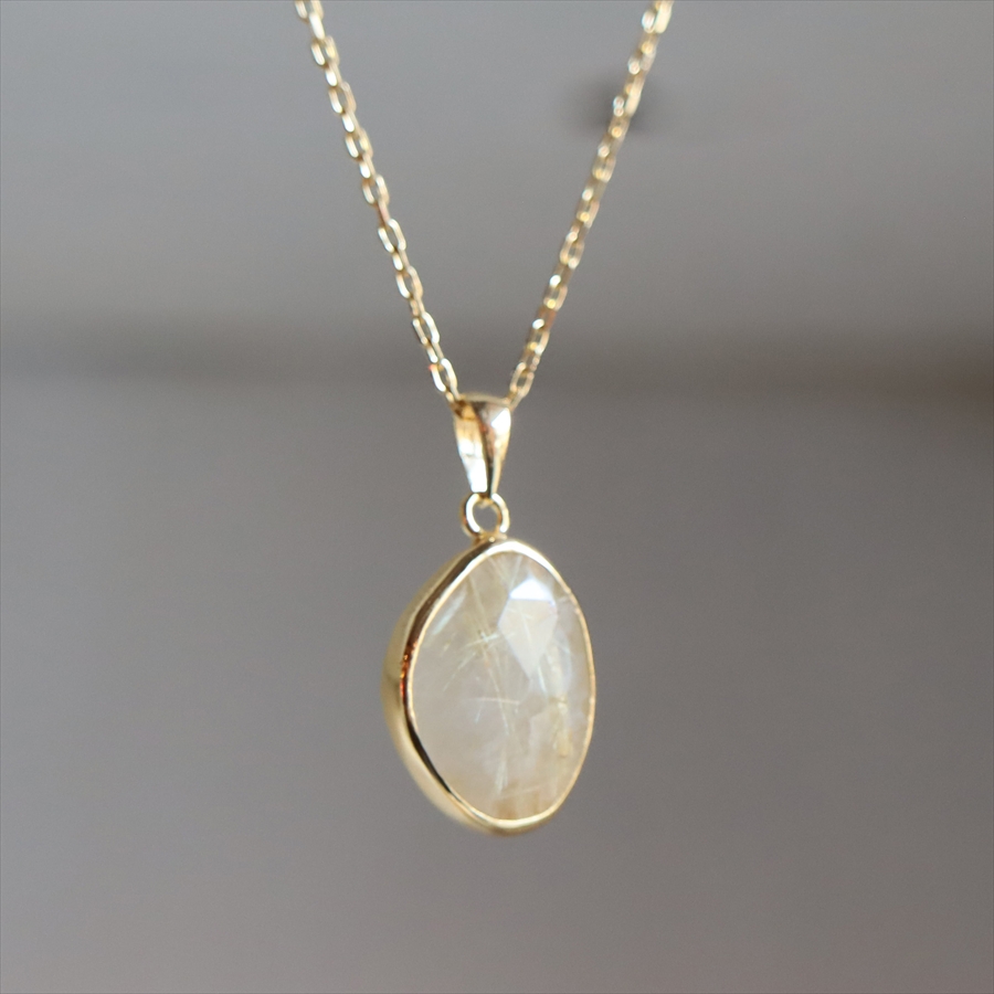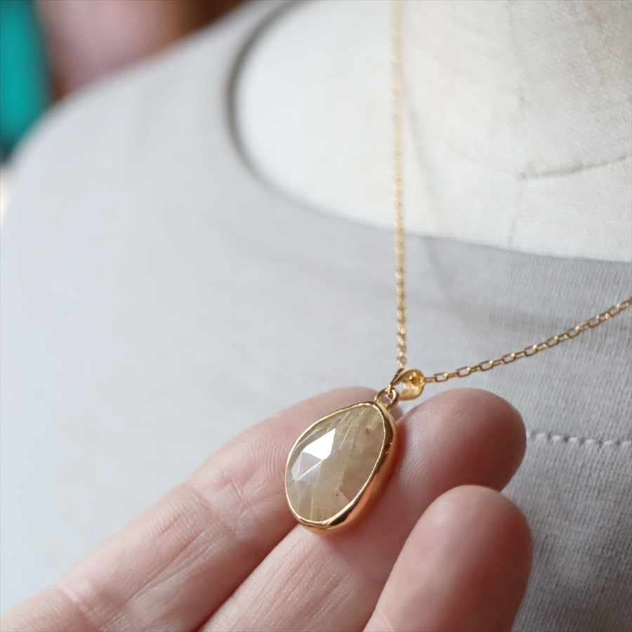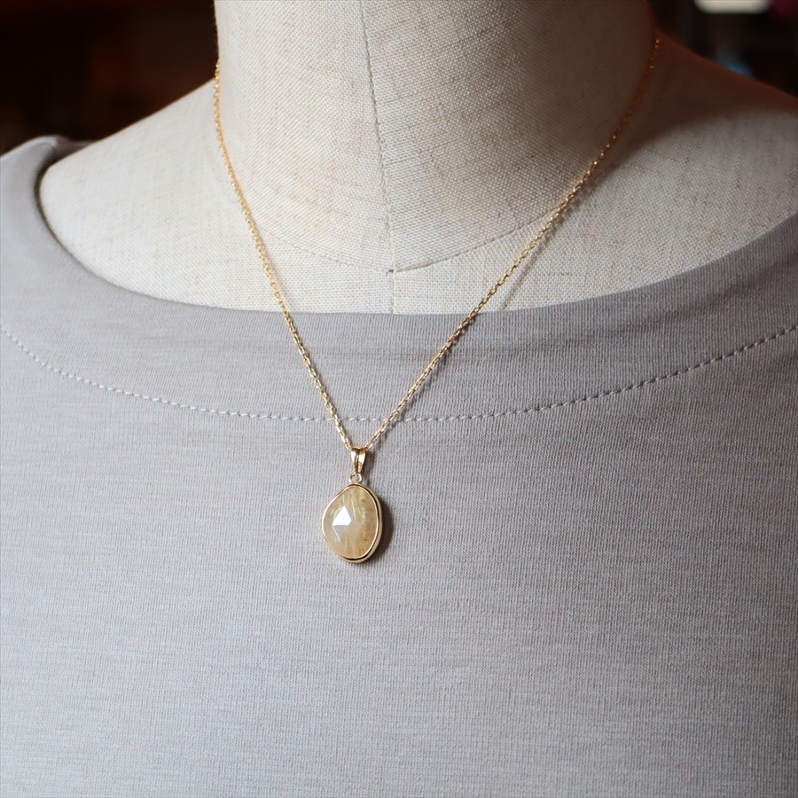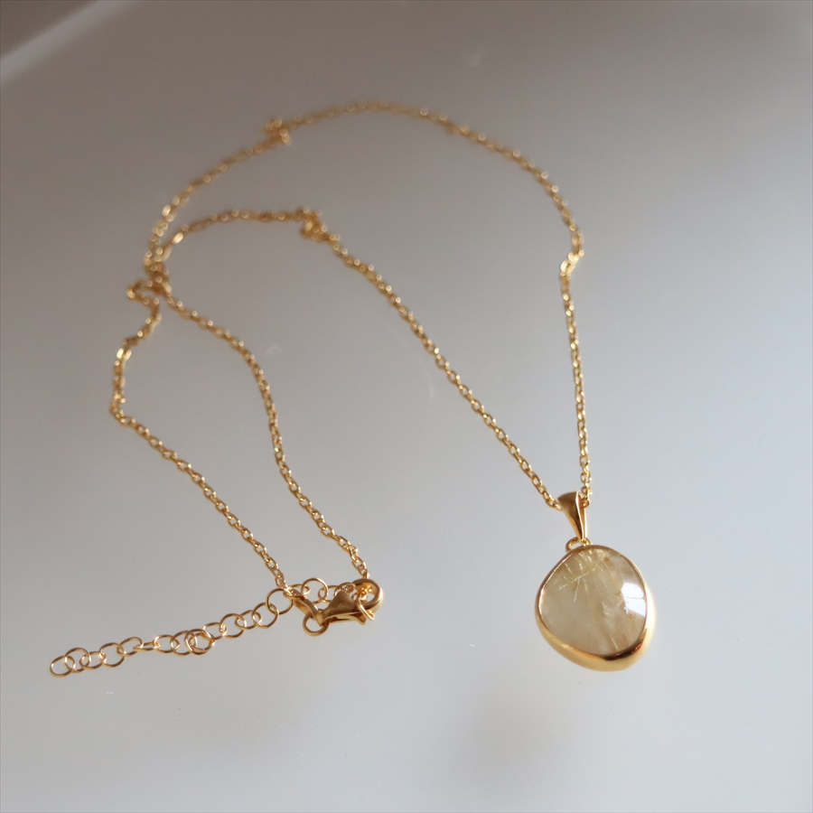 乳白色の半透明なクォーツの内部に、繊細な金色のルチルが美しく散りばめられた、ゴールデンルチルクォーツのネックレスです。肌の色になじむ大人のニュアンスカラーで、時折キラッと光るルチルが上品なイメージです。