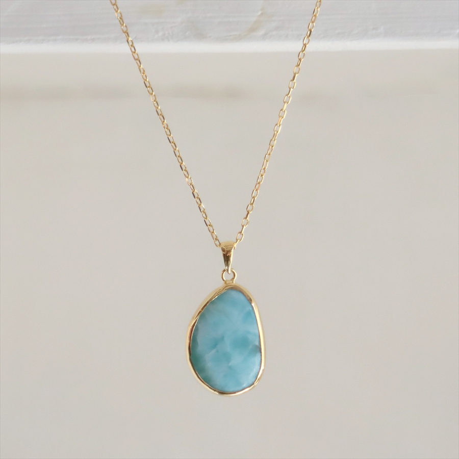 ブルーとホワイトの波模様は、カリブ海の宝石とも呼ばれ、人気の高いストーンのひとつです。こちらのペンダントは、2cm以上もある大粒の良質なラリマーをセレクトしました。
