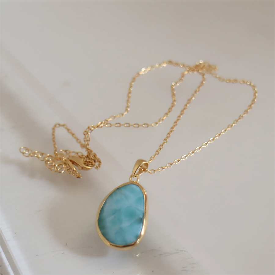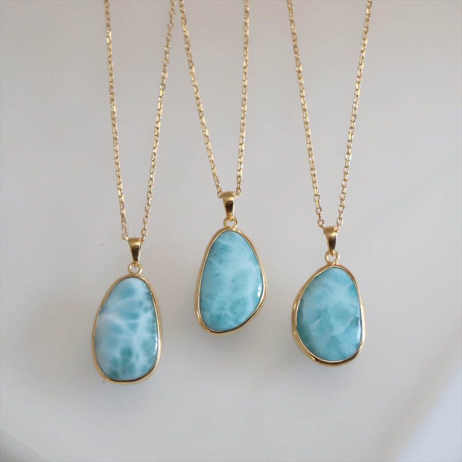 【ラリマー Larimer】ラリマーは、ペクトライトという鉱物の一種で、カリブ海のドミニカ共和国でのみ産出される希少な天然石です。銅を含むことで生まれるやわらかなブルーと、白い雲や波のような模様が特徴。