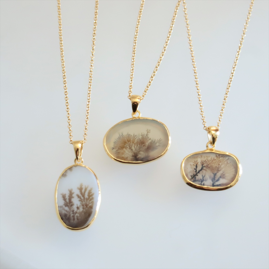 まるで樹木のシルエットのよう!でもこれは自然が創り出した鉱物の結晶が、枝のように広がったものなのだそうです。霧の中にたたずむ森や、冬枯れの枝先のようにも見えるその姿は、眺めるたびに想像をかき立てる幻想的な美しさを秘めています。同じものはふたつとない、地球からの贈り物です。自然が描いた小さな風景を、そっと身にまとってみてくださいね。