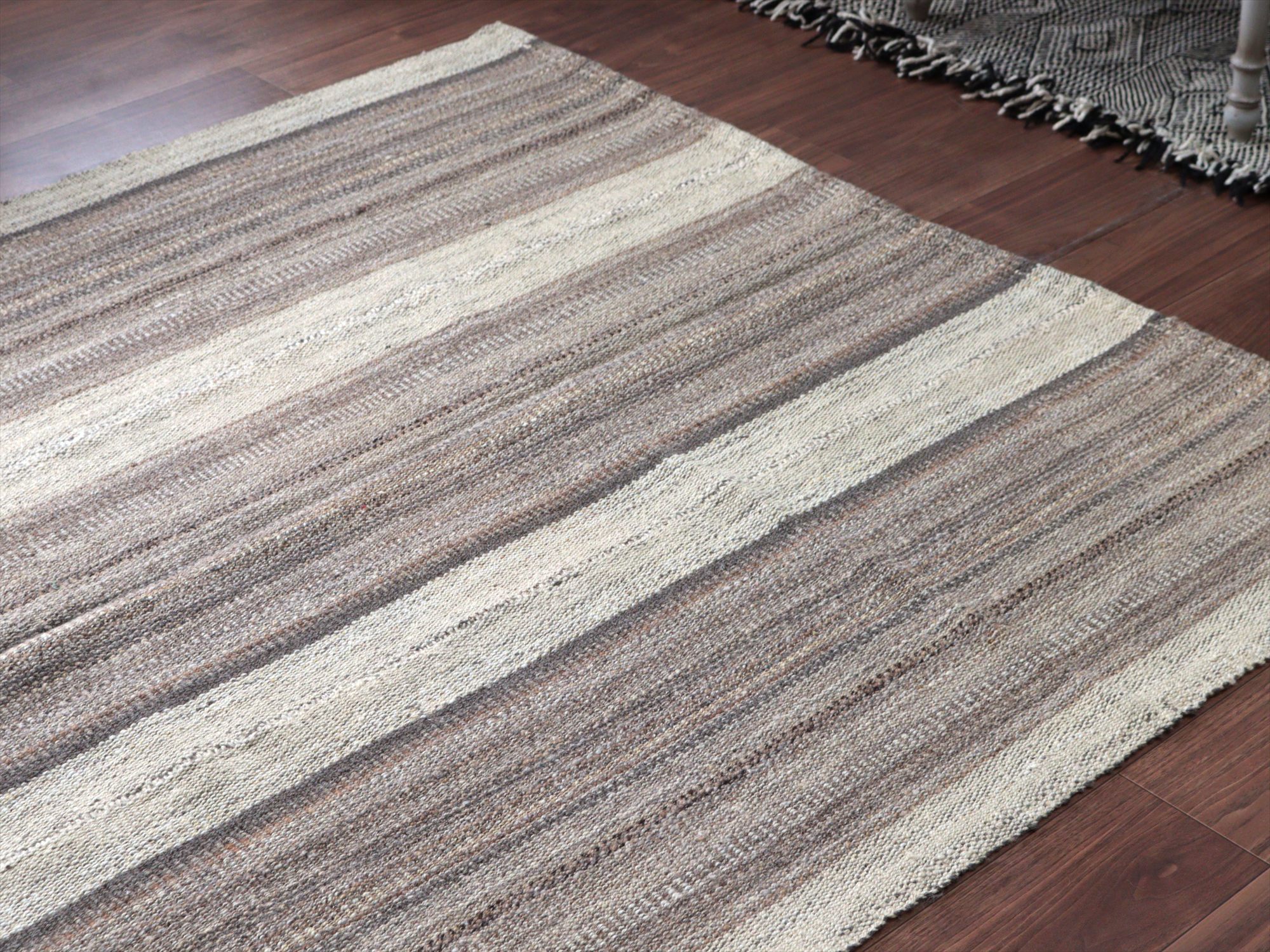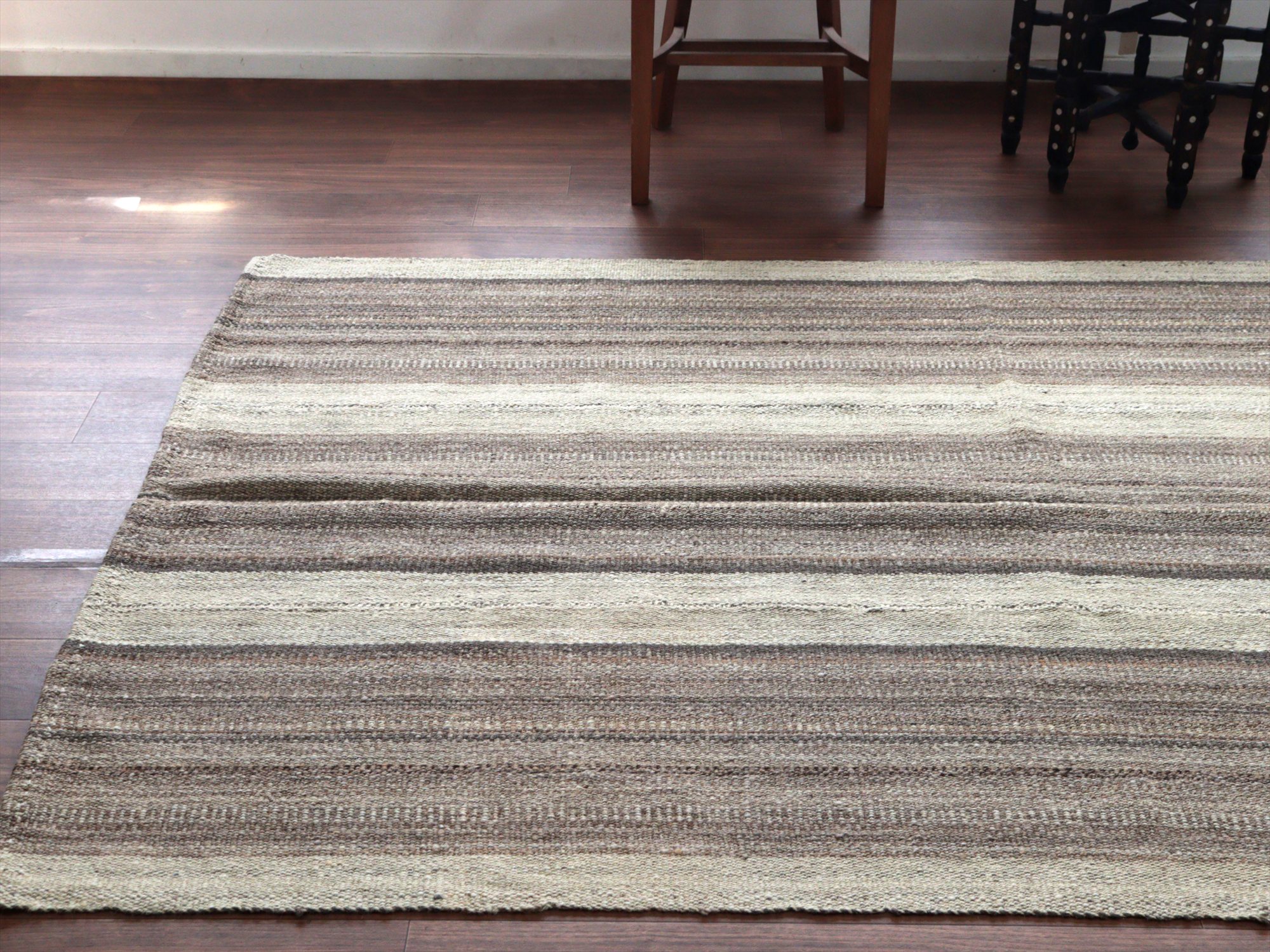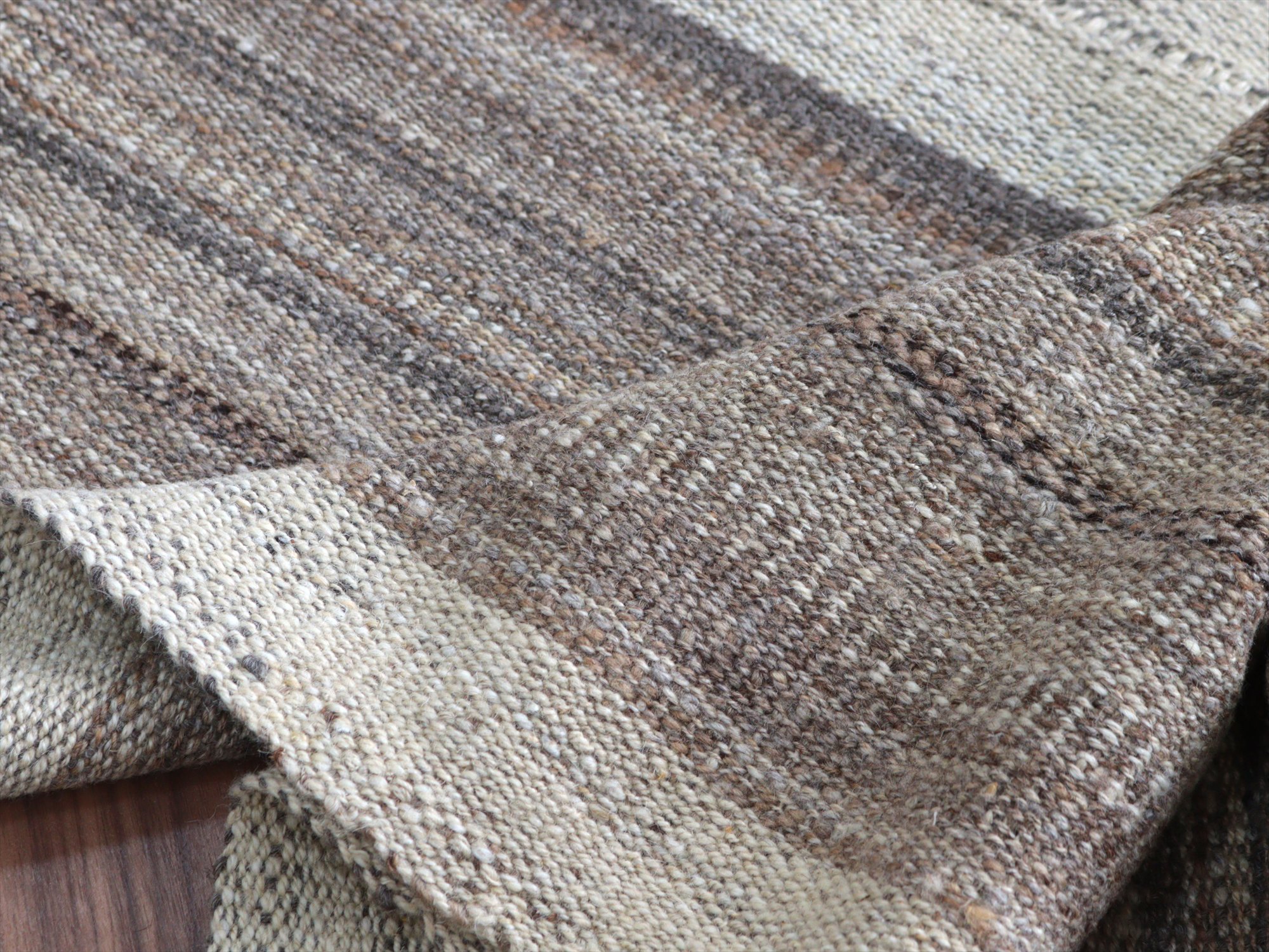トルコ北東部、カルス地方で織られたキリム。ブラウンとグレー、アイボリーの組み合わせで、ストライプが表現されたシンプルなデザイン。