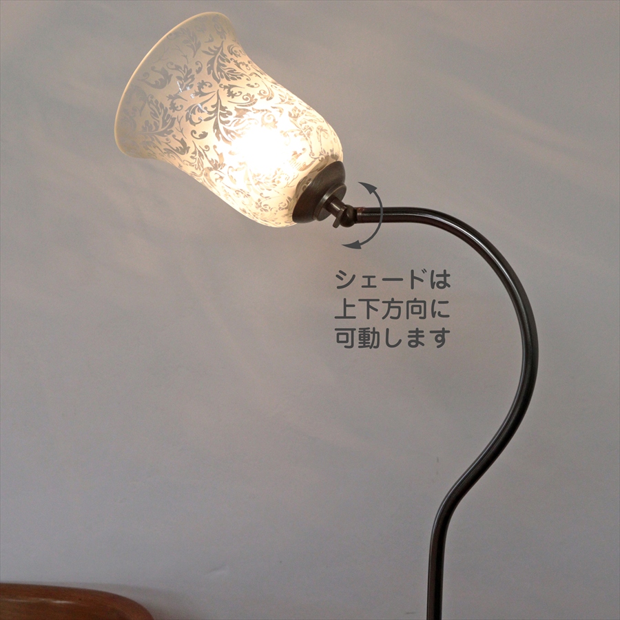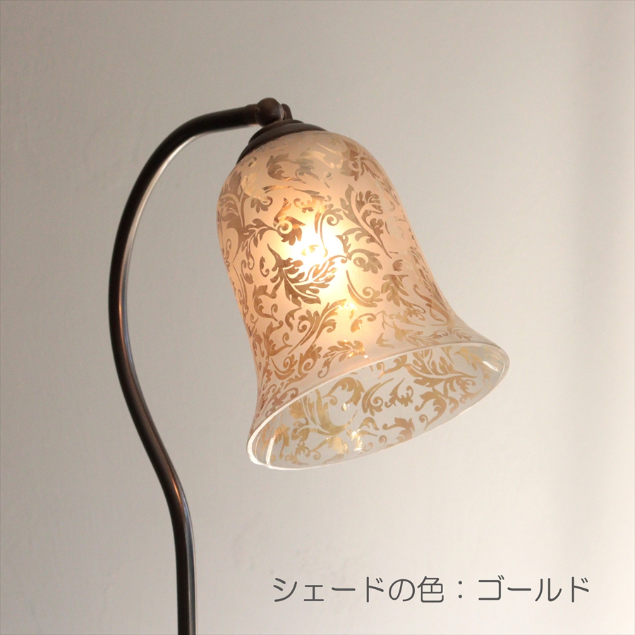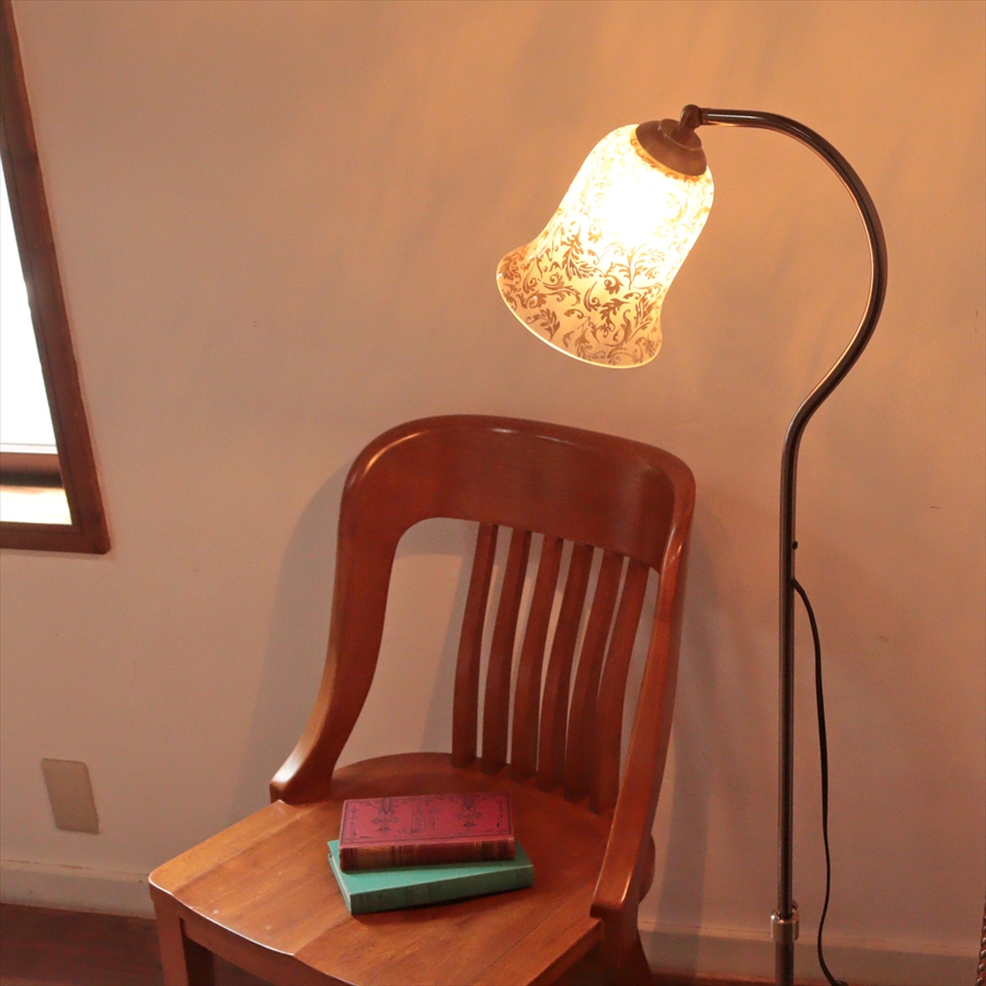 クラシカルなベル形のガラスに、サンドブラストで浮かび上がらせたアラベスク模様が施された華やかなデザインのガラスシェードを使ったアンティーク風のフロアランプ。