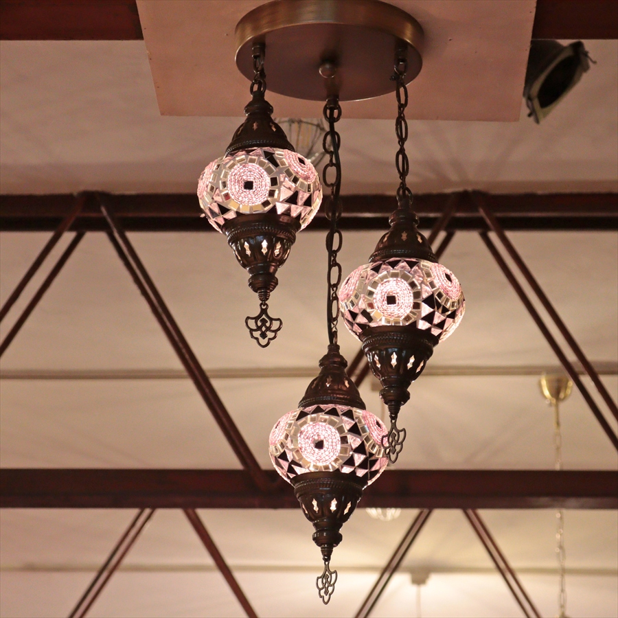 モザイクランプ トルコランプ シャンデリア 3灯 全高60cm 直径27cm パープル 【天井工事必要】