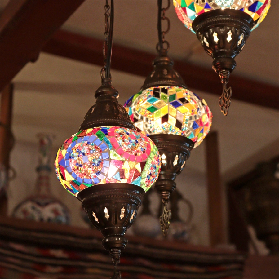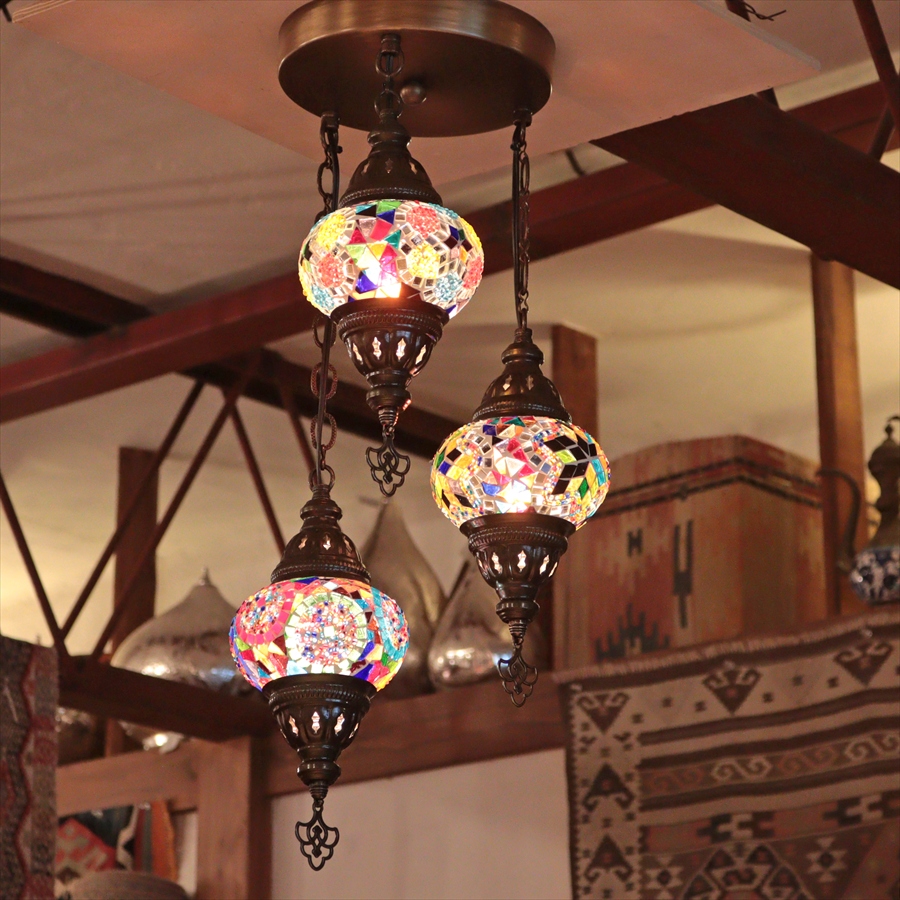 モザイクランプ トルコランプ シャンデリア 3灯 全高60cm 直径27cm カラフルミックス 【天井工事必要】
