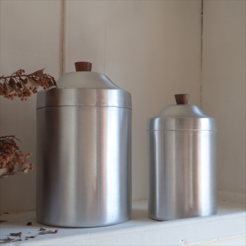 シンプルなアルミキャニスター。持ち手は木製(アカシア材)で、無機質になりすぎず、温かみのある雰囲気です。オリジナルのラベルを貼ったり、文字をペイントしたり、カフェ風のディスプレイにもぴったりです。