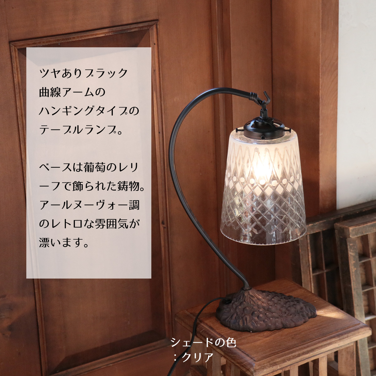 ベースは葡萄の房のレリーフで飾られたアールヌーヴォー調で、緩やかな曲線アームのハンギングタイプです。