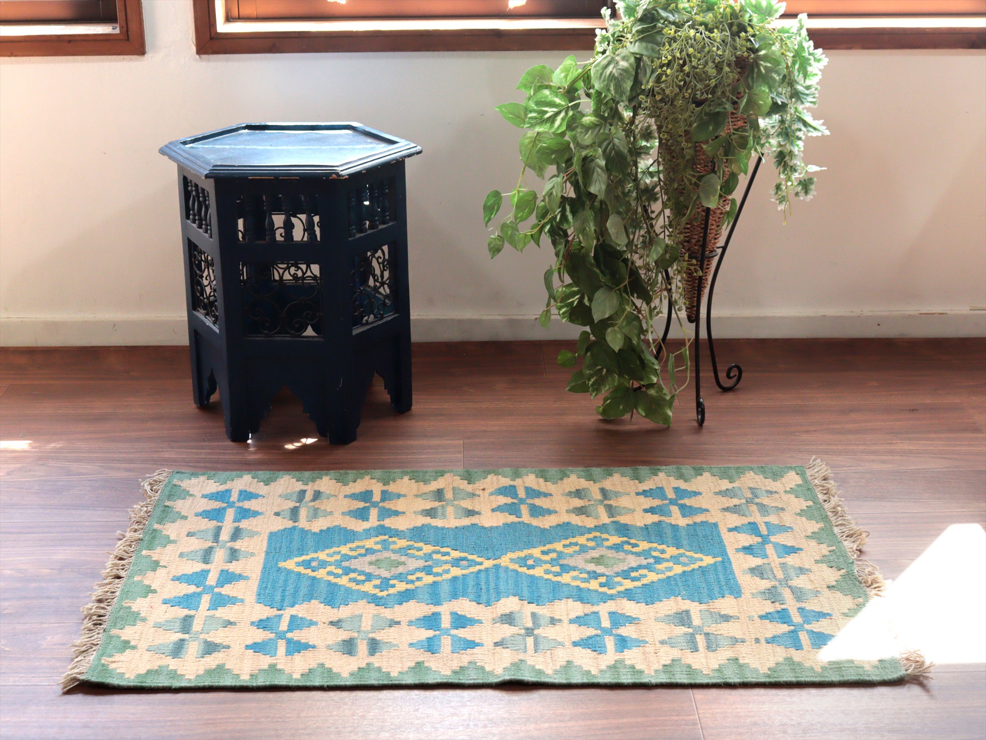 6-7mm程度の厚みがあり、パイル(毛足)がない平織りの敷物で表面は少しザラっとした肌ざわりです。織り手の自由なアイデアでデザインされていますので、左右対象でなかったり、モチーフが少しずれていたりということもありますが、世界で一枚だけの作品ですからその点はご了承ください。