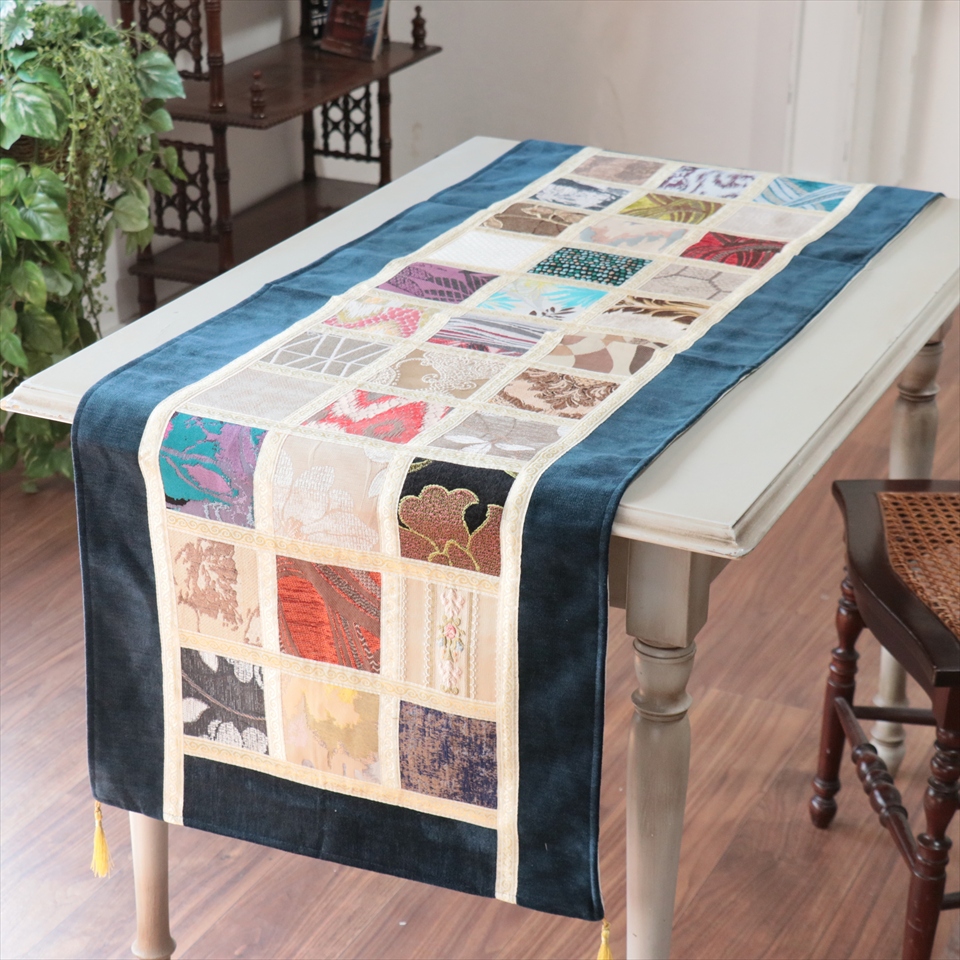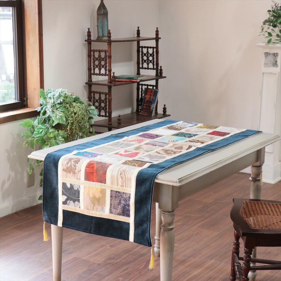 - テーブルランナー モザイクパッチワーク 142x50cmサイズ シュニール素材