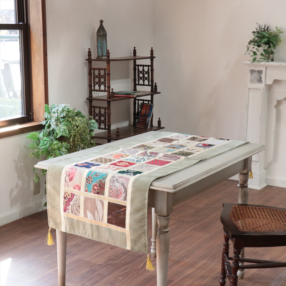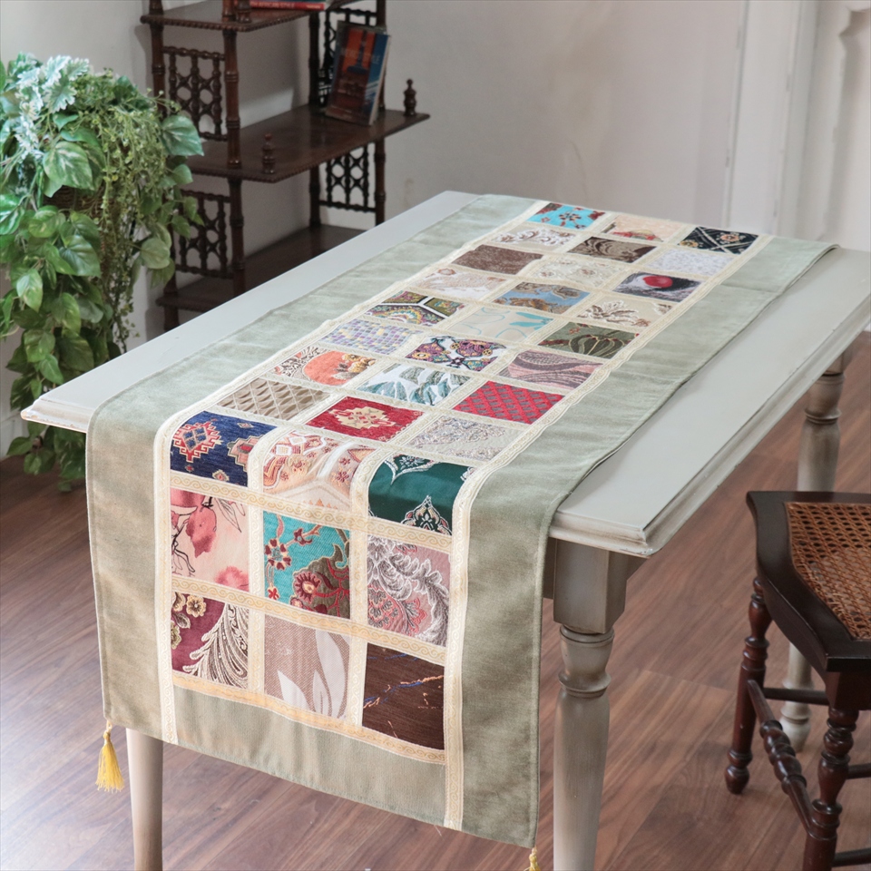 - テーブルランナー モザイクパッチワーク 142x50cmサイズ シュニール素材