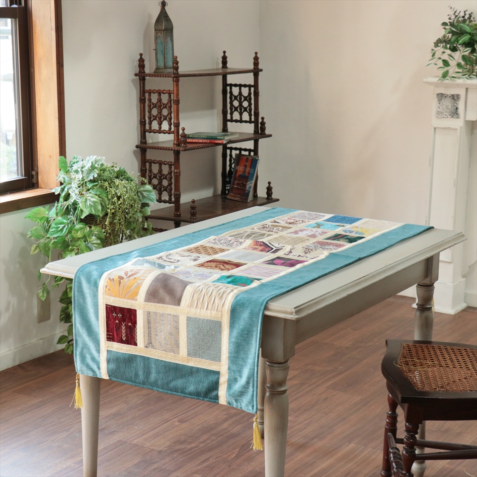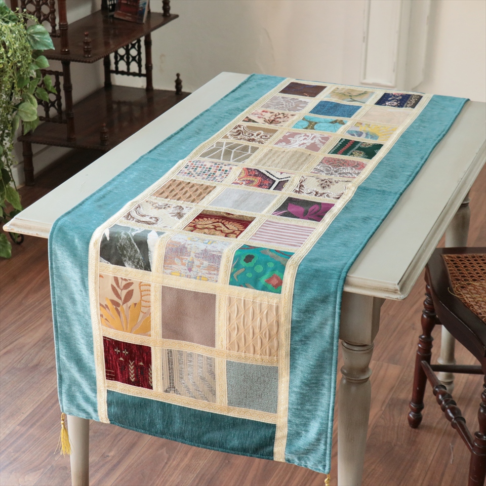 - テーブルランナー モザイクパッチワーク 142x50cmサイズ シュニール素材