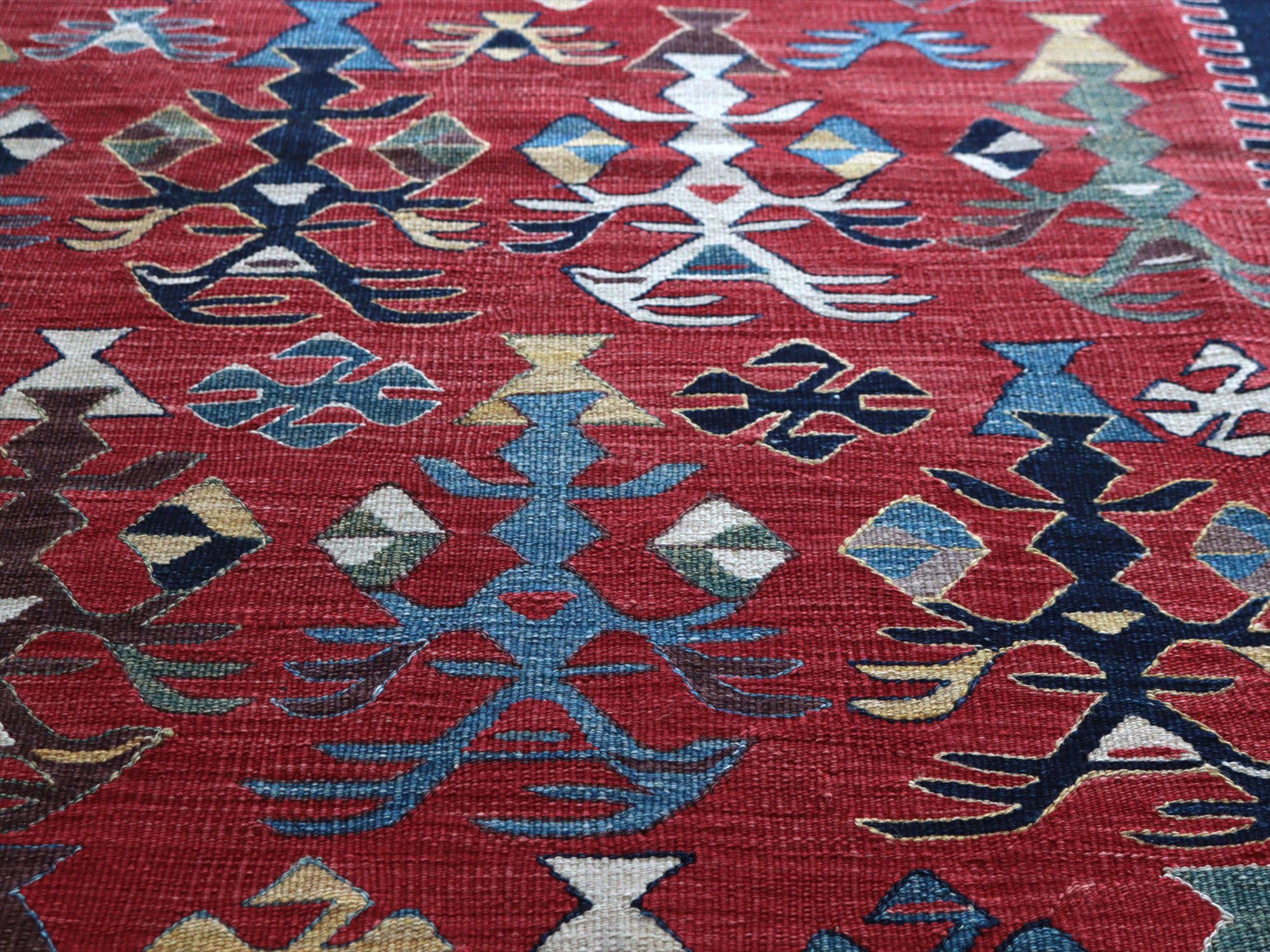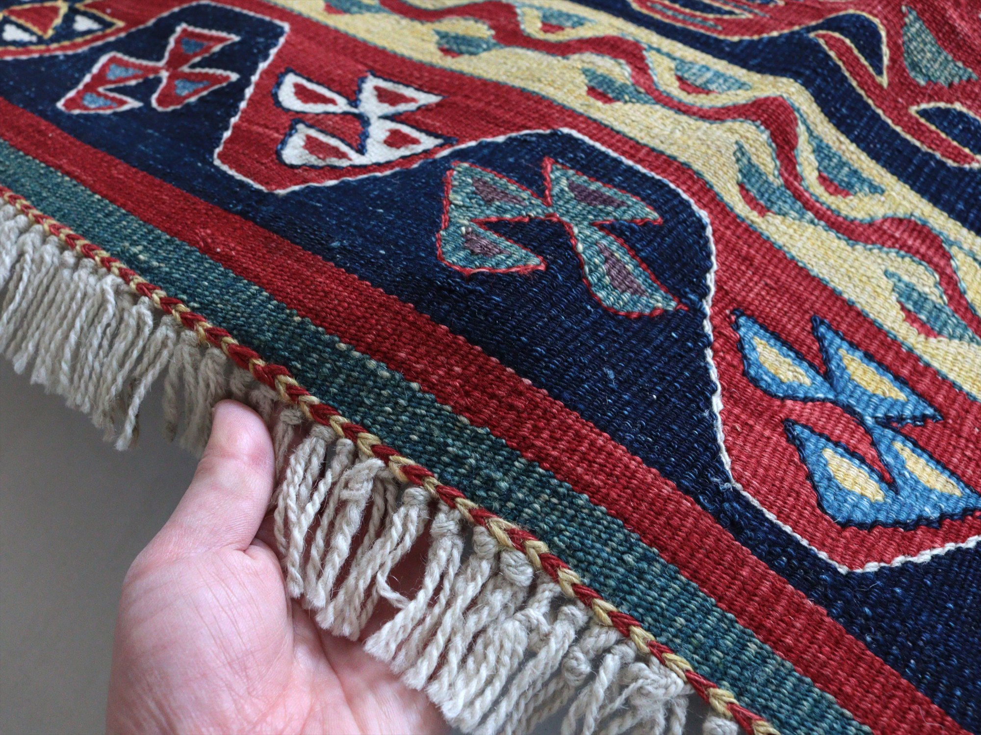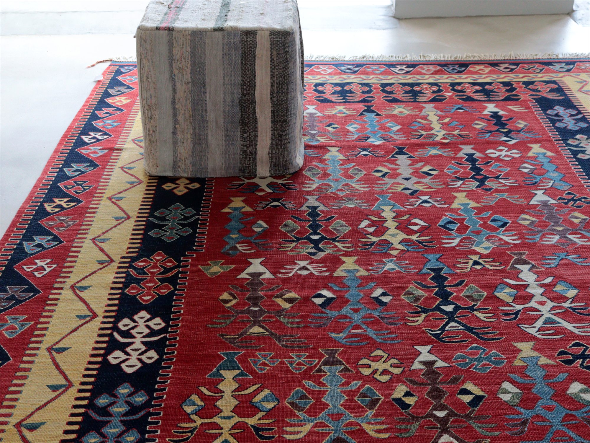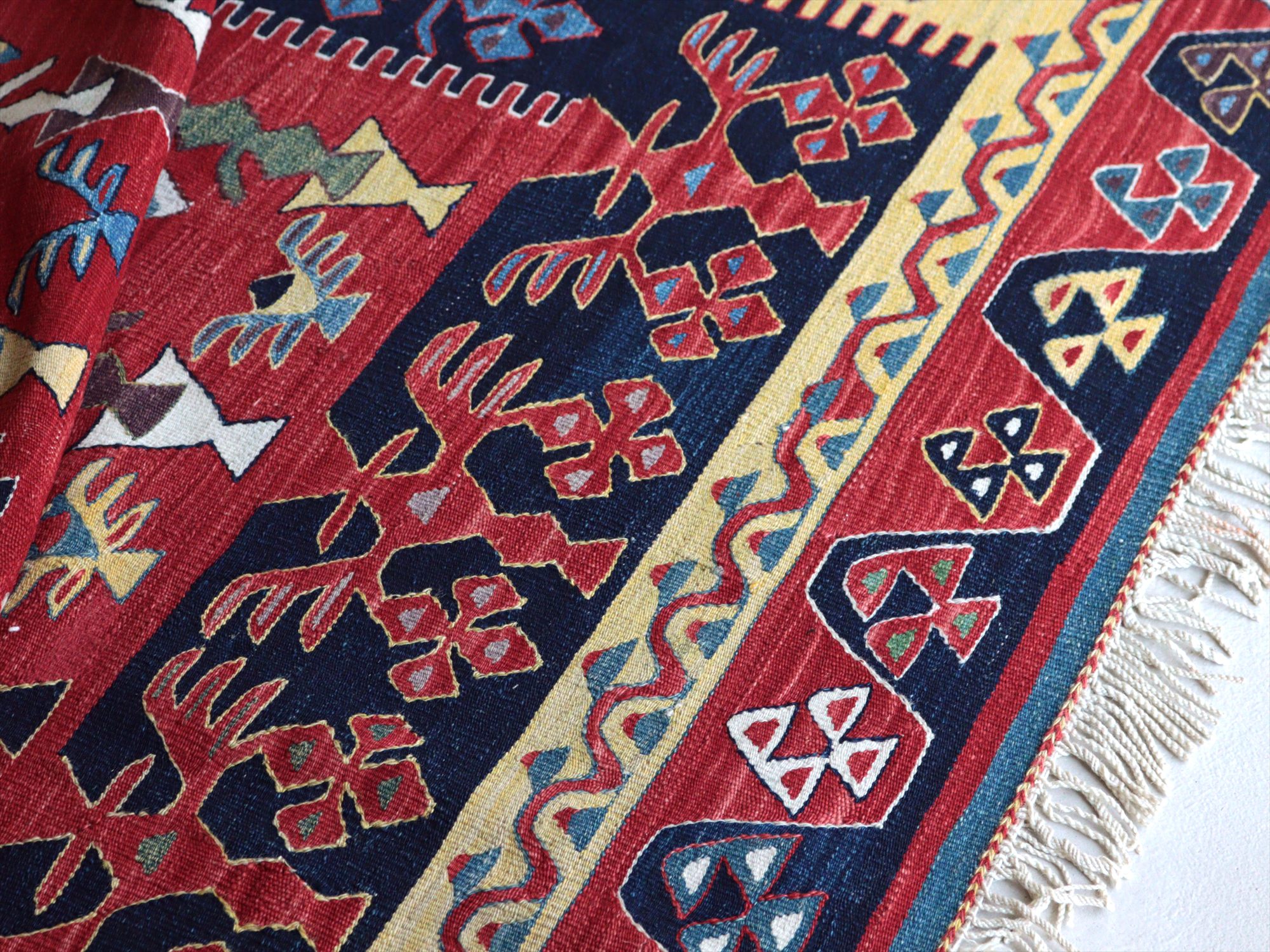 草木染の糸を用いて織られたシャルキョイ地方のリプロダクトキリム。レッド、イエロー、ネイビーを基調とした色使いでコントラストが効いていて、合成染料にはないやわらかな発色と、自然な色の深みが特徴的です。それぞれの幾何学模様やモチーフが丁寧に表現されていますが、ネイビーのボーダー(額縁)部分がずれて織られていて、そこから手織りらしいあたたかみも感じられます。