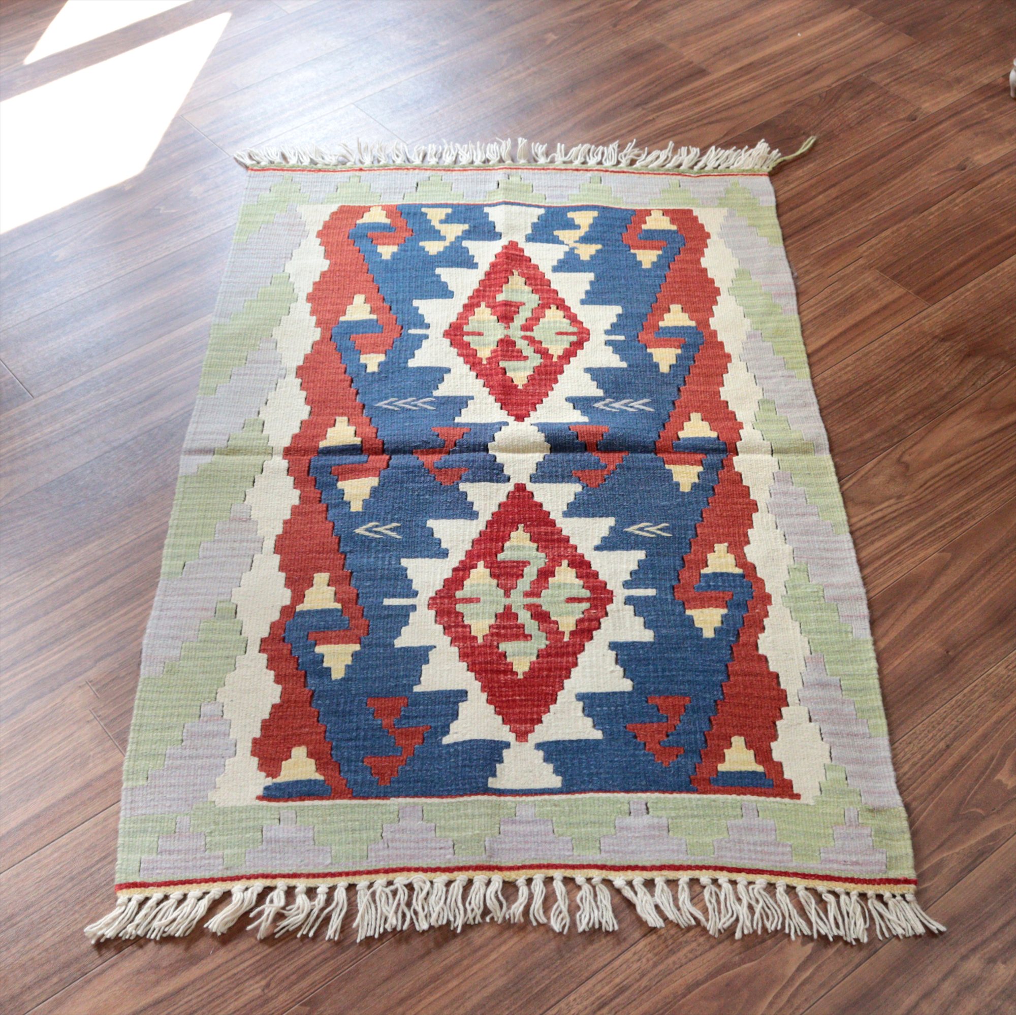 - カイセリ産手織りキリム122×82cm ブルー&レッド トルコの手織りラグ
