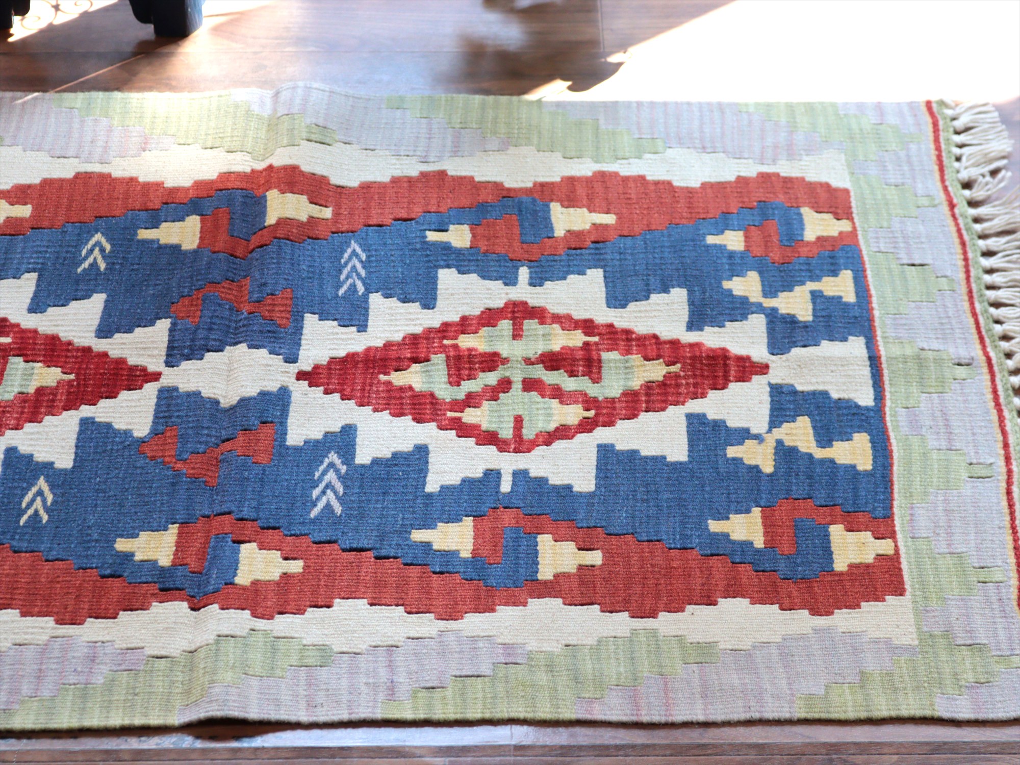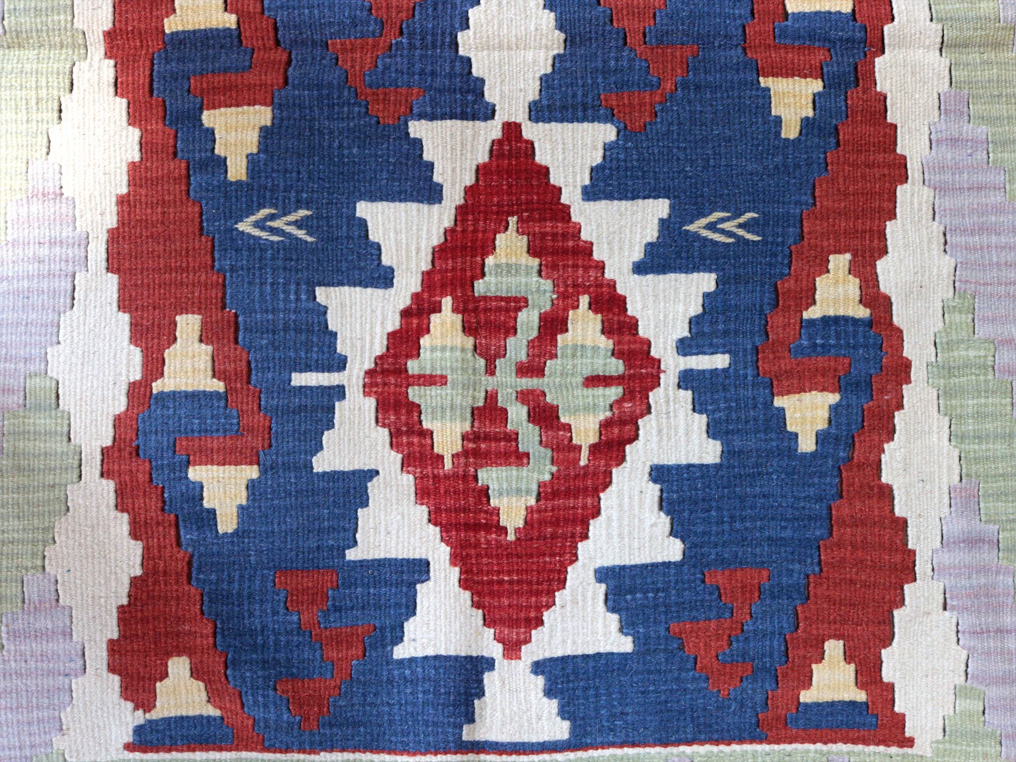 織り地がしなやかでやわらかいのがカイセリキリムの特徴です。やや厚みがあり、やさしい肌触り。色の切り替え部分には、キリムの織りの特徴で、縦に隙間が開いています(スリットと呼んでいます)。