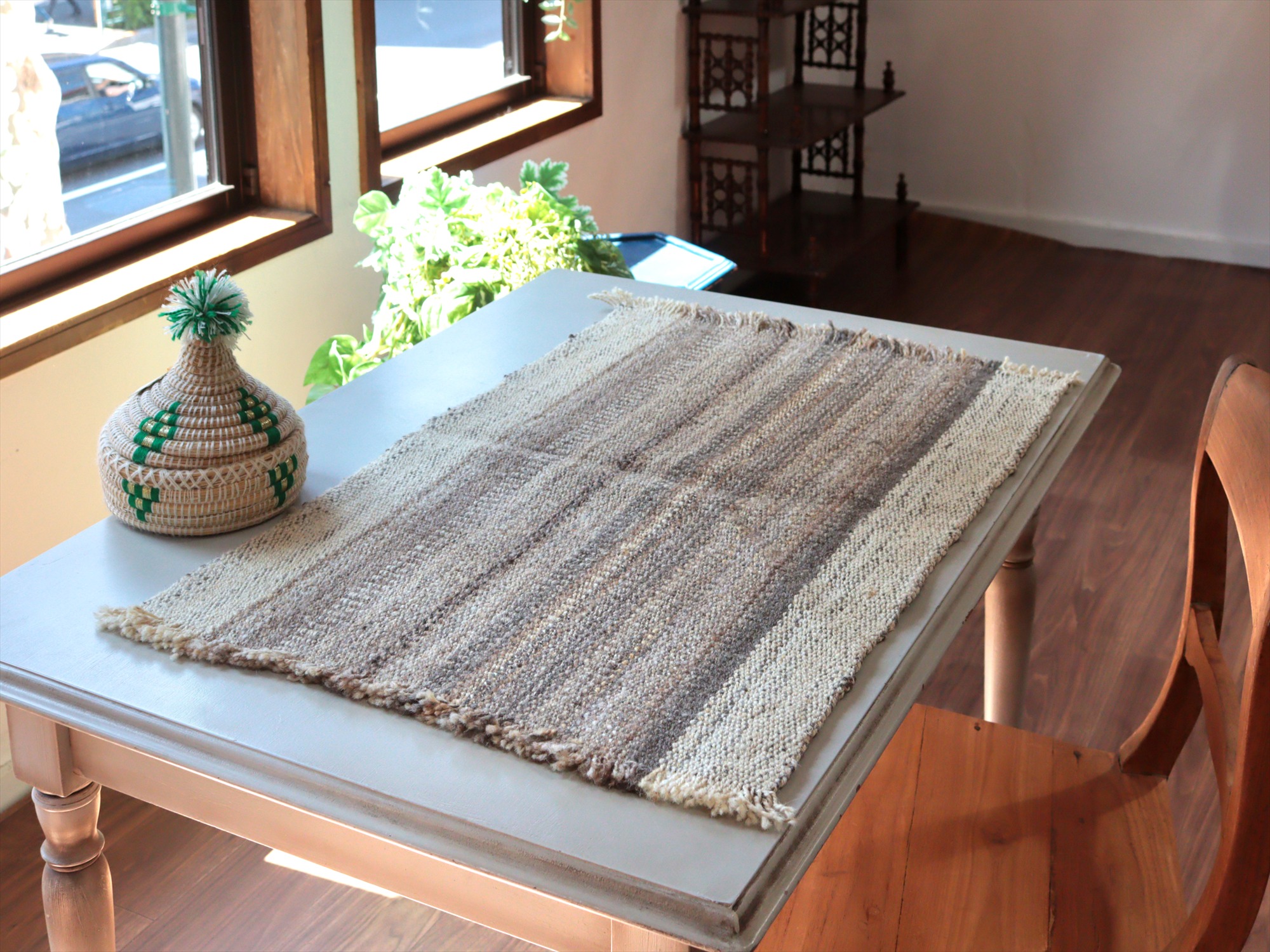 トルコ北東部、カルス地方で織られたキリム。アイボリーとブラウン、グレーの組み合わせで、ストライプが表現されたシンプルなデザイン。