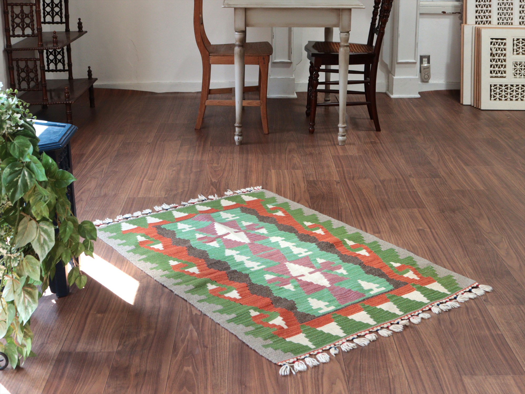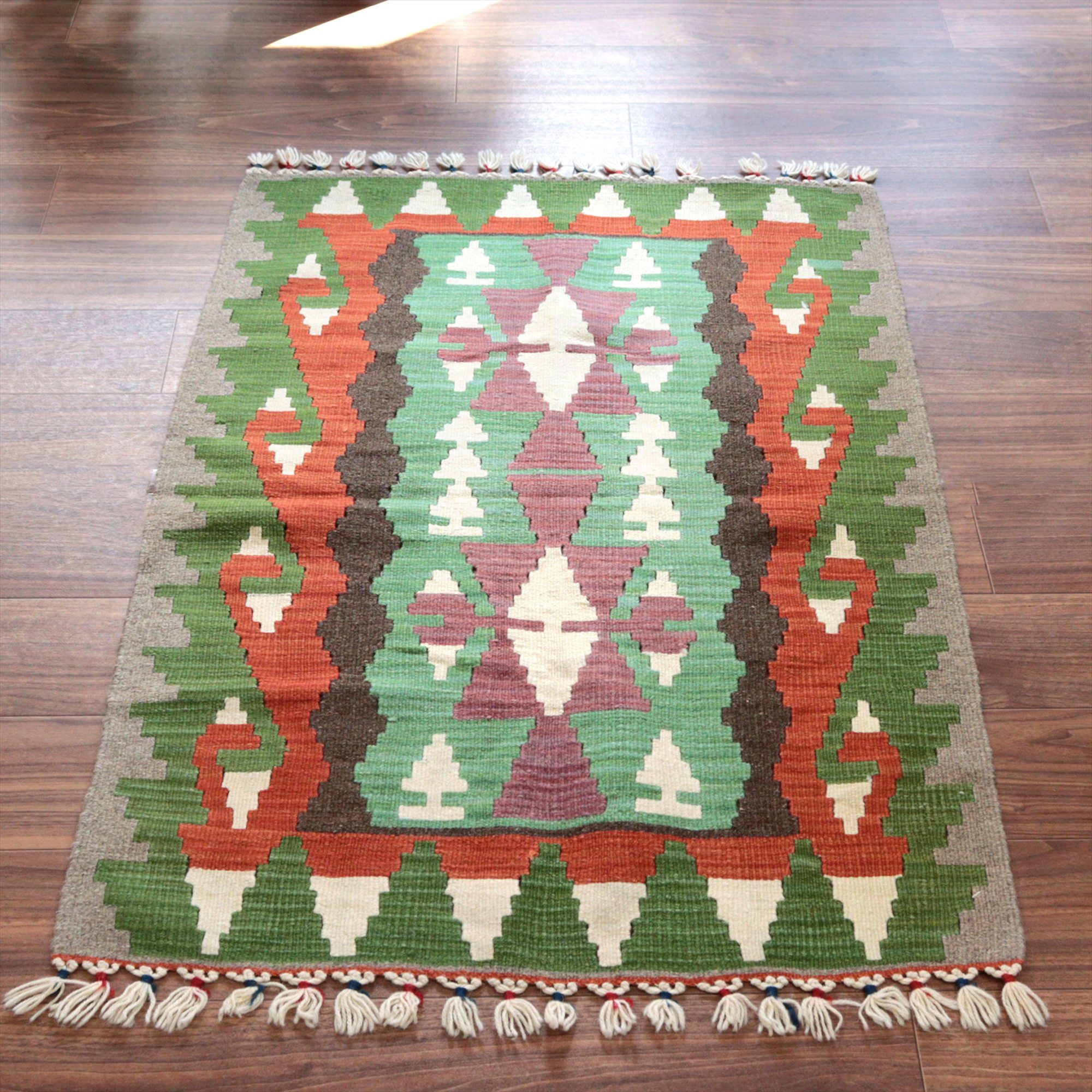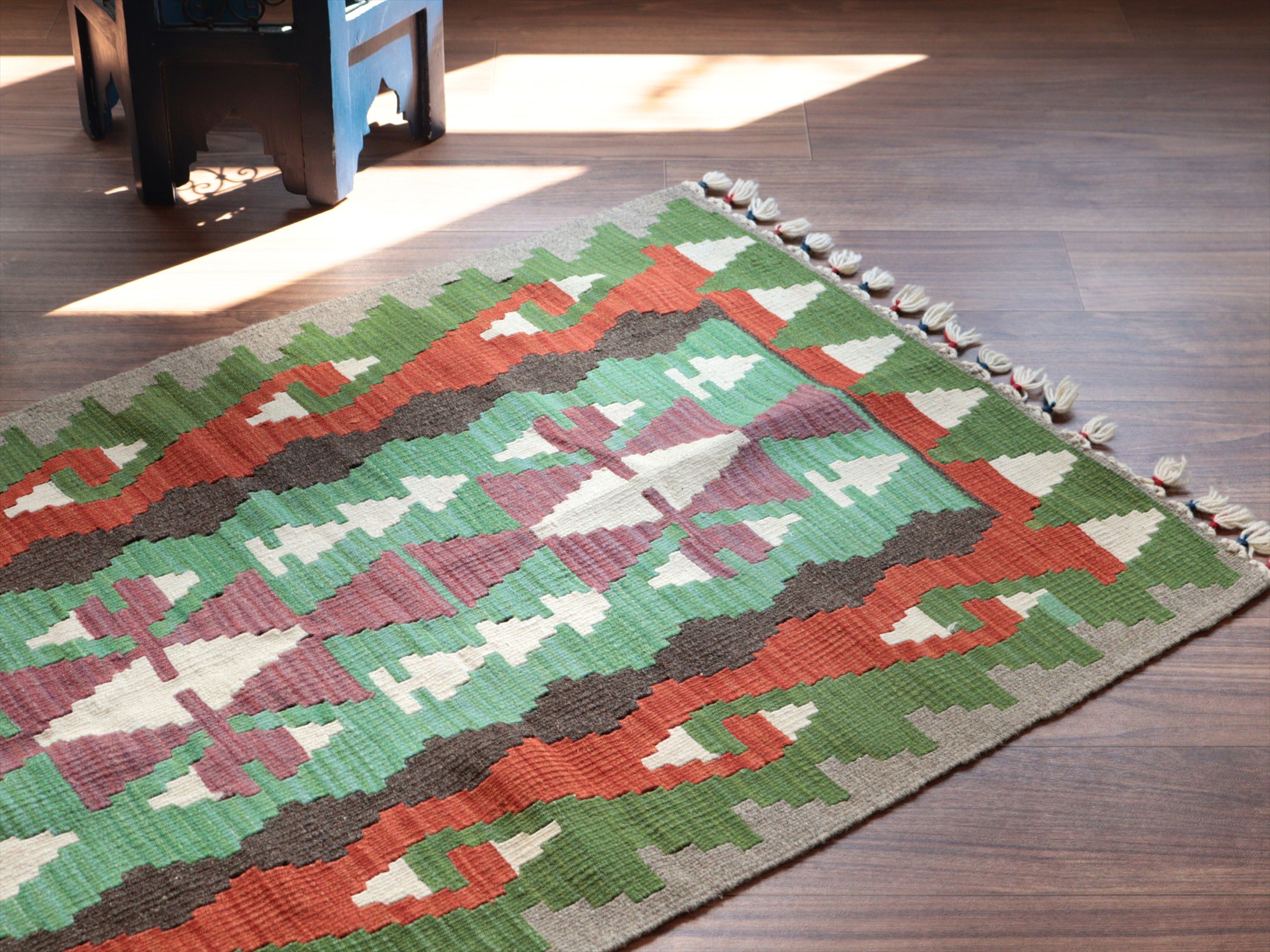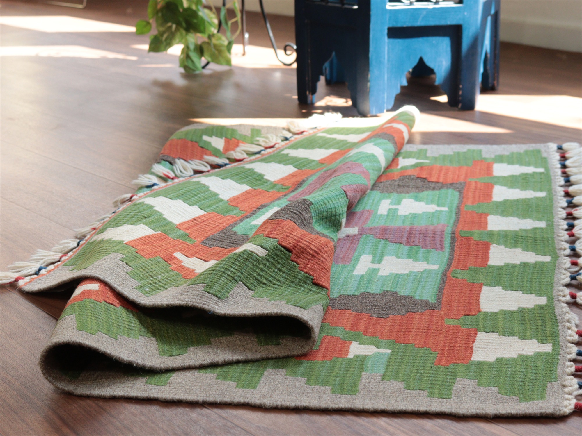 - カイセリ産手織りキリム116×82cm グリーン&オレンジ トルコの手織りラグ