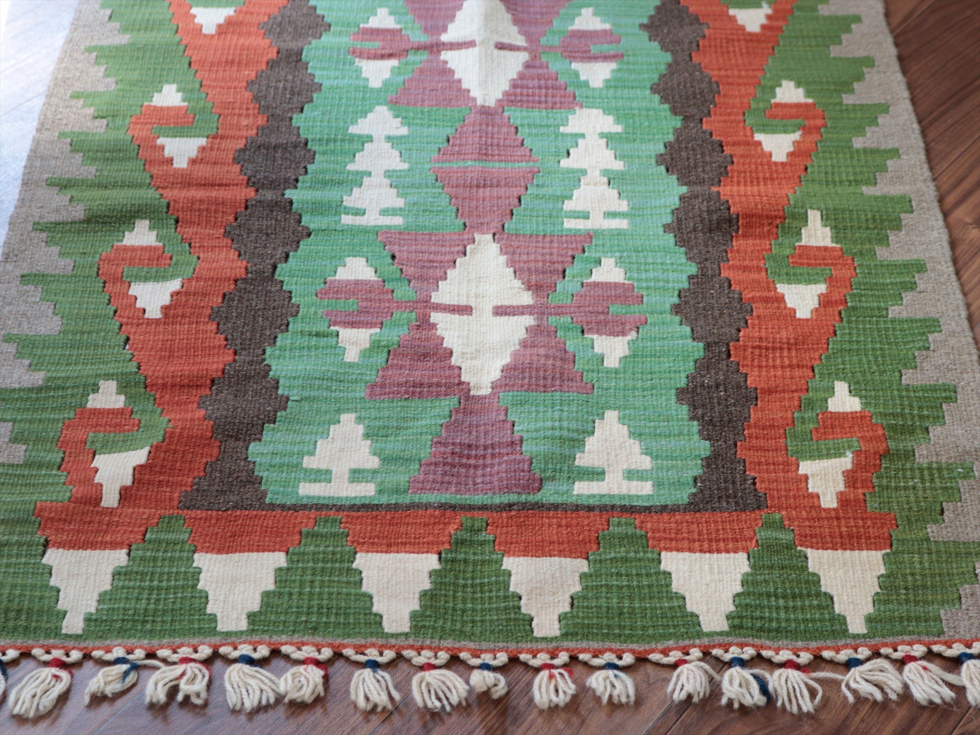 カイセリ産手織りキリム116×82cm グリーン&オレンジ トルコの手織りラグ