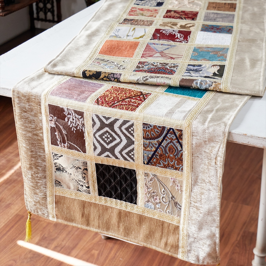 - テーブルランナー モザイクパッチワーク 200x50cmサイズ シュニール素材