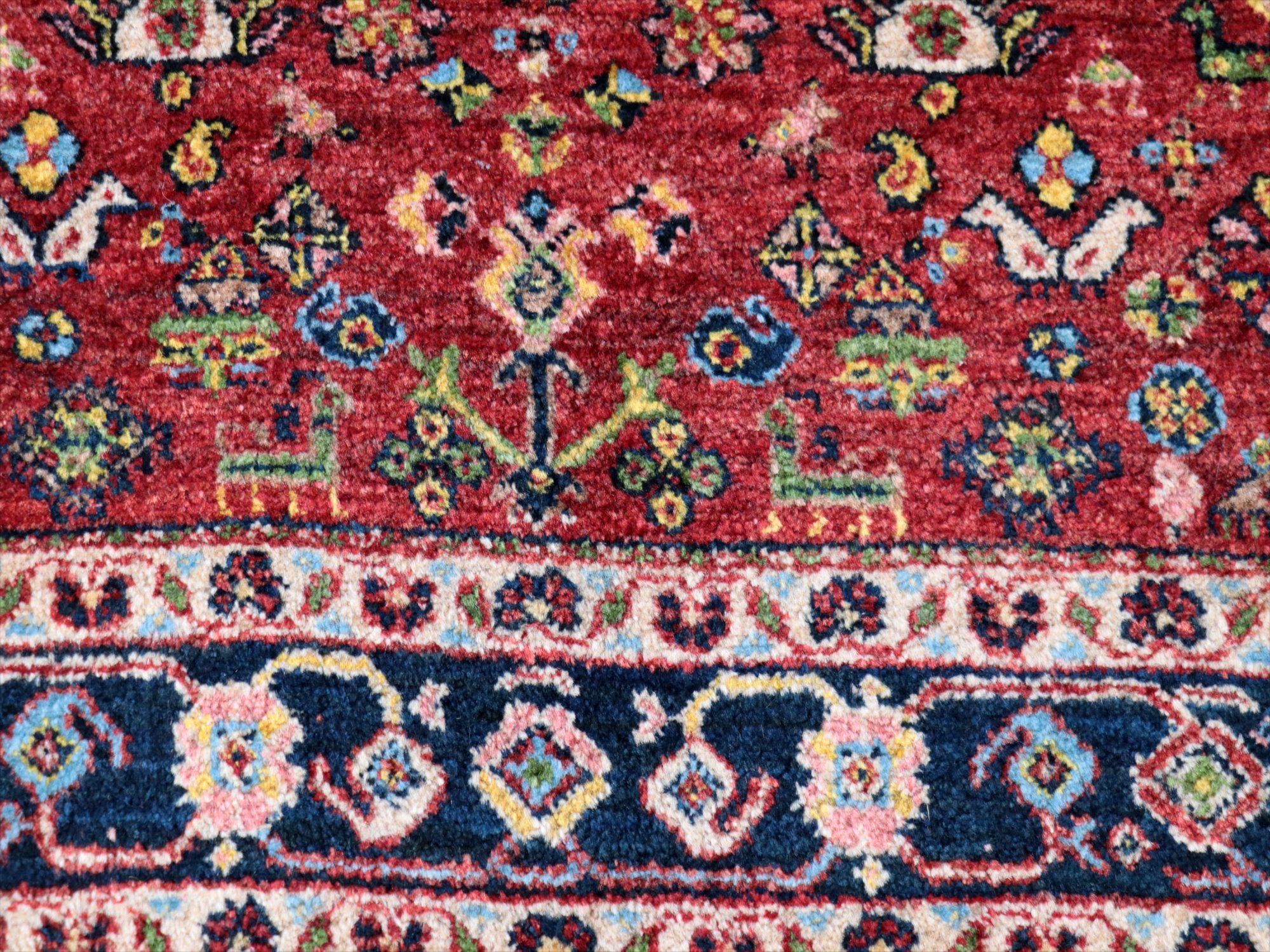 天然の染料を用いた草木染めの美しい色合いと、熟練した職人が織りなすカシュガイ族の伝統柄をいかしたクラシックデザイン。10cmの間に50前後の結び目のある、繊細かつ細やかな最上級の織り。毛足を櫛で何度もかきだして、繰り返し洗浄する事で遊び毛を取り除いたり、手間と時間をかけた最後まで妥協のないこだわり仕上げ。