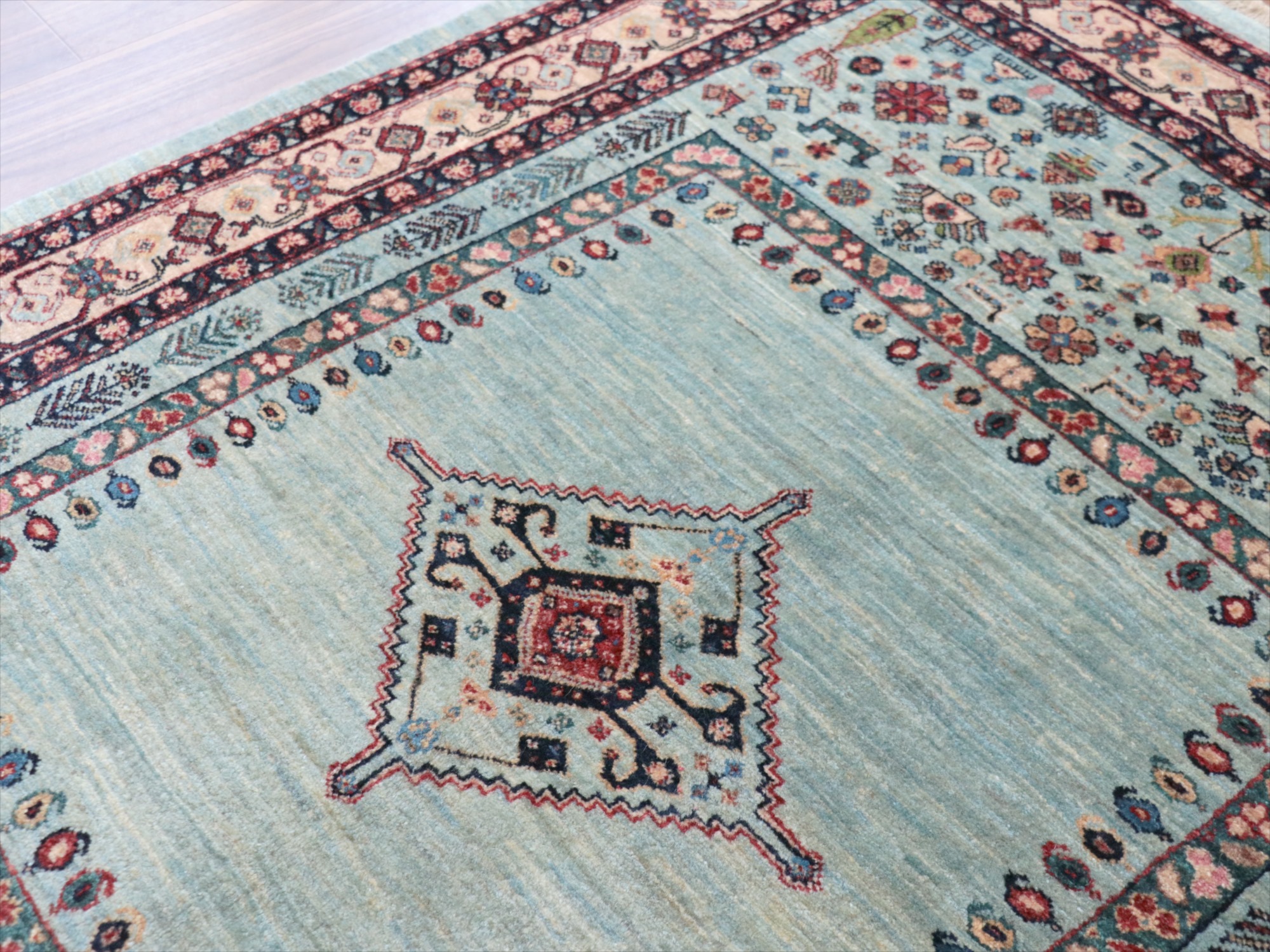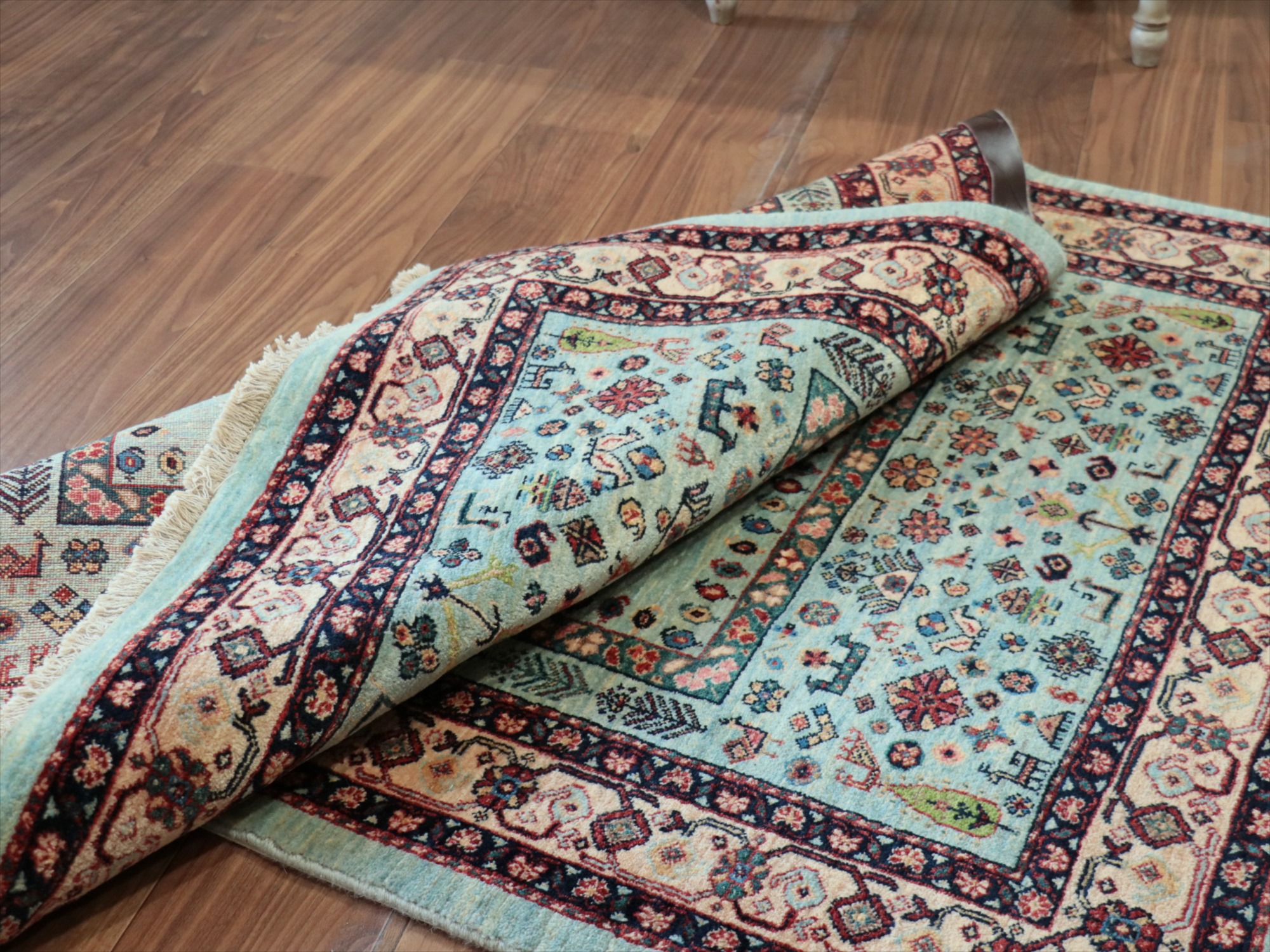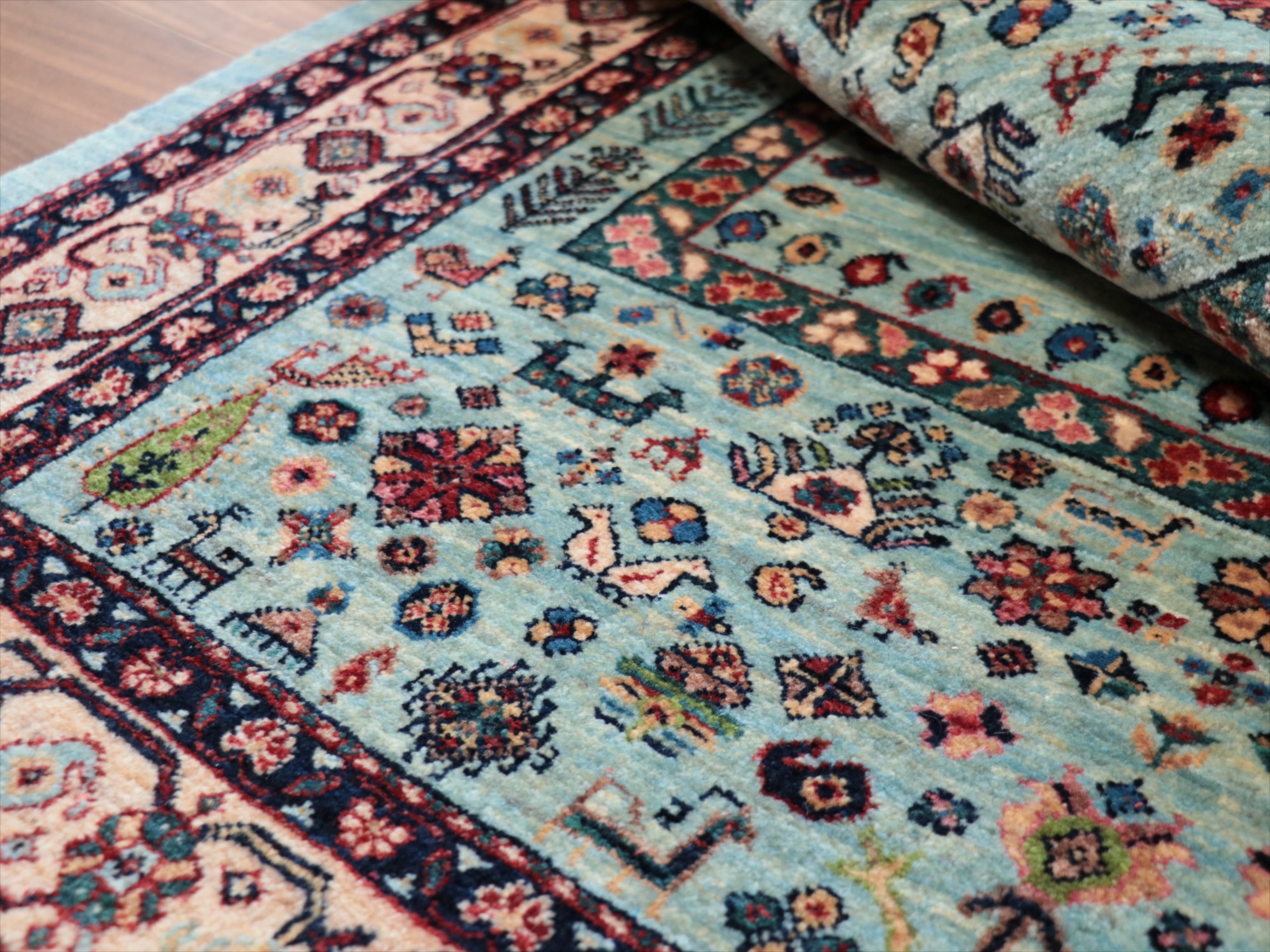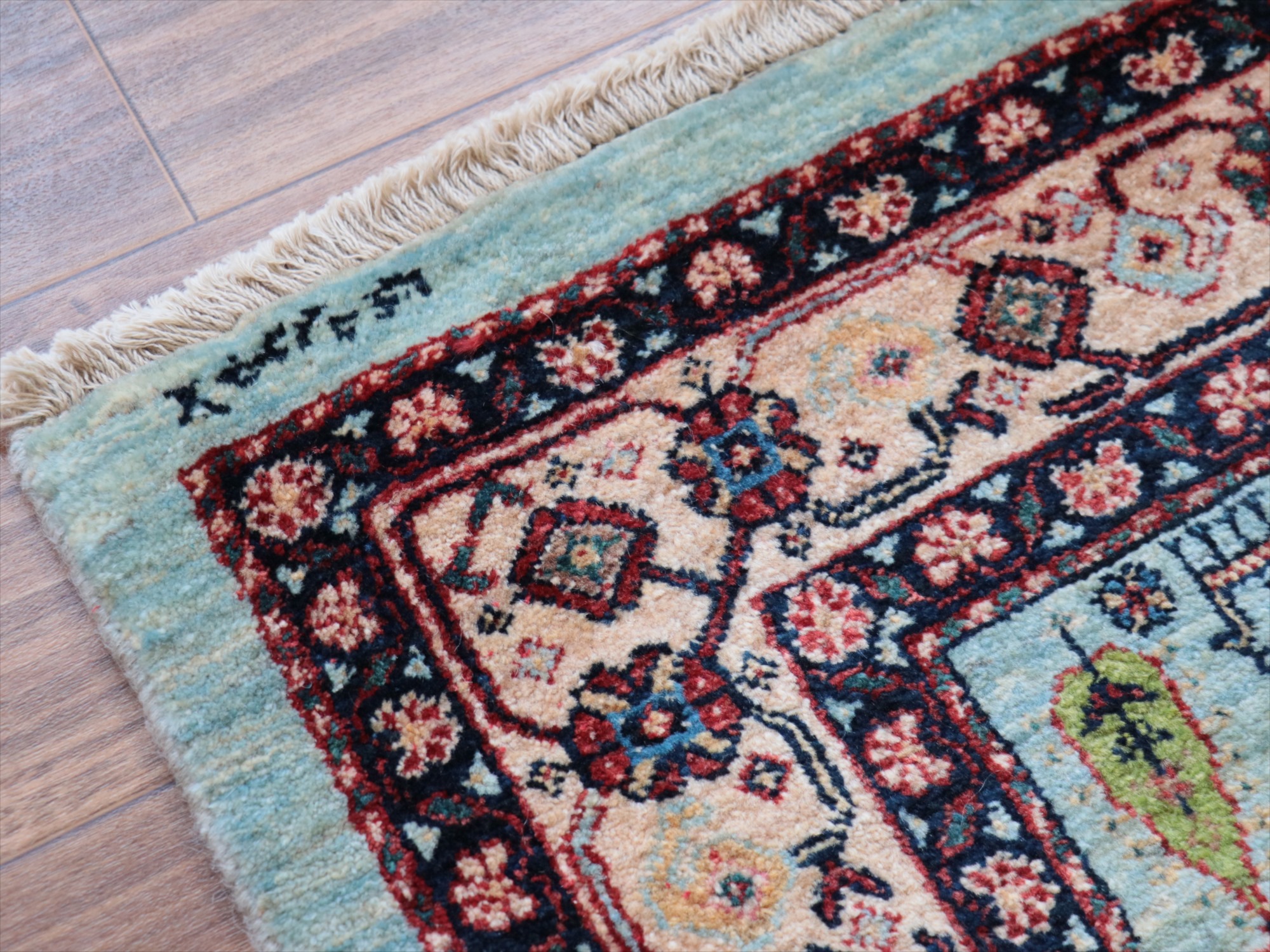光沢のある美しいトルコブルーに、無染色の羊毛のアイボリーの額縁のクラシックデザイン。密度の高い織りで、草花や鳥、ペイズリーのモチーフが細かく表現されています。