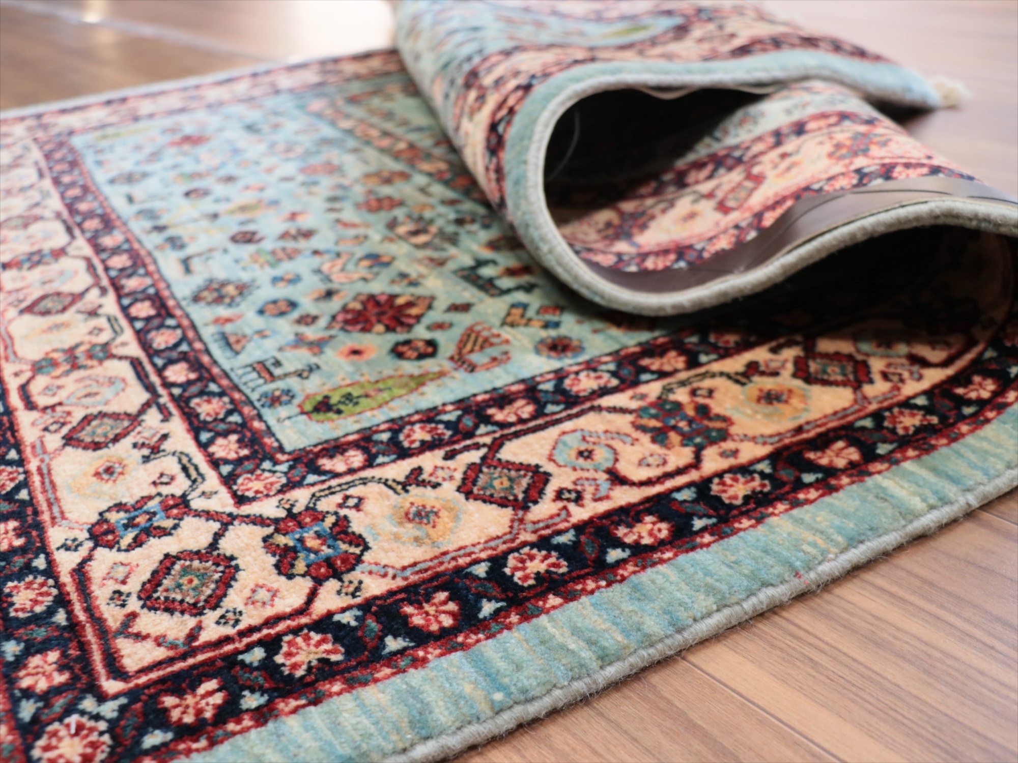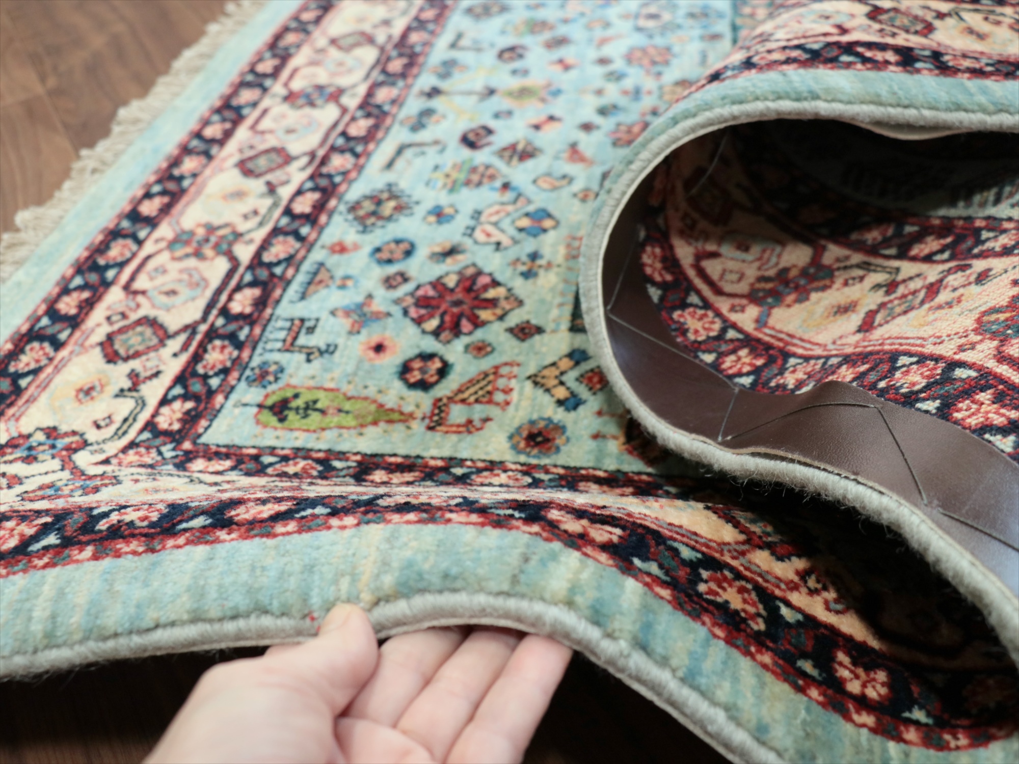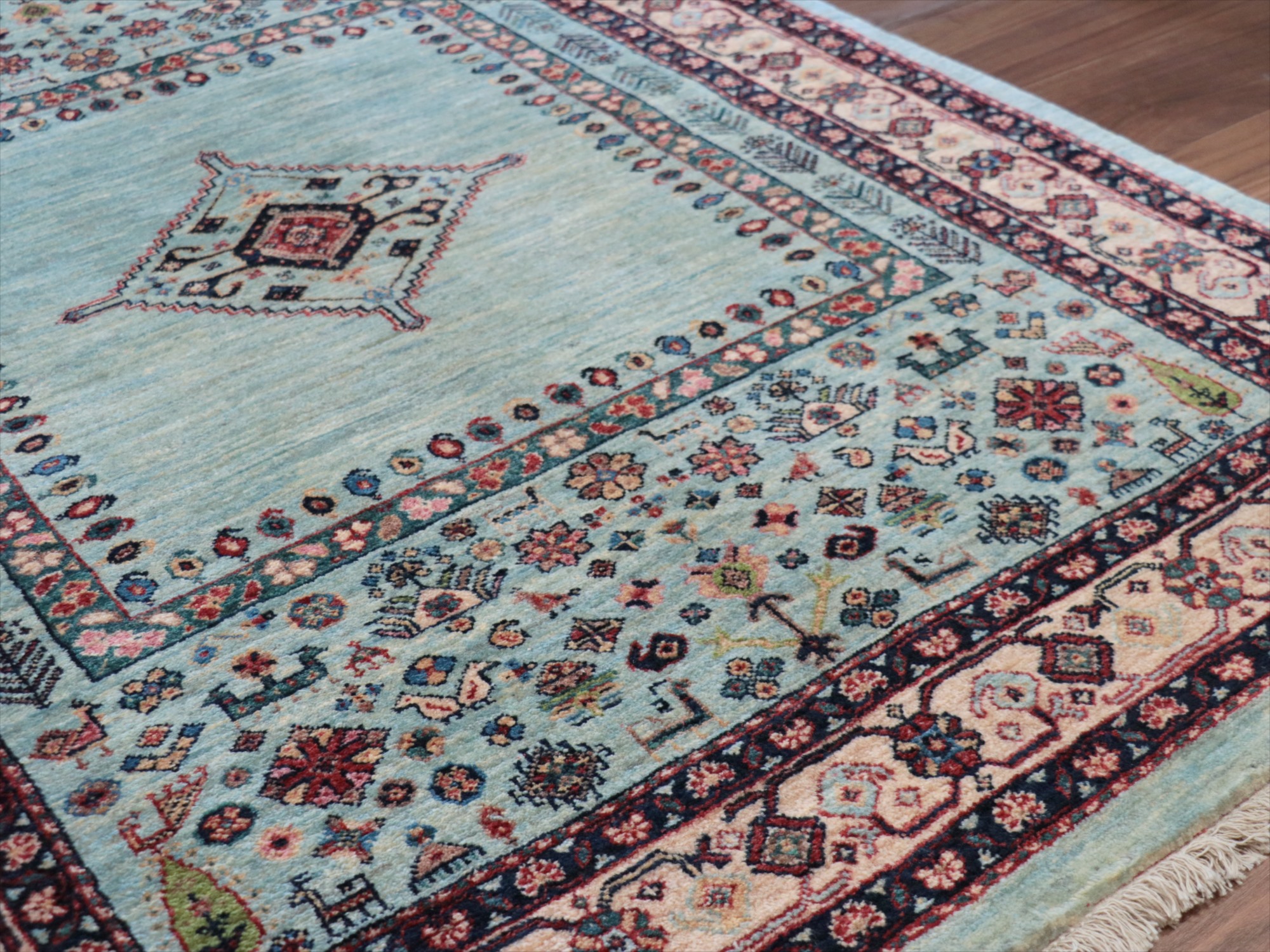 光沢のある美しいトルコブルーに、無染色の羊毛のアイボリーの額縁のクラシックデザイン。密度の高い織りで、草花や鳥、ペイズリーのモチーフが細かく表現されています。