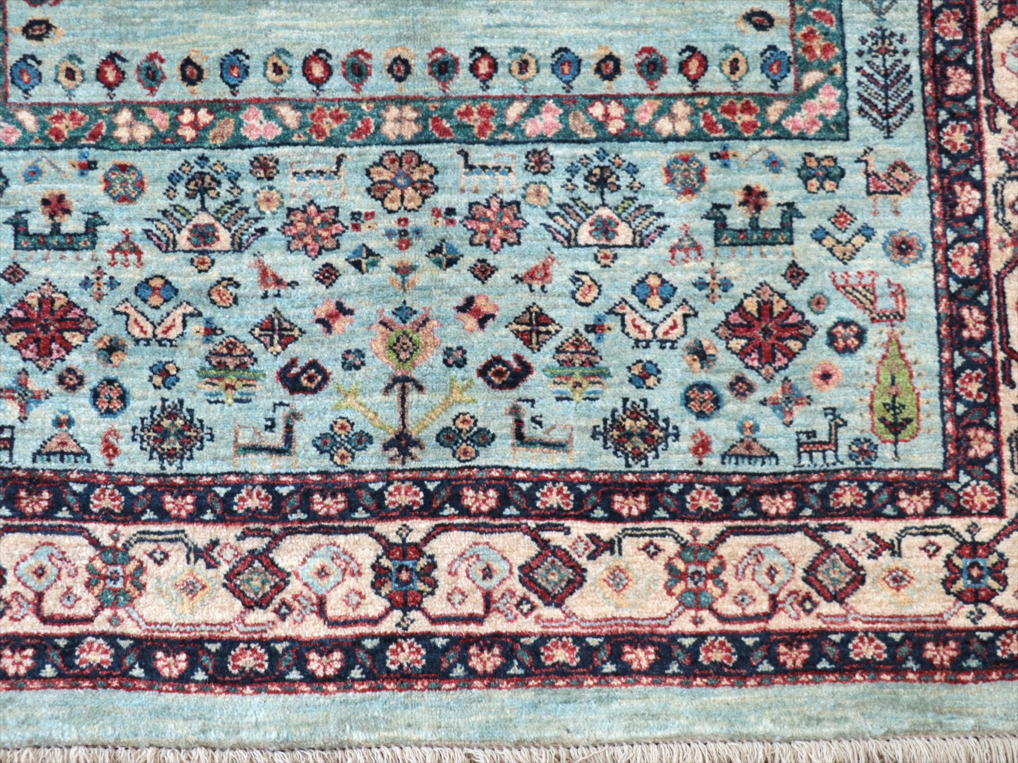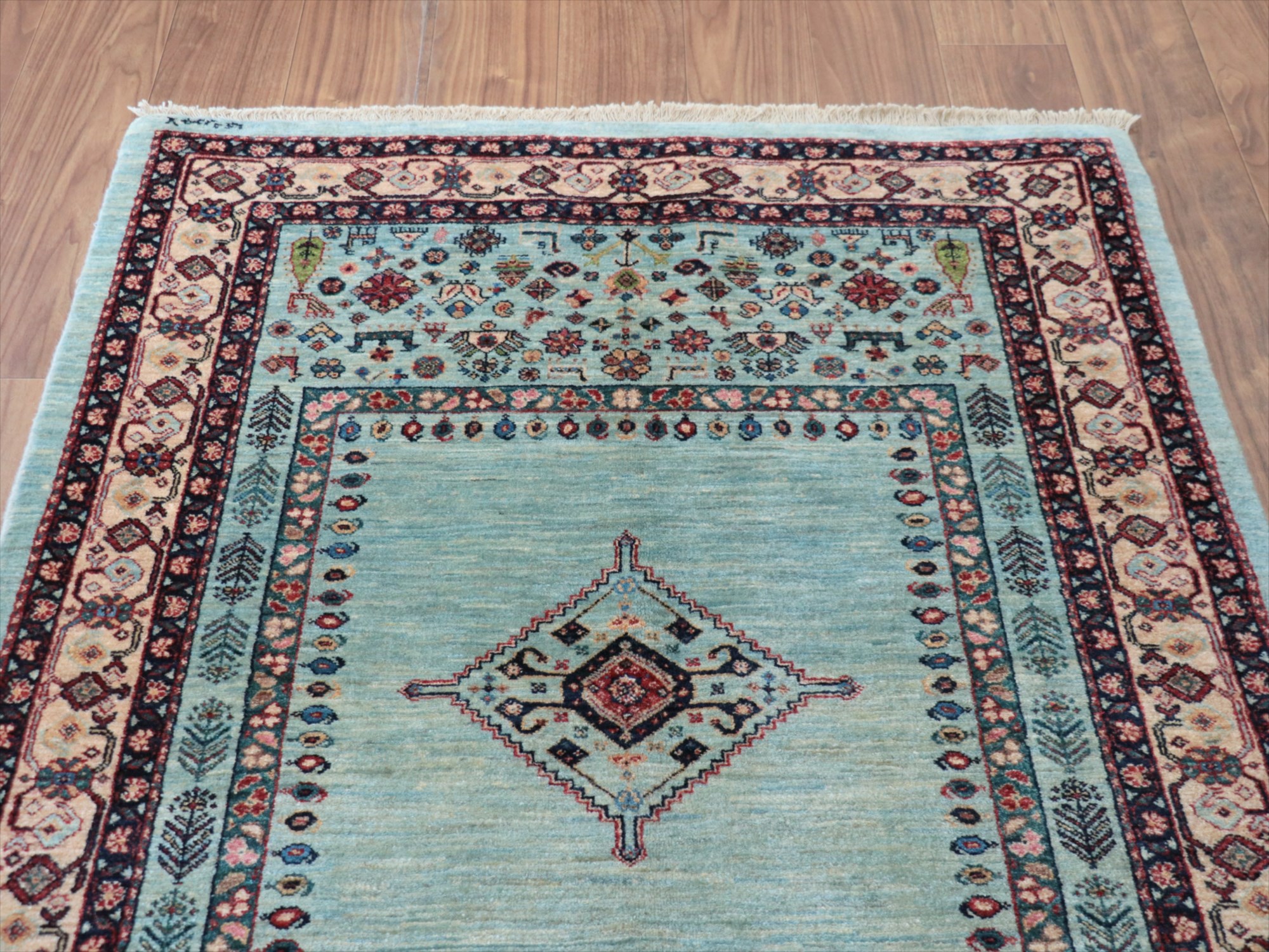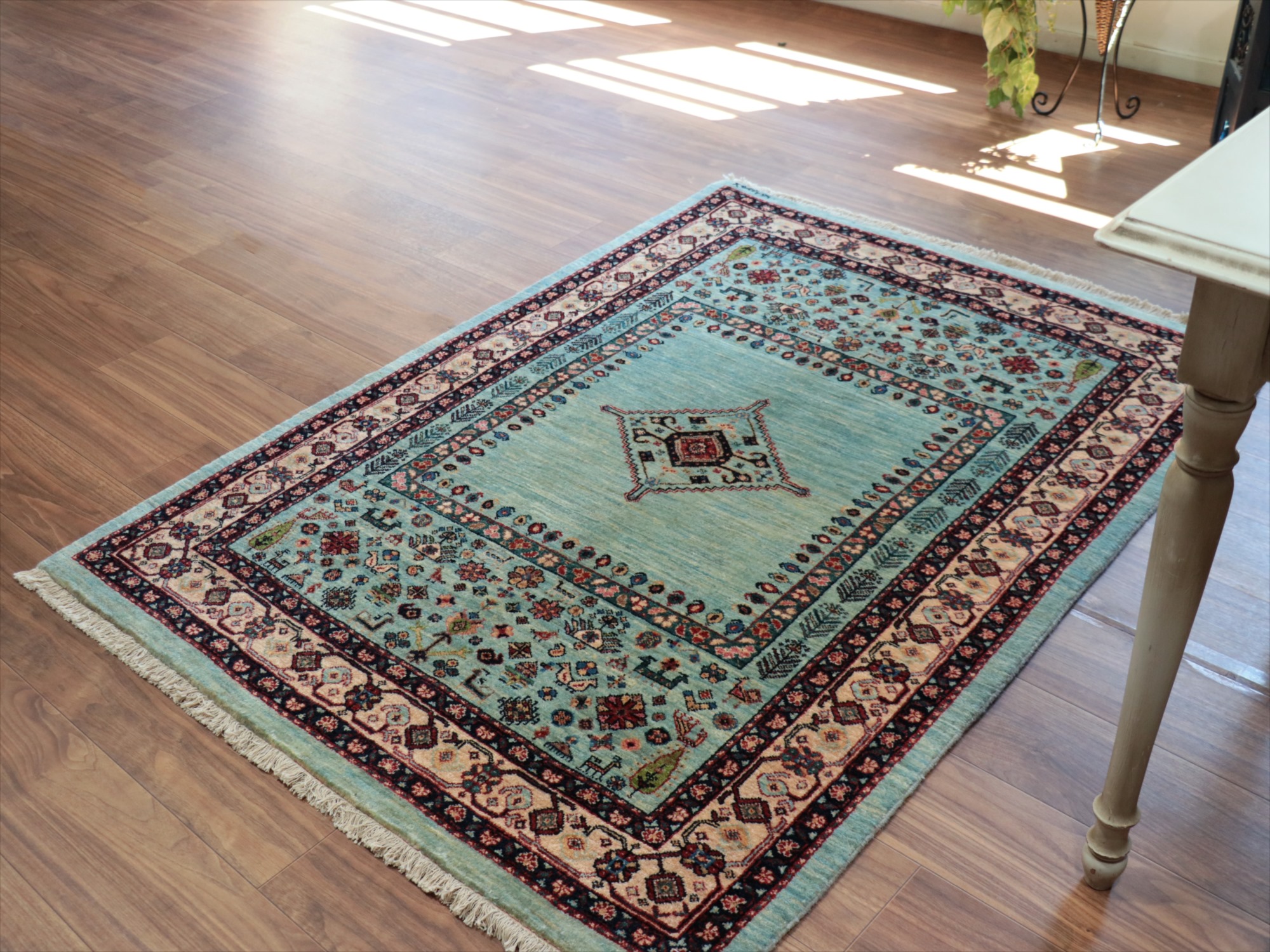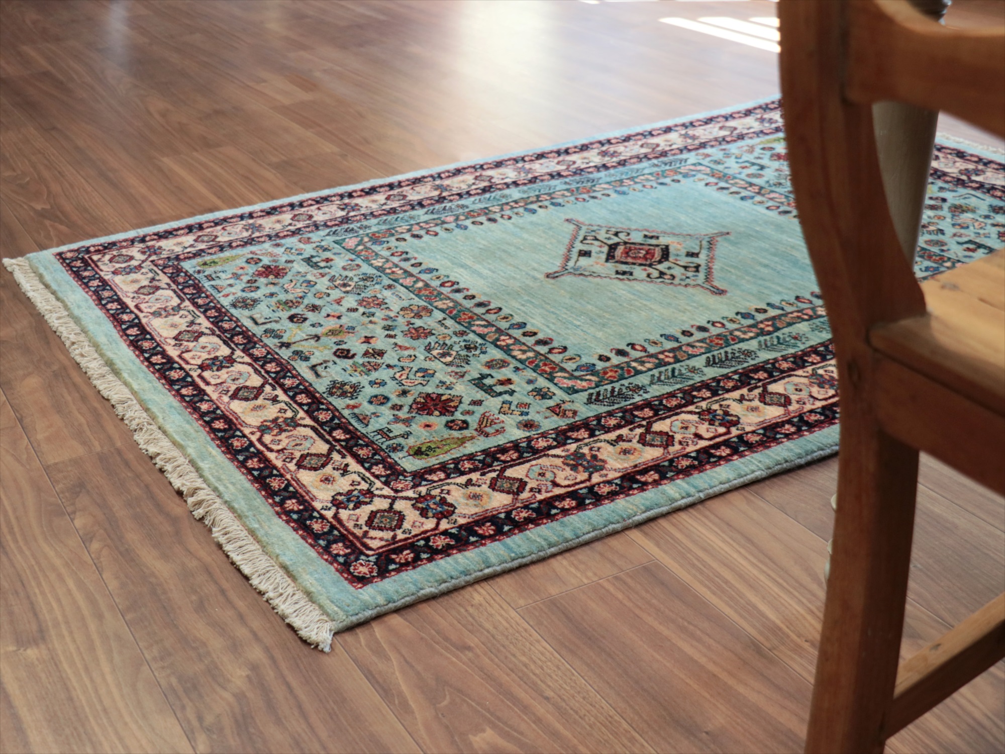 光沢のある美しいトルコブルーに、無染色の羊毛のアイボリーの額縁のクラシックデザイン。密度の高い織りで、草花や鳥、ペイズリーのモチーフが細かく表現されています。