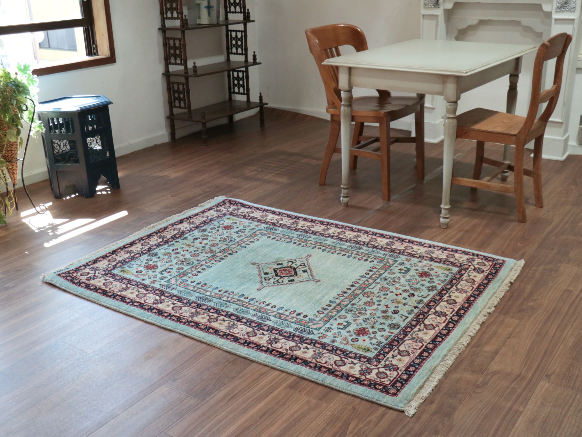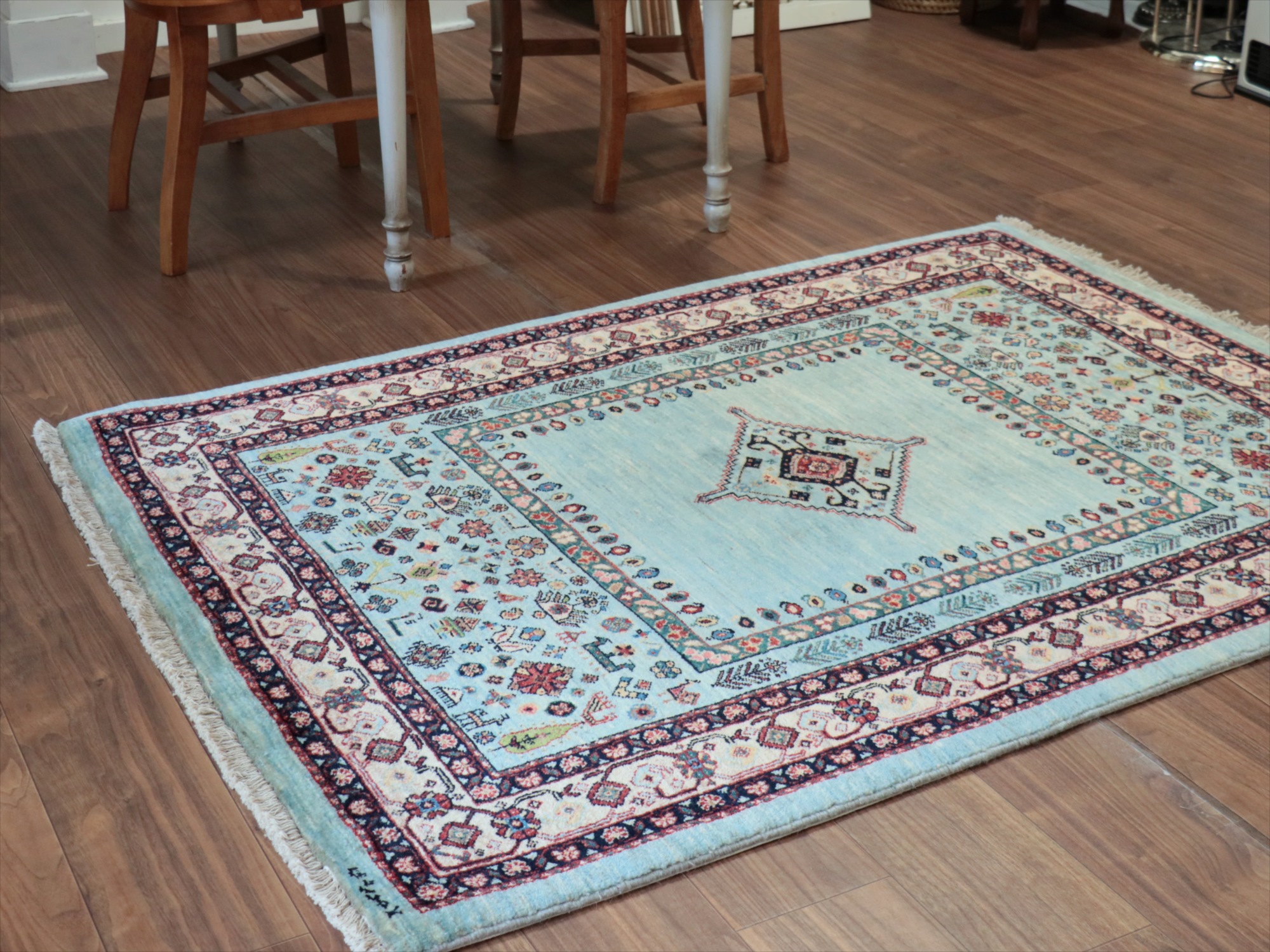 - ギャッベ Luribaft/ルリバフ 152x113cm ペールブルー 小花と幾何学モチーフ