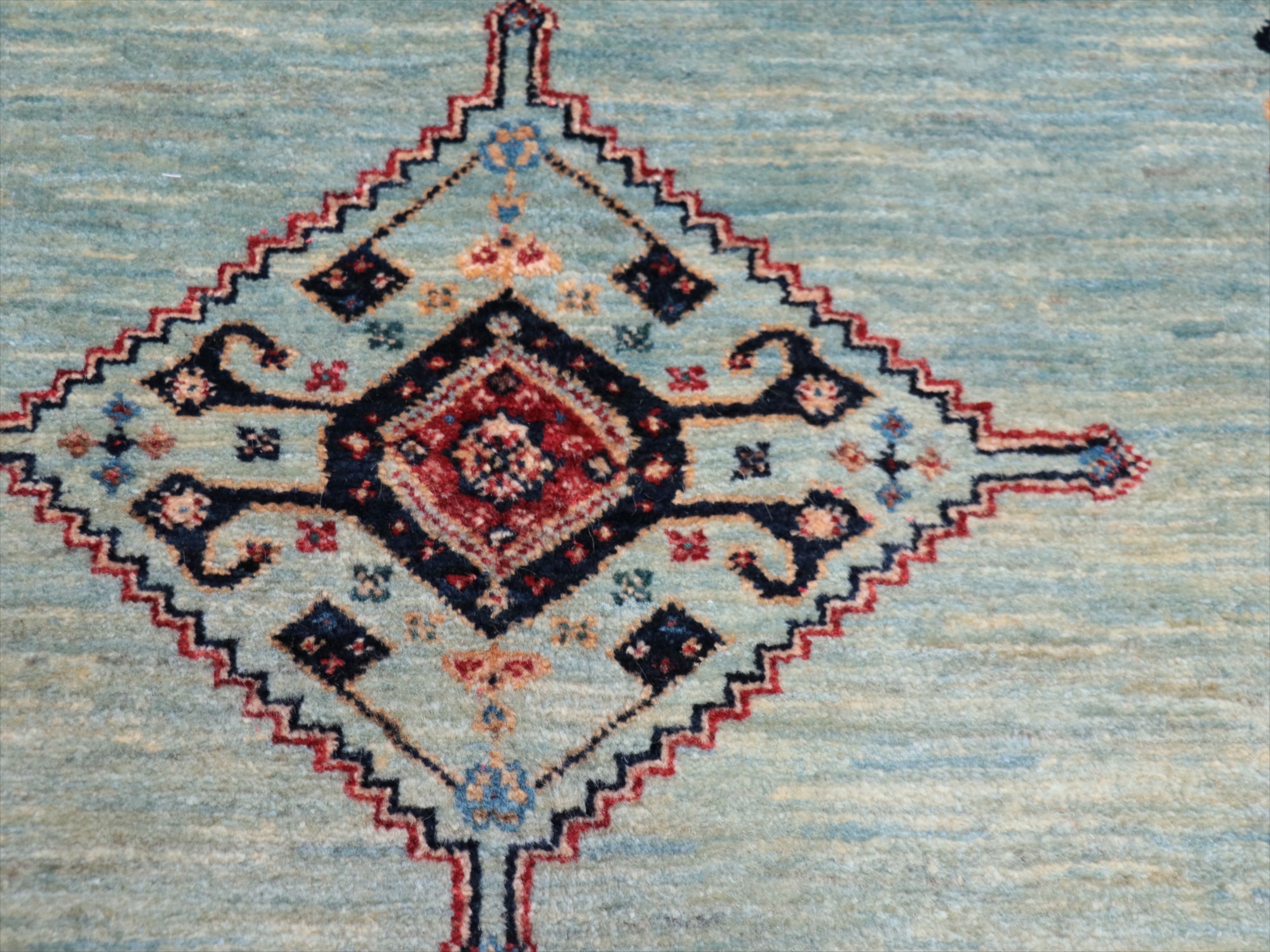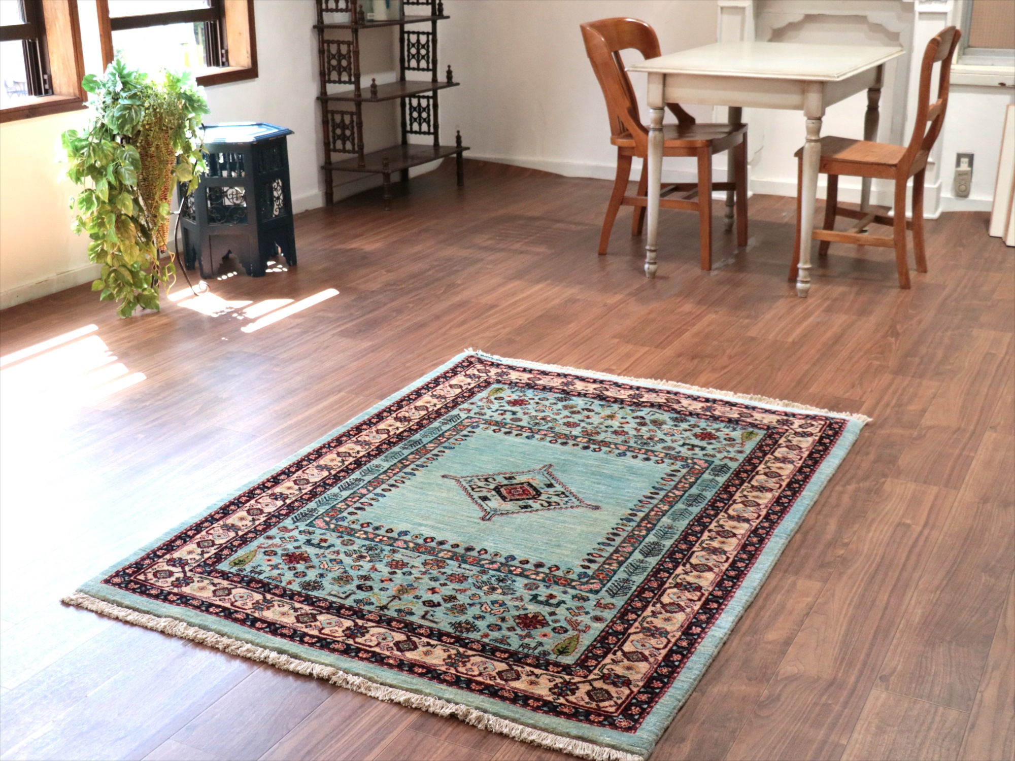 天然の染料を用いた草木染めの美しい色合いと、熟練した職人が織りなすカシュガイ族の伝統柄をいかしたクラシックデザイン。10cmの間に50前後の結び目のある、繊細かつ細やかな最上級の織り。毛足を櫛で何度もかきだして、繰り返し洗浄する事で遊び毛を取り除いたり、手間と時間をかけた最後まで妥協のないこだわり仕上げ。