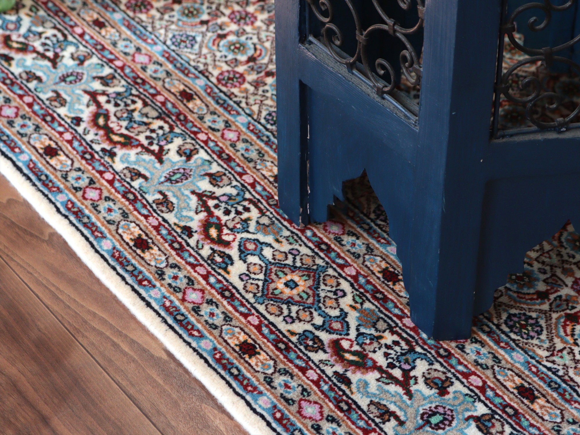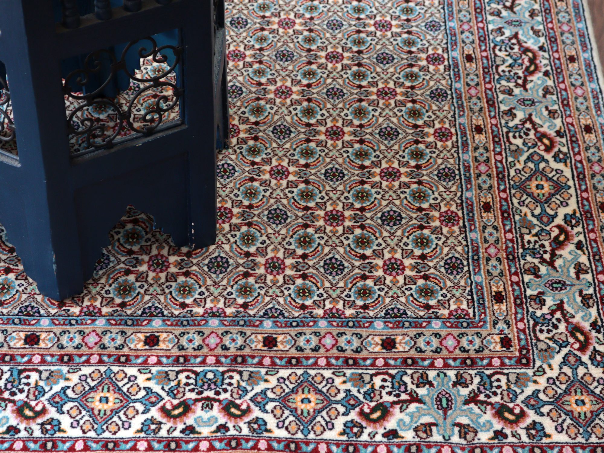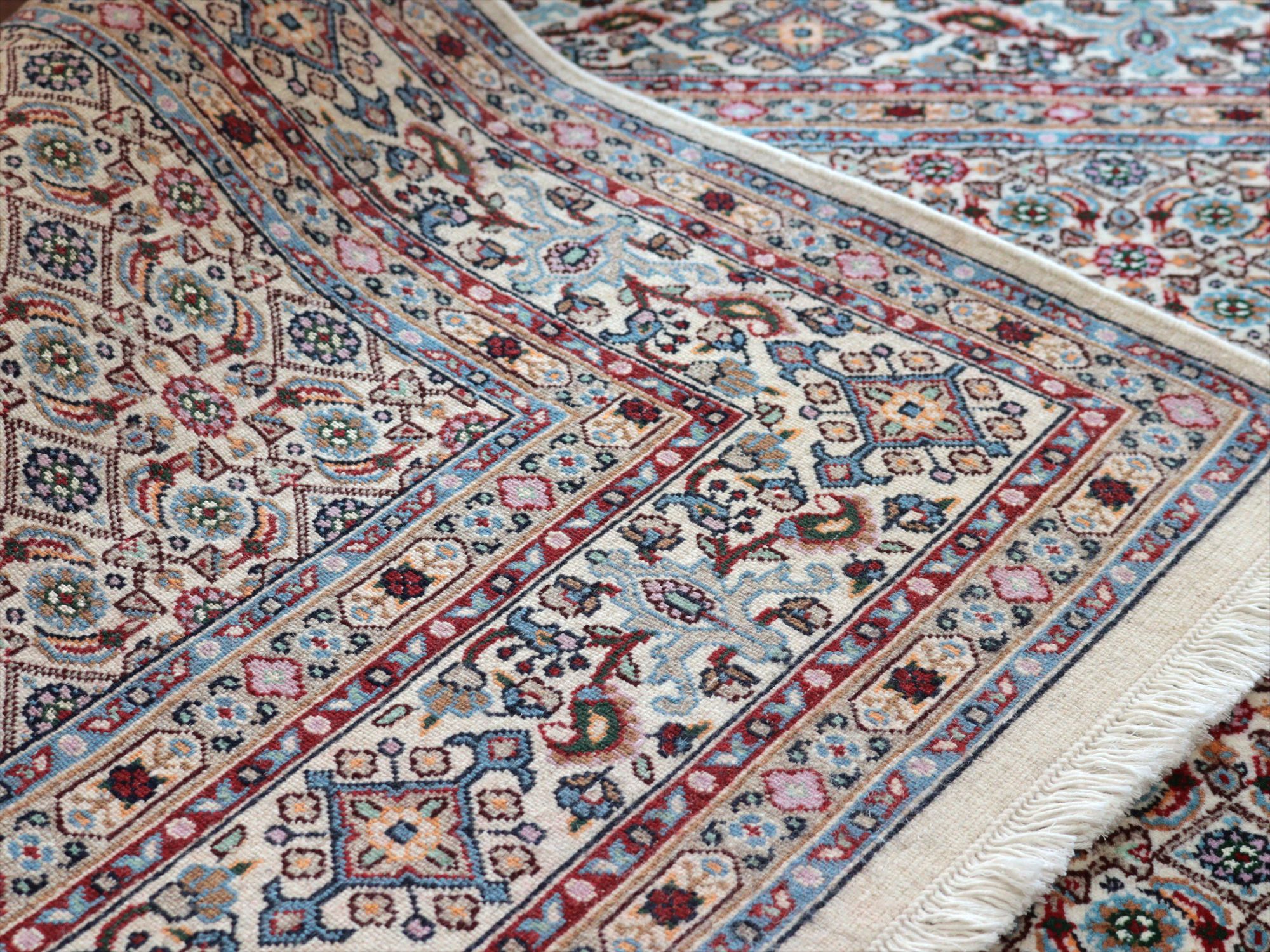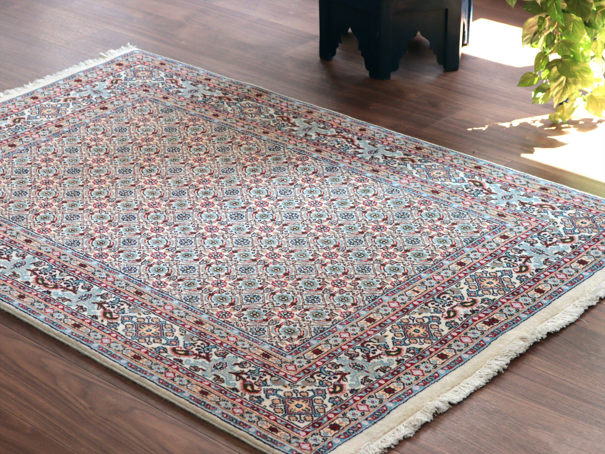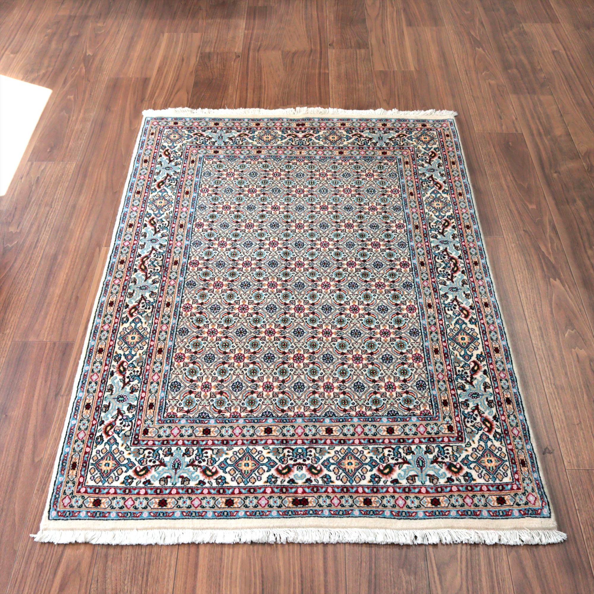 アイボリーをベースに、主にグリーンの色糸を使い細かな小花文様が織り込まれたムード産の手織り絨毯。イラン東部からアフガニスタンにも一般に見られるヘラート文様で、小さな花びらの形はマヒ(魚)と表現されることもあります。