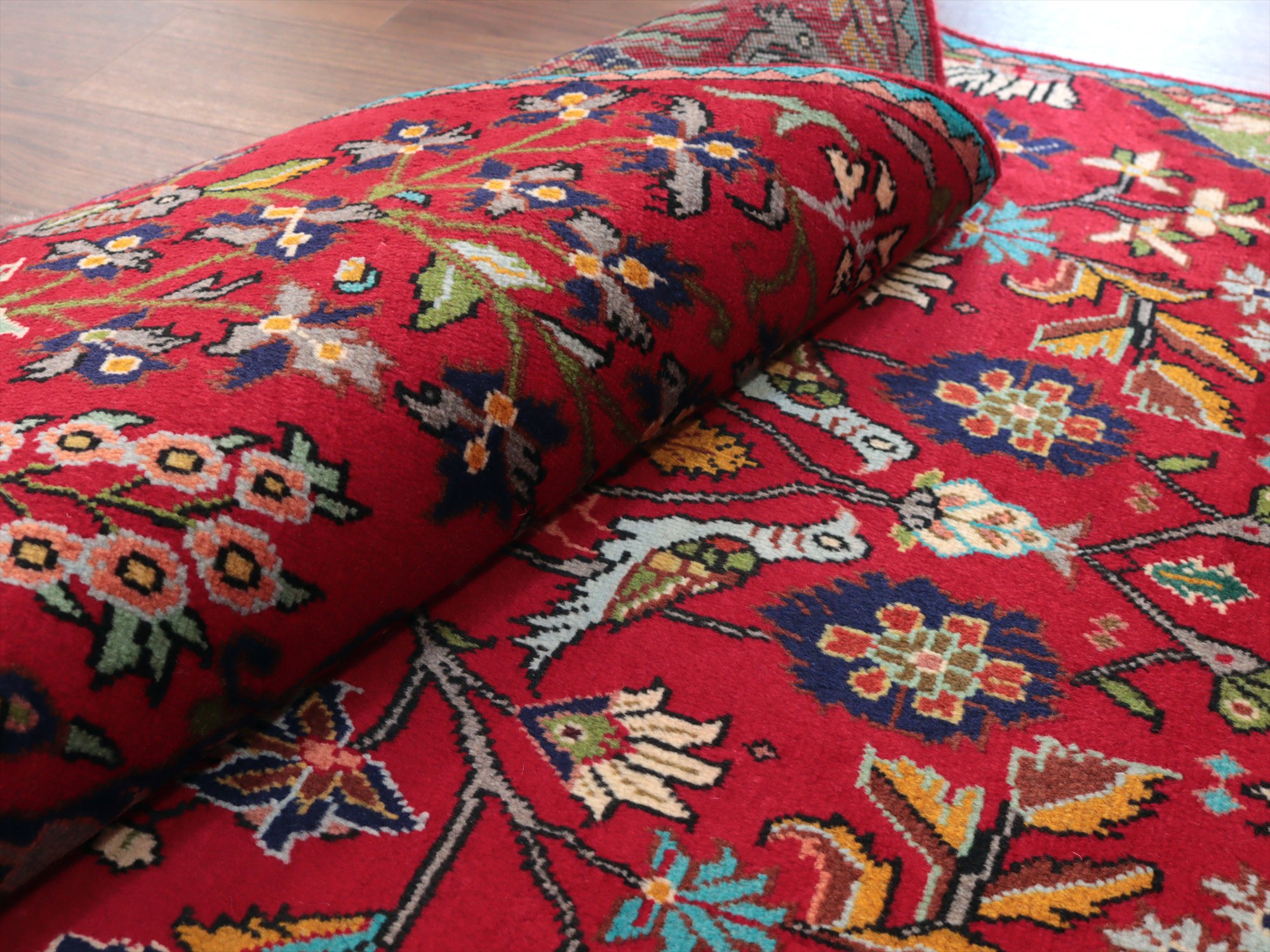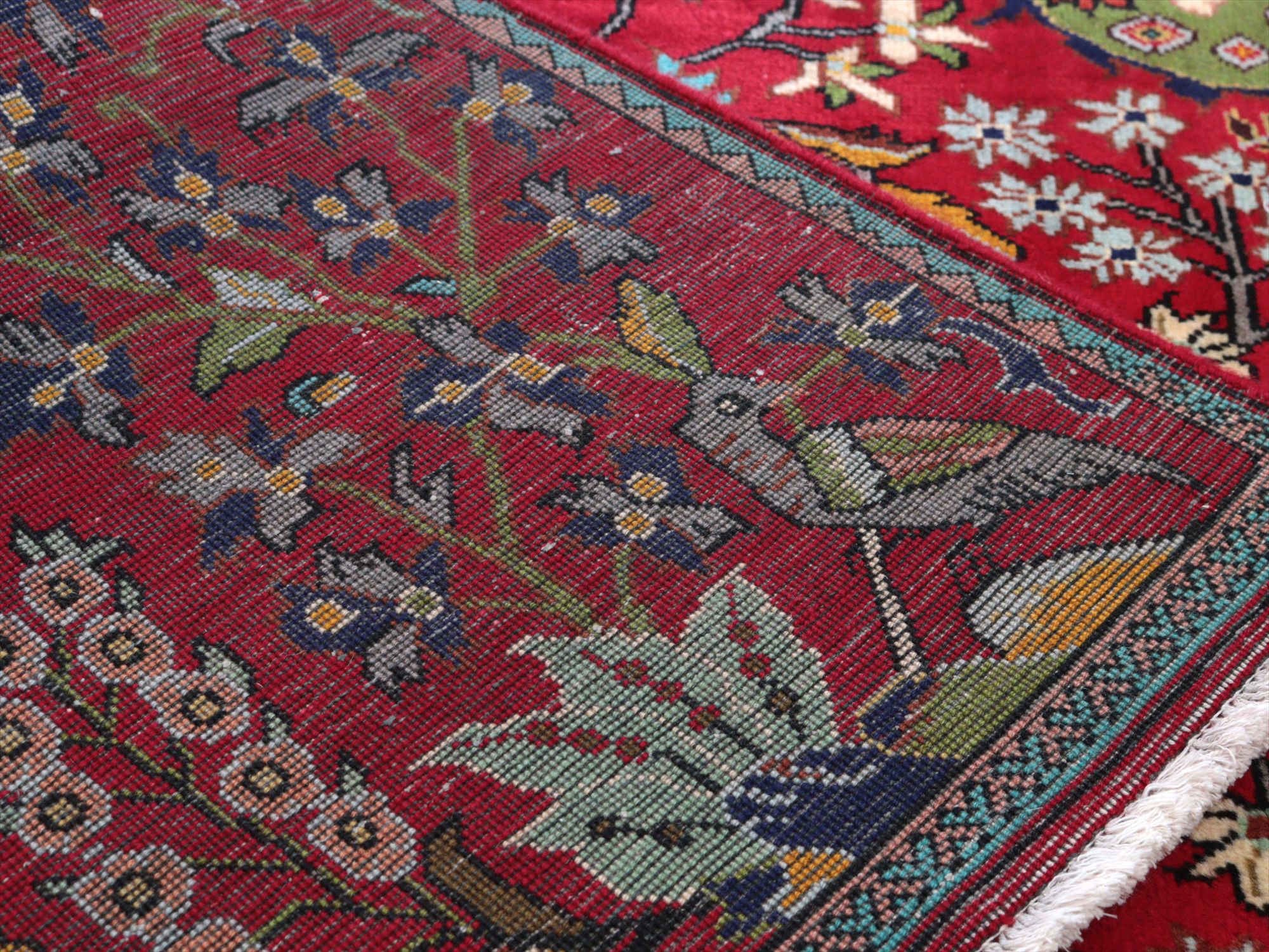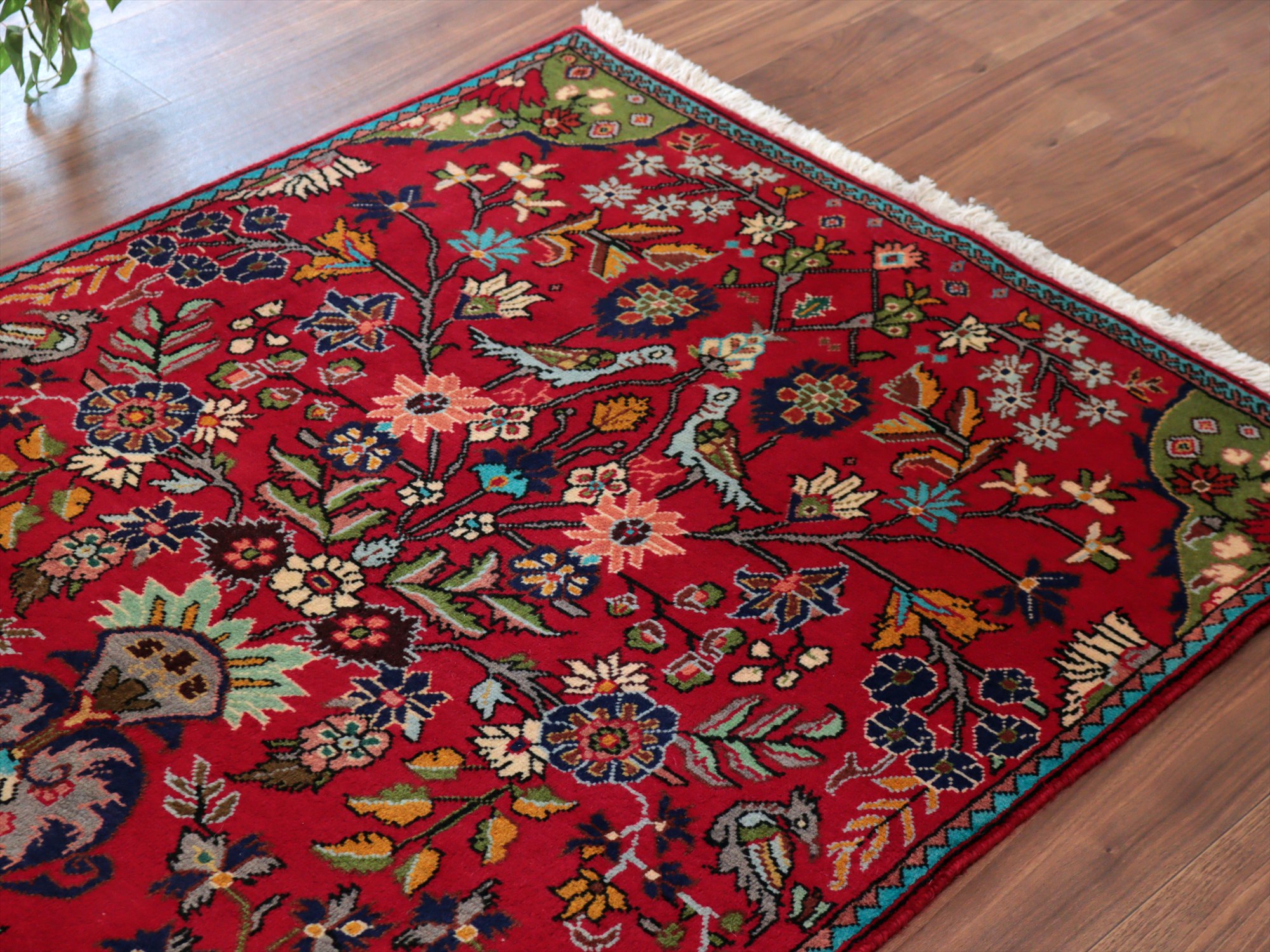 力強い赤が印象的なタブリーズ産の絨毯。鳥や花が、鮮やかな色使いで絨毯いっぱいに織られています。額縁のデザインはグリーンとピンクを使い、比較的細く控えめに表現されているためモチーフが、より一層強調されています。