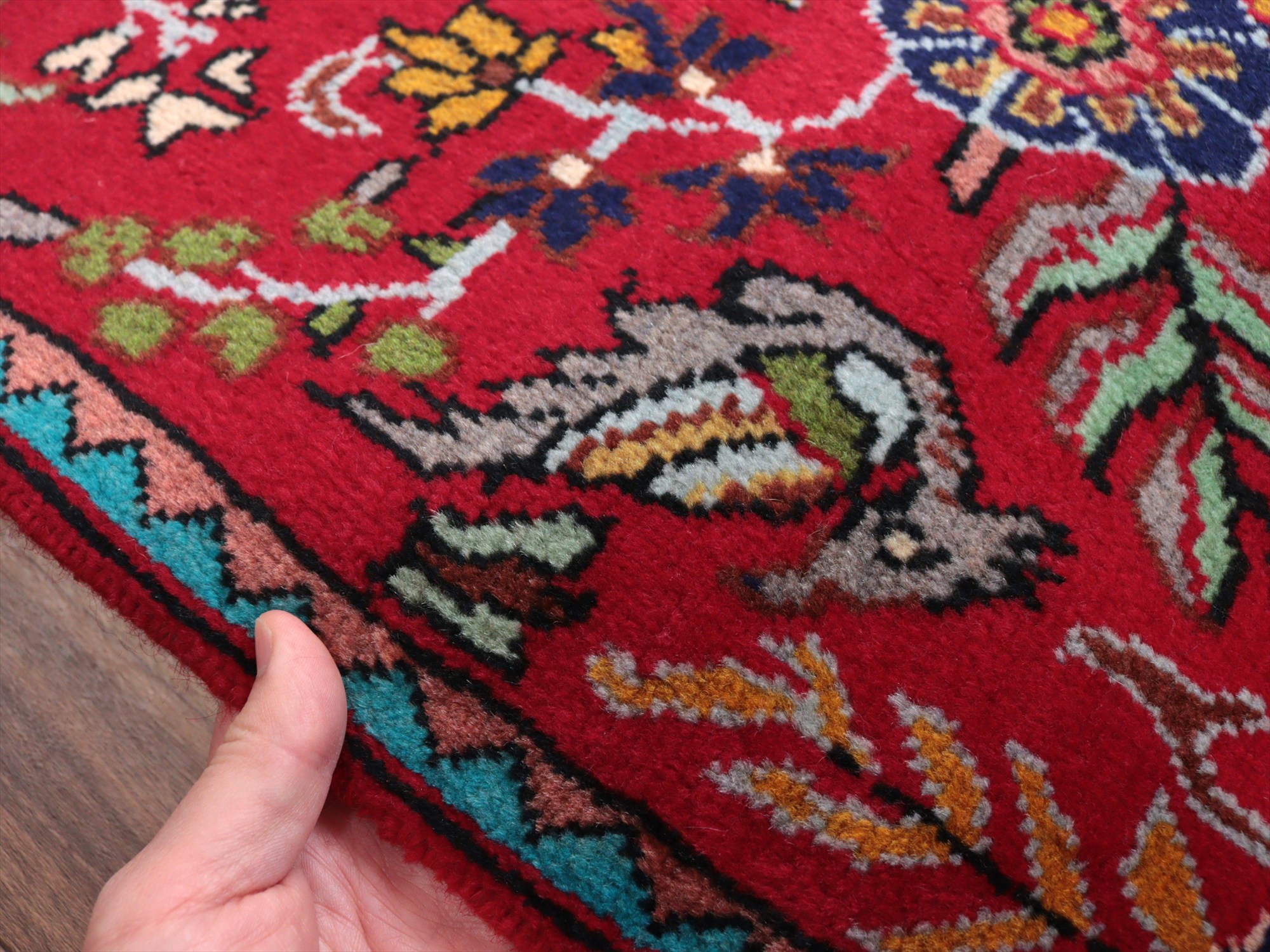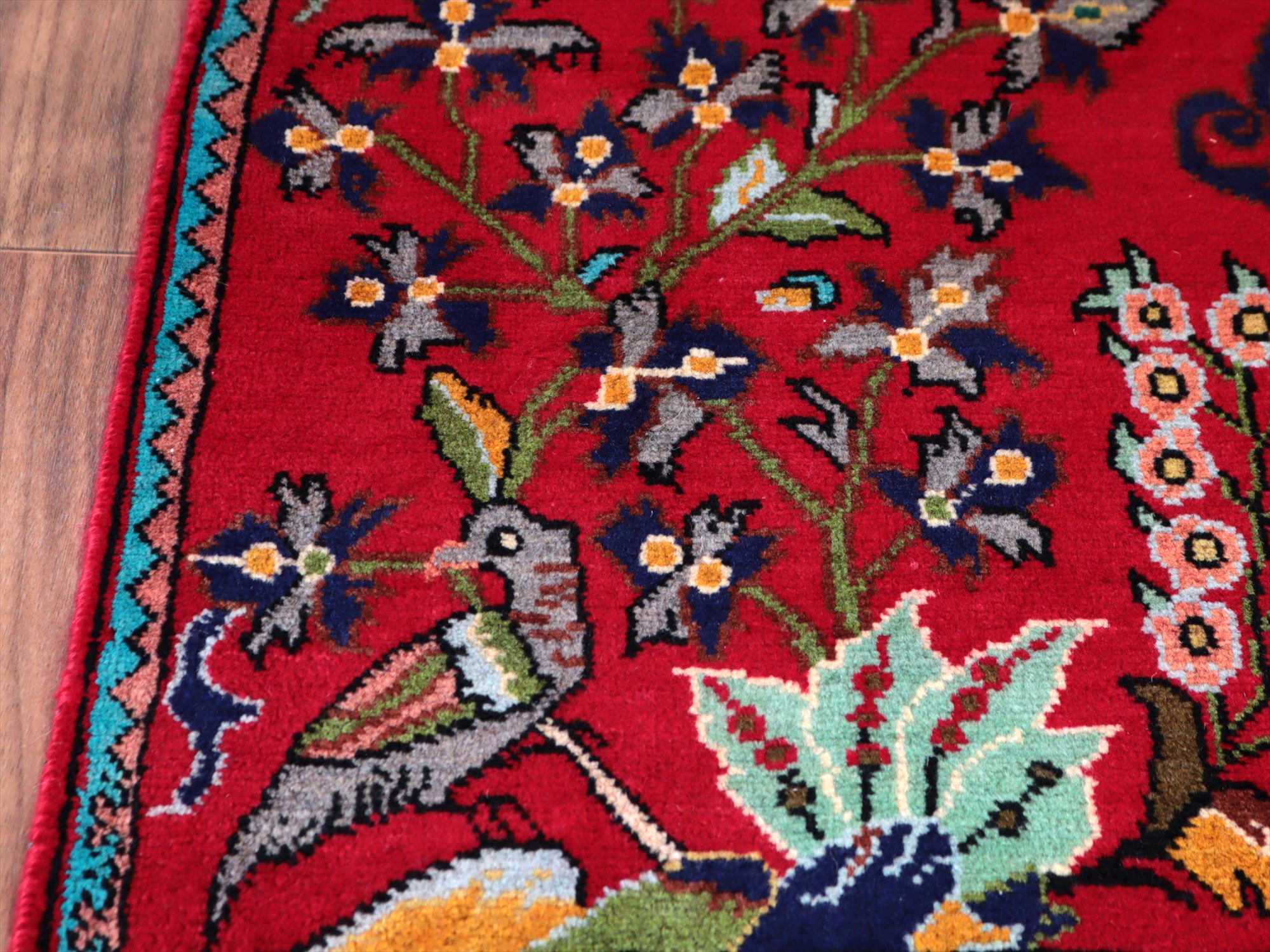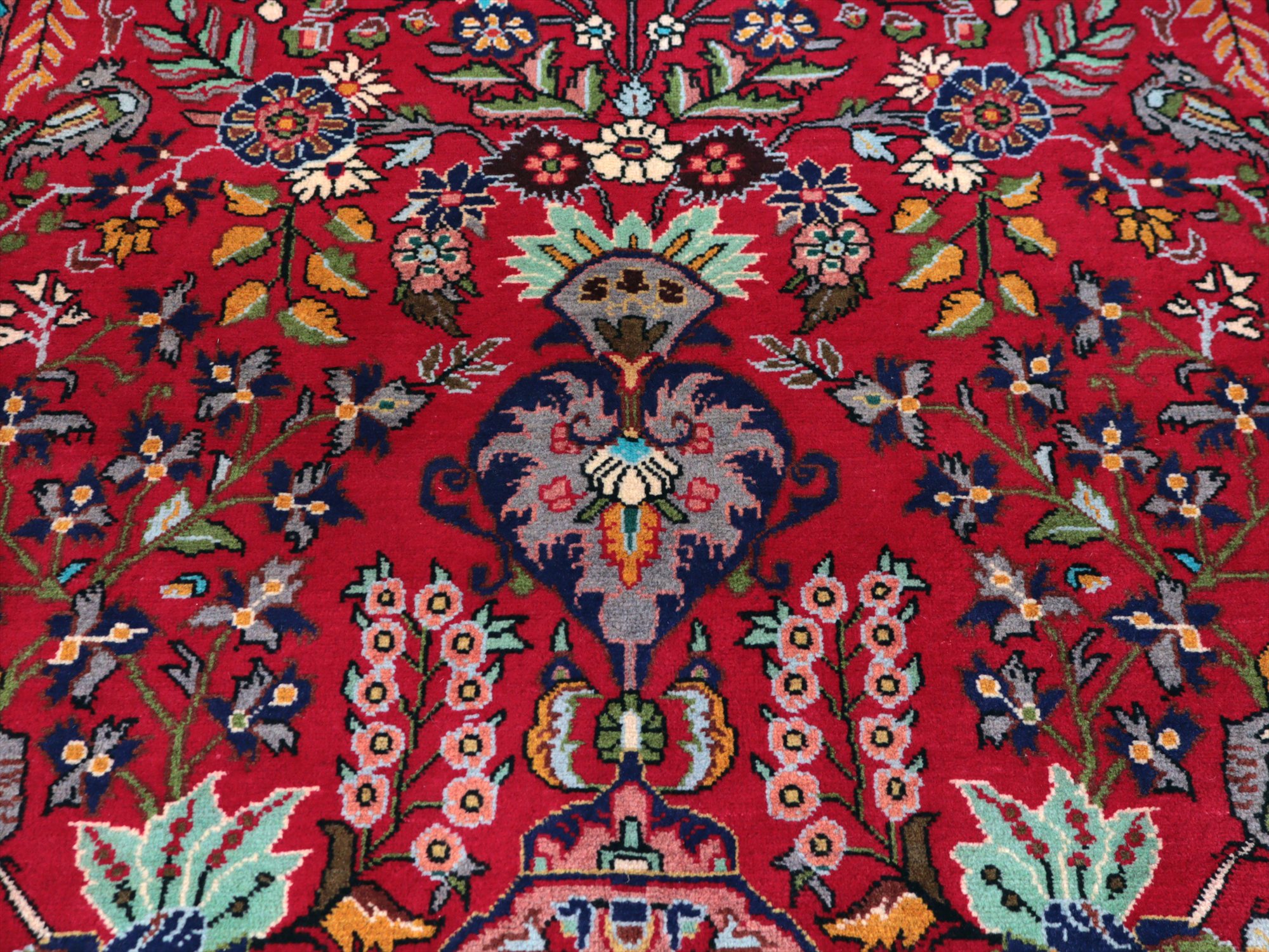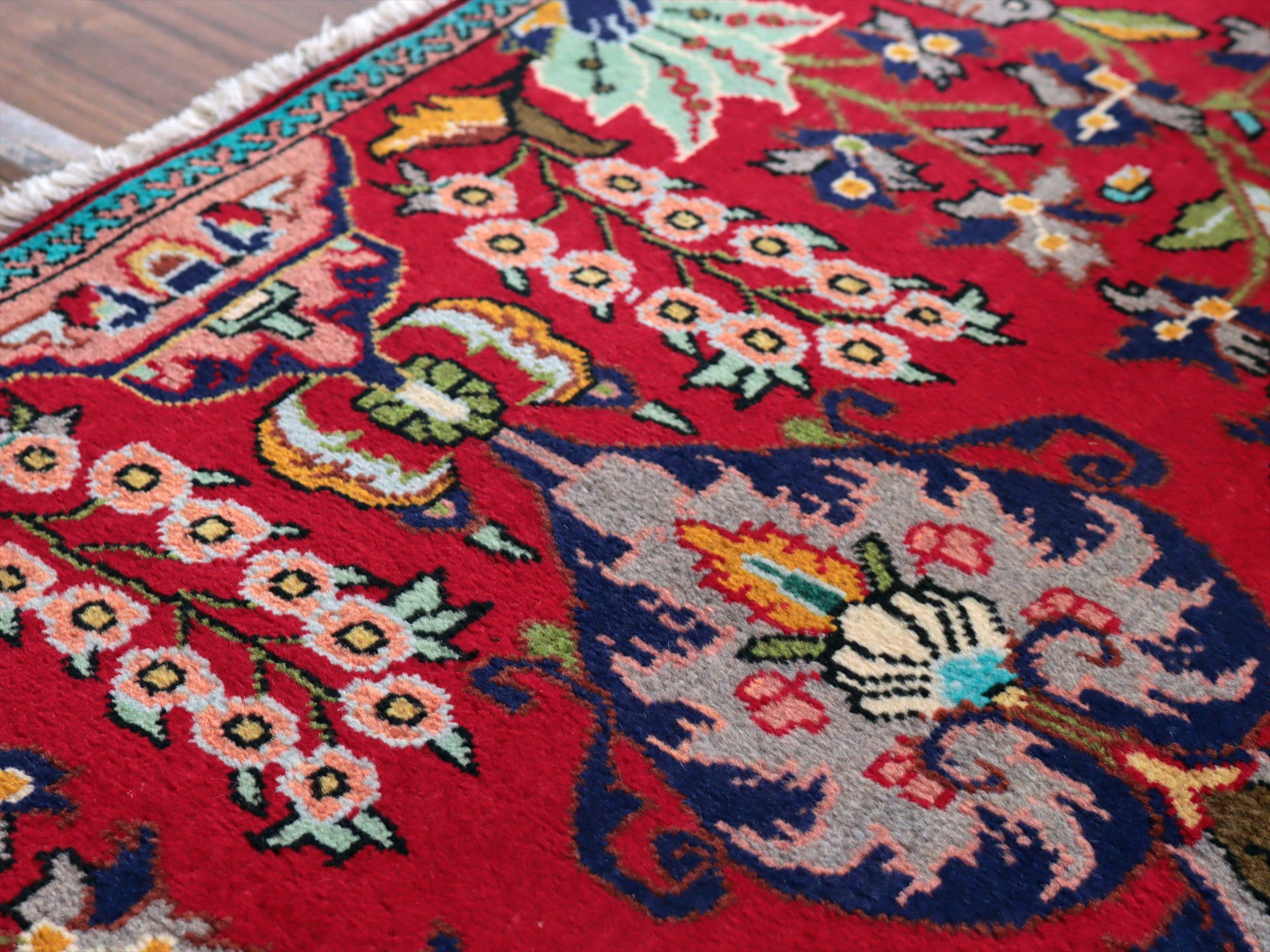 力強い赤が印象的なタブリーズ産の絨毯。鳥や花が、鮮やかな色使いで絨毯いっぱいに織られています。額縁のデザインはグリーンとピンクを使い、比較的細く控えめに表現されているためモチーフが、より一層強調されています。