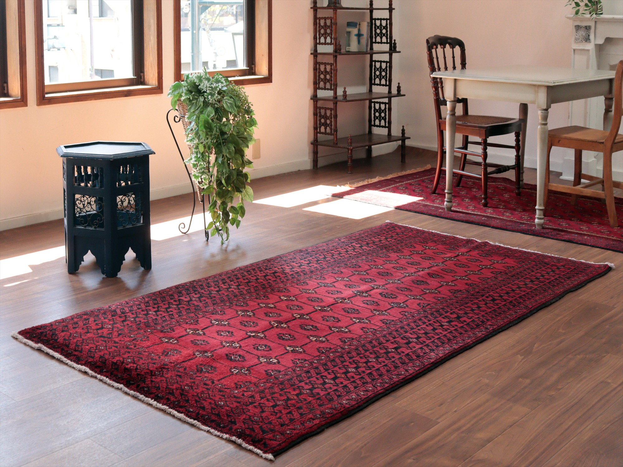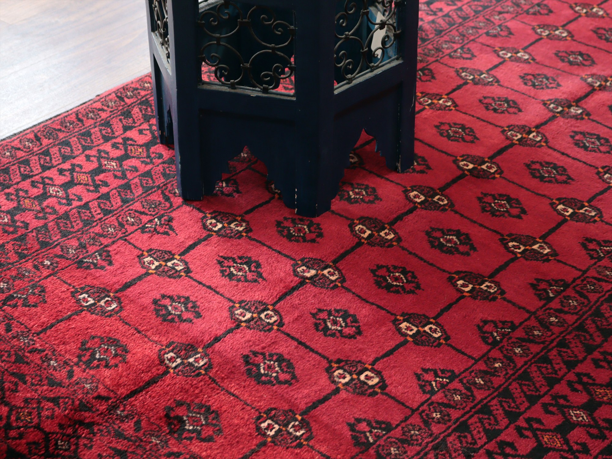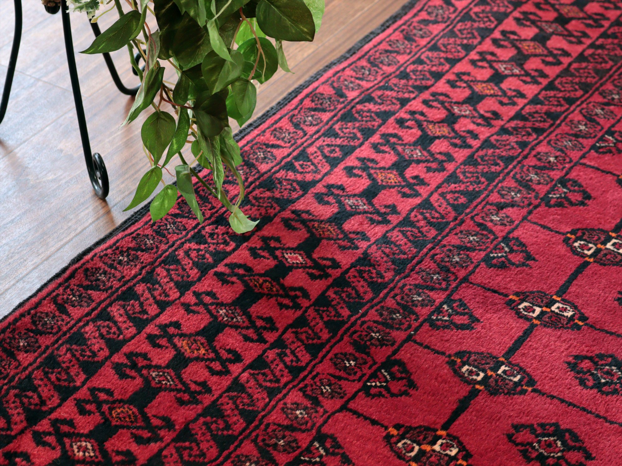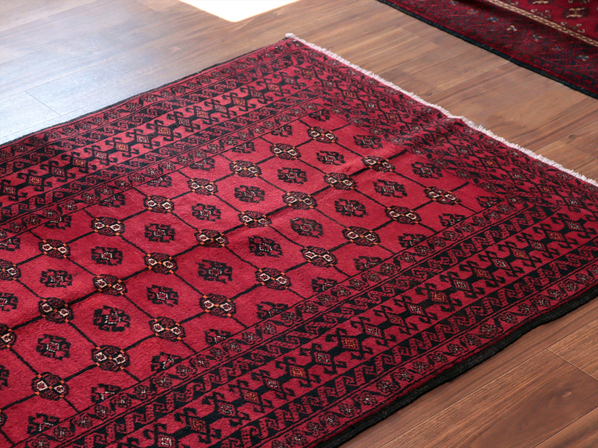 イラン東部からアフガン・パキスタンなどに住むバルーチ族のカーペット。赤地にギュルのモチーフが入ったバルーチの典型的なデザインです。中央のフィールドには、文様が格子状に並ぶように織られていてクラシカルな雰囲気が良く出ています。