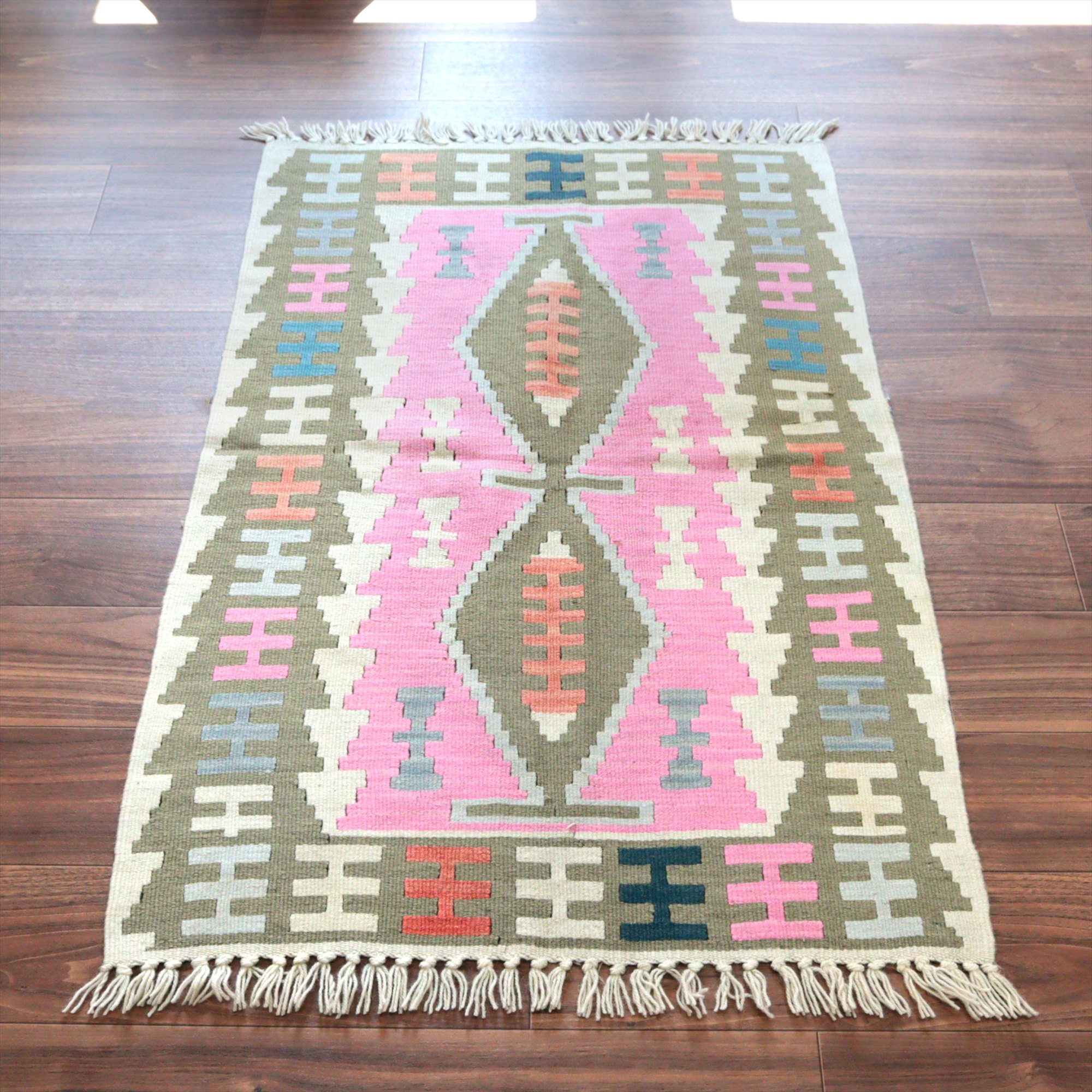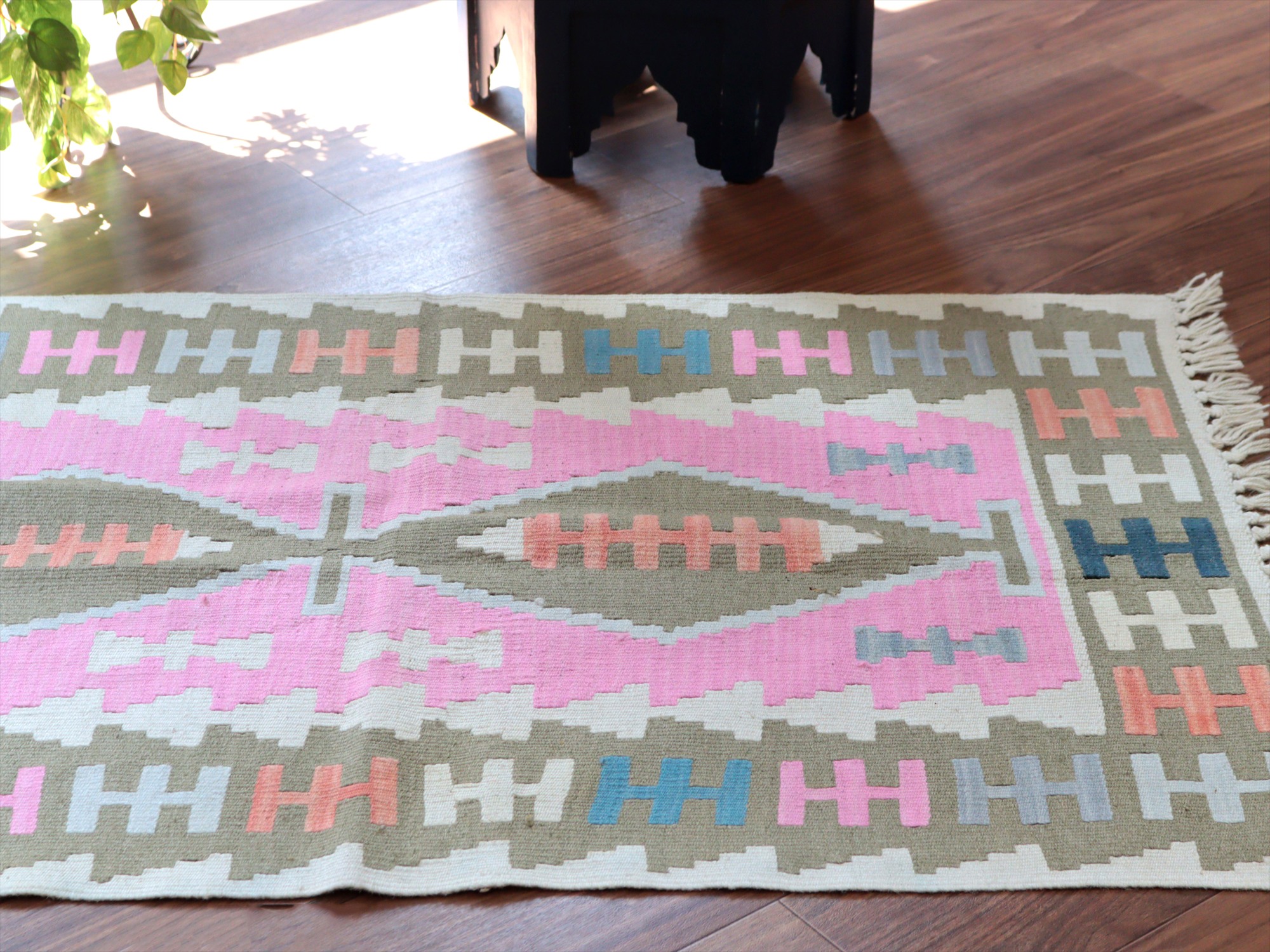 - カイセリ産手織りキリム ピンク121×76cm ベレケットのモチーフ トルコの手織りラグ