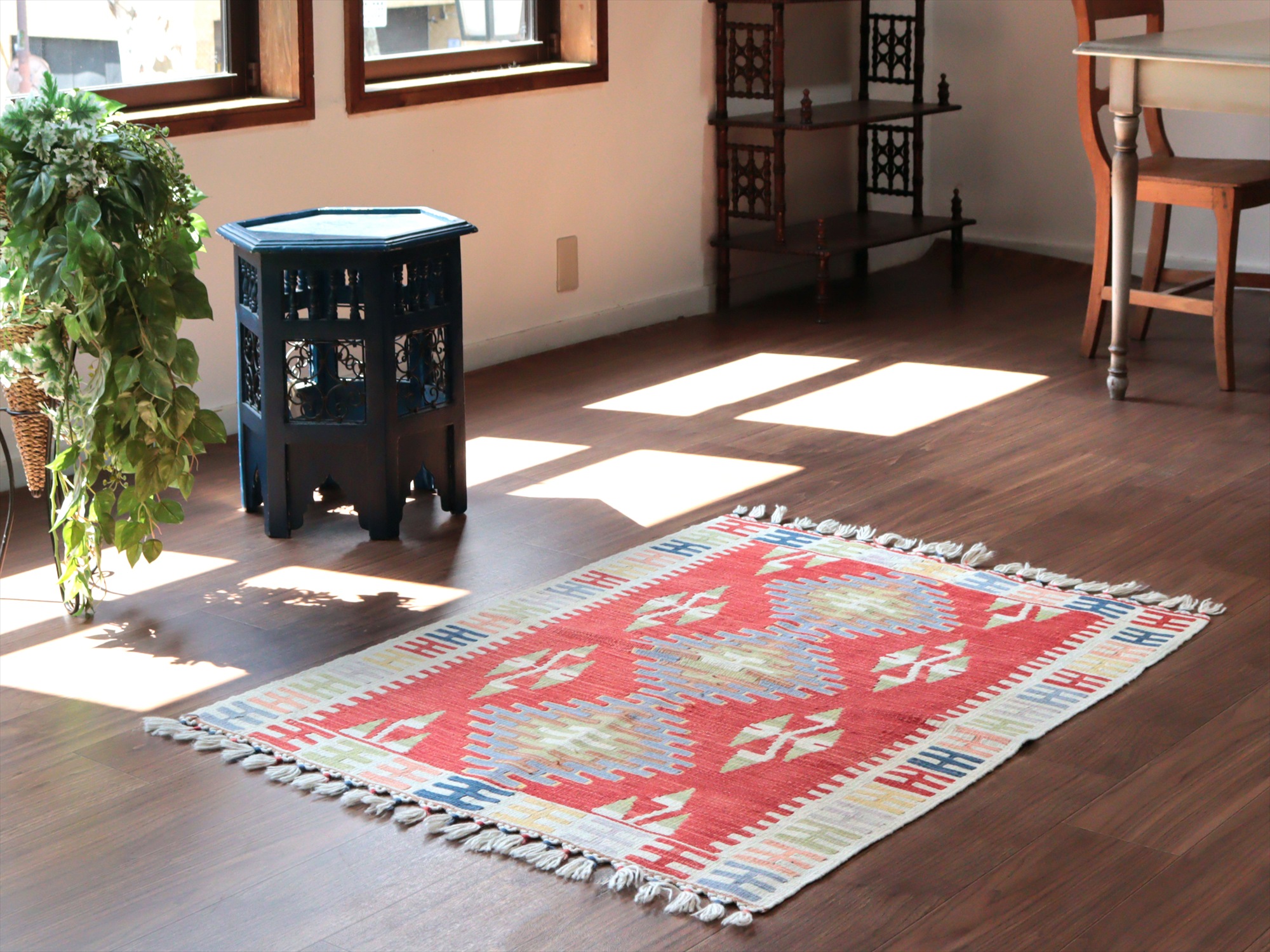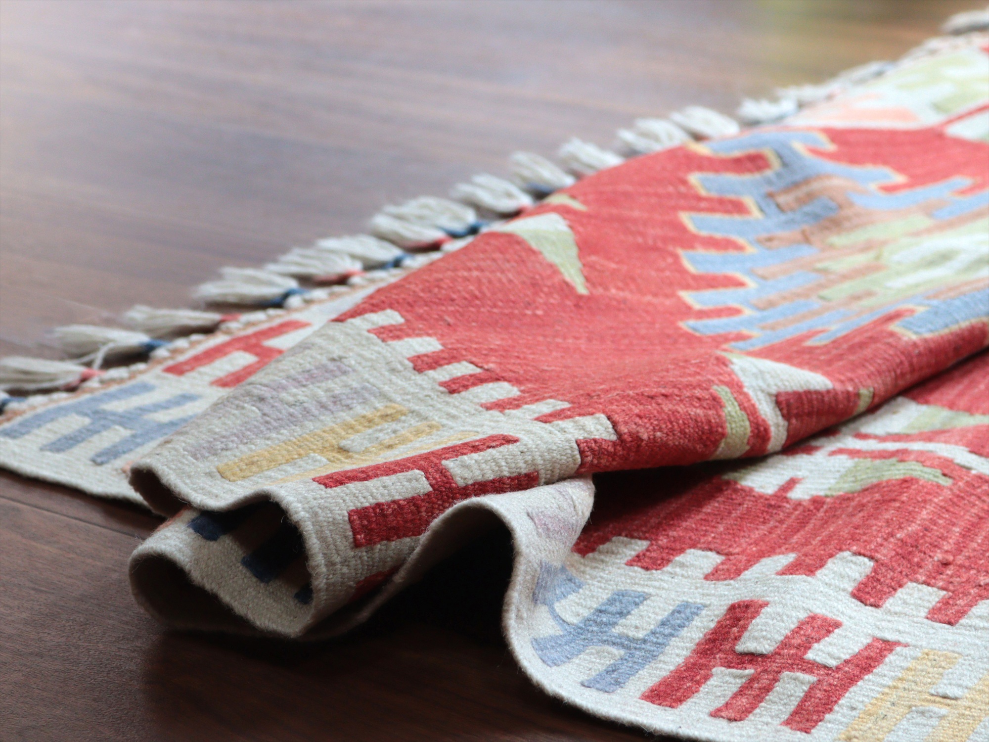 - カイセリ産手織りキリム117×89cm レッド&ベージュ トルコの手織りラグ