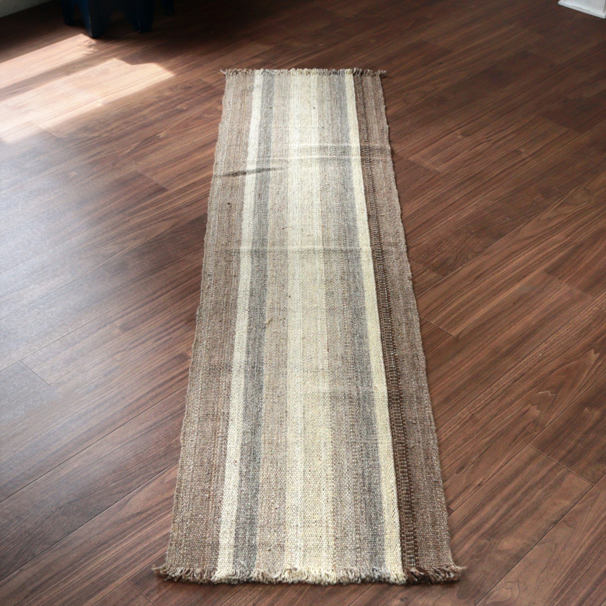 - トルコの手織りキリム カルス194×49cm ブラウン&アイボリー ストライプ